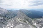 Tam za Triglavom (ki je od tu prav blizu) so se nabirali temni oblaki, da sem že resno razmišljal o begu v dolino. Po sprva ozkem grebenu navzdol in ko sem prišel do odcepa v Mišeljsko dolino, so se črni oblaki že razblinili. Dobro, torej nadaljujem po širokem grebenu preko neizrazitih vrhov Na Nizkem, Mišeljska glava in še nekaj neimenovanih vršičev vse do konca grebena – na Mišeljski konec. Sestopil sem naravnost navzdol na Hribarice, kar je bilo strmo in neprijetno.
