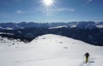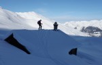 Do vrha smo se udobno povzpeli ob čedalje širših razgledih, žal nas je z vrha hitro pregnal močan veter. Vseeno smo se še zadnjič razgledali po presmučanih vrhovih in vseh neštetih drugih v okolici. Odsmučali smo sprva po grebenu do sedla in od tam na sever, kjer je bilo prav tako le kakšnih 4-5 smučin. Zgoraj je veter ustvaril nekaj mehke klože, nižje se je pod nami odprla dolga dolina polna pršiča. Smučarsko ena lepših tur.
