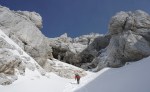 Sneženje je kmalu ponehalo in že čez nekaj minut se je naredil krasen dan. Zavili smo po bližnjici proti grebenu, kjer nas je za robom čakal edini pretežno kopen del vzpona; že preden smo dosegli okno, pa se je začelo zares. Večina jeklenic sicer ni zasutih in so nam bile zelo dobrodošle. Saj razmere za hojo so na splošno dobre, a je bilo marsikje treba previdno zaradi pomanjkanja snega.