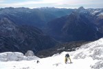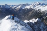 Skoraj še bolj kot to nas je skrbel veter, ki je z grebena prenašal sneg in dal slutiti, da nas bo hudo tepel. K sreči se je začel umirjati in ko smo dosegli greben, ni bilo tako hudo. Greben do vrha se precej vleče, posebno zdaj, ko je nujen bolj previden korak. Hkrati pa sem vedno znova navdušen kako zelo čudovit je tam gor razgled!