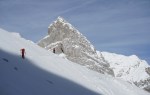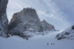 Za ogrevanje po tekaški progi iz Planice, skozi gozd nad koči in polagoma navzgor med čedalje bolj grozečimi stenami. Obiska je bilo po pričakovanju veliko, skoraj vsi so nadaljevali v Ozebnik, kjer so bile menda kar dobre razmere (čeprav tudi gneča v ozkem ozebniku ni zanemarljiv dejavnik). Midva in še dva pred nama pa smo zavili desno proti Kotovemu sedlu. Za robom je močno pihalo in nosilo sneg, na prvi strmini je bila ena sama kloža, vmes malo pomrznjeno, višje pa je zgledalo precej spihano. Zato sva se odločila, da nadaljevanje ni smiselno in sva rajši odsmučala nazaj.