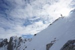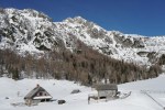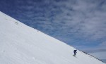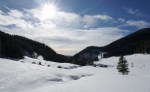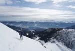 V nedeljo zjutraj sva se z Zoranom odločila za sončno turo in spet je prišel čas za Veliki Draški vrh. Veter naj bi ponehal, a naju je na planini Konjščica pošteno pretresel. Povrhu se je že dopoldne začelo oblačiti – resda so visoki oblaki popestrili nebo, naju je bolj skrbelo, če bo sonce uspelo omehčati zmrznjeno podlago. No, veter je vendarle popustil in tudi sonce naju je grelo skozi redke oblake, vendar sva bila na vrhu prezgodaj. Vprašanje, če je bilo kasneje kaj bolje, midva sva odropotala po preveč trdi strehi, da bi lahko uživala na tem, sicer krasnem smučišču. Pod Studorskim prevalom je bilo bolje, da sva si malo spočila noge.