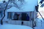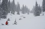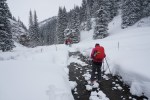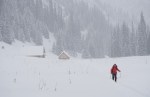 Proti jutru se je pooblačilo in začelo je snežiti, kar se je nadaljevalo še cel dan. To je bil edini dan slabega vremena, a tudi tako je bilo idilično v zasneženi divjini, daleč od vsega sveta. Sredi dneva smo se odpravili na turo in že kmalu sprevideli, da prav daleč ne bomo prišli – na smučeh se nam je namreč ugrezalo tudi do pasu! Tako je eden gazil, ostali pa čakali zadaj in zmrzovali. Pet nas je vseeno vztrajalo in smo se prebili do roba gozda, kjer smo na varnem mestu obrnili.