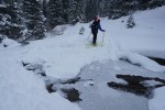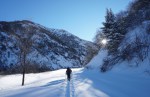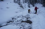 V koči smo se na kratko pogreli, nato pa smo se štirje odpravili nazaj ven – tokrat navzdol. Ves čas nas je skrbel povratek v dolino, zato smo šli preverit, če ne bo bolje s smučmi. Saj izkušnja s konji je bila res zanimiva, a smo imeli kar dovolj za nekaj časa. Na spustu smo si tako ogledali kje smo prejšnji dan sploh jahali in ugotovili, da bo tudi povratek v dolino avantura zase. Pot se namreč ves čas vije ob potoku in ga velikokrat prečka, kar je na konju bistveno lažje kot na smučeh. Na tej ogledni turi smo zato iskali prehode in utrjevali snežne mostove, kar nam je kasneje precej olajšalo delo. Zaključili smo pri neki osamljeni koči nižje v dolini in se povzpeli nazaj. Tri ure dobre in koristne rekreacije v slabem vremenu.