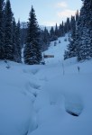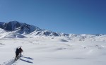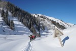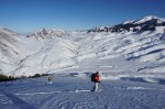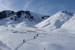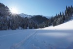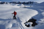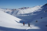 Zbudili smo se v še en jasen in zelo mrzel dan. Na turo smo se odpravili šele, ko je sonce obsijalo kočo in kljub nizki temperaturi nam je bilo kmalu povsem prijetno. Odpravili smo se v stransko dolino in od tam po južnem pobočju navzgor. Snega je bilo na tej strani občutno manj, saj je bila stara podlaga že predelana in smo brez težav prigazili do sedla. Na soncu je bilo že prav prijetno toplo in smo si privoščili dolg postanek z razgledom na okoliške gore. Tu bi imeli kaj početi v boljših razmerah, žal je bilo snega preveč in nevarnost plazov velika. Tokrat smo nadaljevali po grebenu dokler je šlo v čedalje bolj globokem snegu. Zgoraj smo imeli od smučanja bolj malo, nižje po tistem južnem pobočju pa je šlo prav super vse nazaj do ledeno mrzle doline. Lepa tura v neokrnjeni zimski divjini.