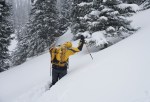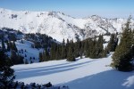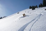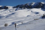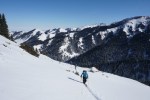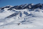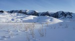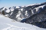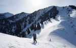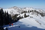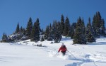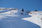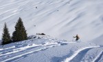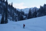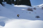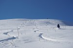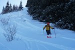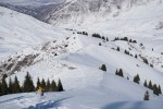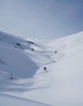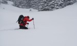 Odpravili smo se na greben, ki se je dvigal južno od naše jurte in s katerega so se kazale številne možnosti spustov. Verjetno ne rabim posebej poudarjati, da v celem tednu nismo videli drugih ljudi v gorah. To je pomenilo, da smo vsi prišli na vrsto za gaženje. Sploh na severnih straneh je bilo snega bistveno več kot je izgledalo od daleč. Pri tako nizkih temperaturah in vlagi je bil sneg zelo suh, tako da se nam je tudi na smučeh globoko prediralo.