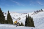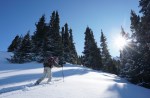 Počasi smo le prigazili na razgledni vrh Konus (2641 m), kjer je bilo na soncu prav prijetno za posedanje in ogledovanje širne okolice. Zaradi nevarnosti plazov smo se spustili navzdol po enem od stranskih grebenov, ki je precej strm in poraščen s smrekovim gozdom. Ni nam šlo najbolje, saj nismo še nikoli smučali v tako globokem in puhastem pršiču, kjer je bila edina učinkovita tehnika hitrost in čim manj zavijanja.