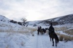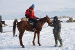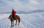 Dostop do koče v soteski (Ketmen gorge) smo opravili na konjih. Menda je predaleč, da bi šli peš, s konji pa so sprva napovedali 2 uri, kar so v Ketmenu popravili na 3 ure zaradi globokega snega. Nam se je to zdelo fino, tri ure jahanja bo zanimiva izkušnja. Zapeljali smo se na farmo, kjer so najprej naložili prtljago, potem smo dobili vsak svojega konja. Ne pa tudi navodil za uporabo! Kazaki pač jezdijo že od malih nog, nam je bilo to vse novo. Tako je na začetku trajalo nekaj časa, da smo se navadili – in se predvsem sprijaznili, da bodo konji vodili nas in ne obratno. Sploh v začetnem delu po ravnini je šel vsak konj po svoje, občasno se je kakšen odločil za tek ali celo galop, mi smo se lahko samo držali in upali na najboljše… Smeha seveda ni manjkalo.
