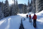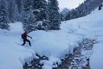 Običajno si želimo, da bi takšni čarobni trenutki trajali večno, a v resnici je bolje, da minejo in se zapišejo v trajen spomin. Glavni del naše poti se je namreč šele dobro začel in čakal nas je dolg vzpon v čedalje bolj globokem snegu; kolikokrat smo prečkali potok nisem niti štel. Konji so tu k sreči hodili lepo počasi in v vrsti, a so se tudi čedalje bolj mučili, saj se jim je udiralo in so se spotikali, da nas je resno skrbelo kako bomo zmogli. Potem je Ivi in nato še Maretu popustilo sedlo, k sreči sta oba padla na mehko v globok sneg. Vse skupaj ni bilo nič več zabavno.