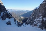 S škrbine sem oddrsal zgornjo ožino, nato se odpre široko smučišče. Žal je bilo že precej zvoženo in razrito, a večinoma dokaj mehko, da je šlo čisto solidno. Tudi kamenja še zelo malo. Spodaj sem se plazovini izognil levo skozi gozd, nato pa po hudourniški strugi udoben smuk vse do planine. Ob robu gozda sem z nekaj trme prišel do ceste z enim snemanjem smuči in po še vedno ledeni cesti do avta. Sploh ne slabo glede na letošnjo sušno zimo. Če bo prihodnji teden padlo še kaj snega, bi znalo biti že prav super.