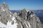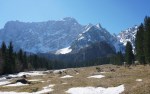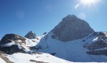 Na Klanški škrbini sem prestopil na sončno stran, kjer je že dovolj trave za posedanje. Prav posebne motivacije za nadaljevanje danes nisem imel pa tudi tam pod Mangartom vsaj od daleč ni bilo videti posebno dobrih razmer. Zato sem si privoščil dolg odmor in se počasi odpravil nazaj.