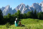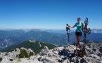 S sedla se nato nadaljuje zelo udobna pot skozi senčen macesnov gozd in končno pripelje na bolj strma odprta pobočja. Do vrha je pot potem toliko bolj zoprna po krušljivih skalah. Z Višarij je bilo kar nekaj obiska, a razgledov je bilo ta dan dovolj za vse.