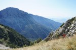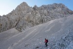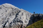 Kratek čas po markirani poti in po kolovozu, ki se izteče v strmem brezpotnem gozdu. Sledi po mojem najbolj naporen in orientacijsko zahteven del ture. Saj ne vem, ali sem prejšnjič našel lepše prehode, ali pa sem le pozabil kako je bilo … V vsakem primeru sva v prečenju proti levi sčasoma prišla do grape, kjer se je končno odprl pogled proti Malim vratcem, ki sva jih dosegla po strmih travah pod razgibano južno steno Kočne. S škrbine je kratek in strm vzpon na ta vršič, s katerega se odpre pogled na JZ greben, ki se pne visoko navzgor.