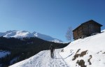 Spet smo se zapeljali v sosednjo dolino Val Medel in parkirali v majhni vasici Mutschnengia (1407 m), z Davidom na smučeh oz. splitboardu, Dorian in Neja pa s krplji. Snega je bilo na sončnih travnikih nad vasjo občutno manj kot pred tremi dnevi, k sreči ga je bilo po cesti še dovolj. Povzpeli smo se do grebena, nato sva z Davidom nadaljevala po gozdni cesti na severno stran, kjer so bile razmere in vzdušje povsem drugačne.