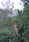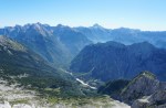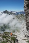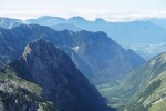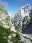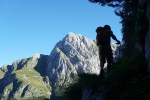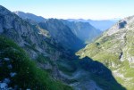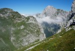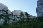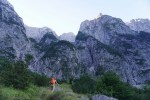 Po tem strmem vzponu sva se znašla v pragozdu in se prebila skozenj v postopno manj zaraščen svet pod nebotičnimi stenami, ki se dvigajo na vseh straneh. Po lepi (in senčni!) dolinici sva dosegla sedlo Čez Brežice, s katerega se odpre pogled v dolino Bala nad Bavšico. Nadaljevala sva spet bolj strmo po občasno zelo krušljivih pobočjih do škrbine Za gradom, kjer sva zapustila markirano pot.