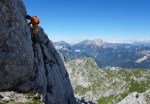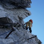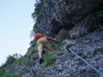 Še med hojo po dnu doline sva občudovala nedostopne stene vse naokoli, višje pot prečka potok in se v kratkem vzponu nameni naravnost proti temačni steni. Od daleč sem z očmi iskal prehode, na koncu se je izkazalo, da je pot speljana kar naravnost navzgor! Prav neverjetno, kako strm je vzpon, povrhu tja najbrž nikoli ne posije sonce, da so skale vedno vlažne – in še nekateri klini so ukrivljeni. Skratka, gotovo gre za eno zahtevnejših zavarovanih poti pri nas.