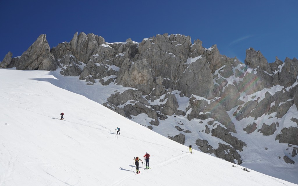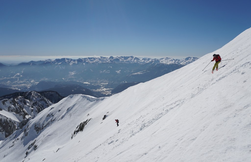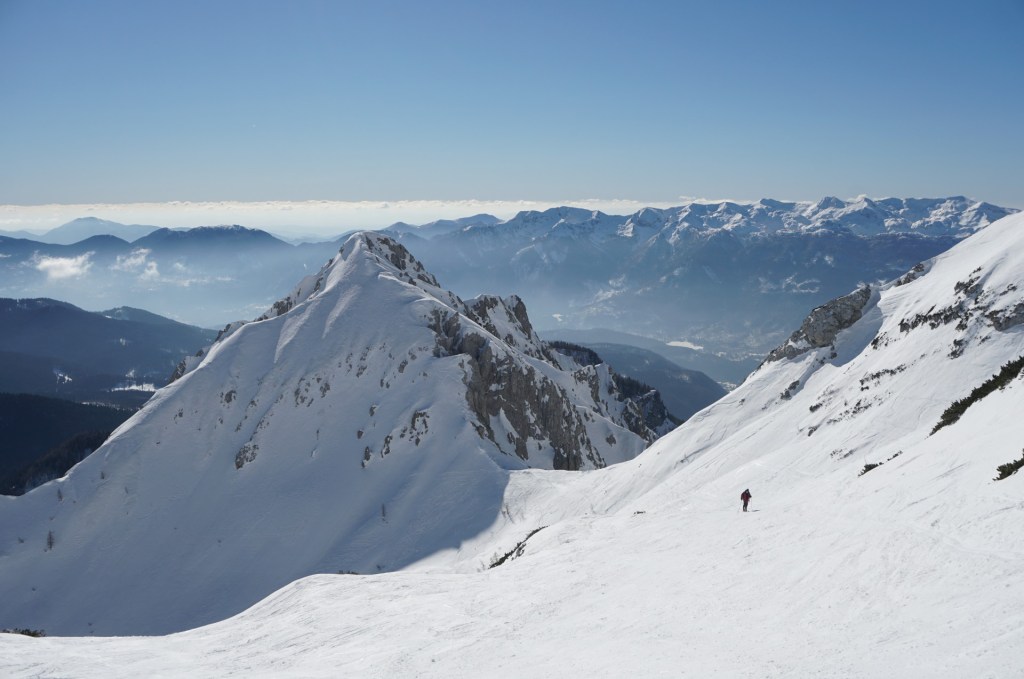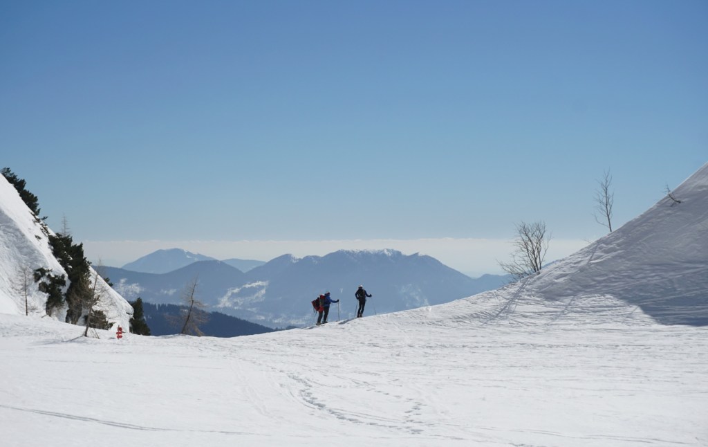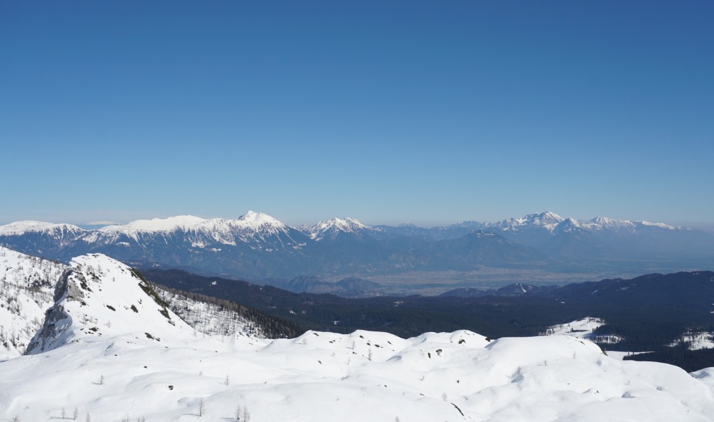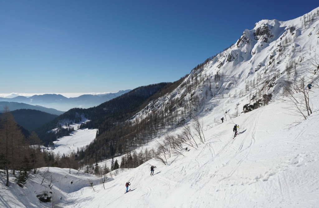 Tudi mi smo v pestri zasedbi prispevali h gneči, na pot smo se odpravili kar zgodaj v čudovitem in končno spet bolj svežem jutru. Po standardno zoprni prečki skozi gozd, nato prvi spust v trdem a lepo smučljivem snegu do planine Konjščica. Do Studorskega prevala je šlo brez težav, naprej je bilo pomrznjeno in tudi s srenači ne najlažje. Nekateri so šli raje z derezami. Na vrhu smo našli košček trave in kar nekaj časa uživali v razgledih, čakajoč, da bi sonce zmehčalo razrito in pomrznjeno streho. Čeprav je veter ponehal in je sonce lepo grelo, je bilo zgornjih 100 metrov povsem trdo, nato smo prečili v desno, kjer je bila podlaga bolj gladka in čedalje bolj mehka, tako da smo že kmalu uživali v spustu vse do Jezerc.