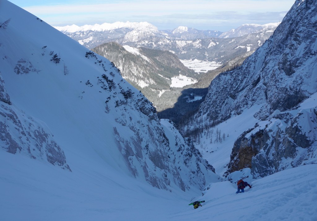 Pod Žrelom so ogromne plazovine, zato smo se usmerili proti lovski poti. Tam smo se odločili, da nadaljujemo v strašljivo sotesko in prečimo čez rob do lovske, s čimer bi se izognili začetnemu skoku. Spodaj čez ledene plazovine, prekrite z 10 cm pršiča, že kmalu nato je šlo lažje, pred nami pa so trije zgazili grapo naravnost navzgor. Zato smo nadaljevali mimo prehoda desno proti lovski in precej visoko prišli na smučeh. Ko je vendarle postalo bolj strmo, smo prestavili smuči na hrbet in po gazi predhodnikov brez težav naprej. Višje je en zoprn skok, kjer sem pred leti že obračal (takrat je bil kopen, tokrat leden), in nad njim še nekaj strmega vzpona v dokaj trdem snegu.