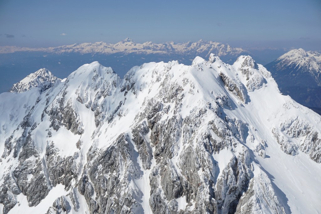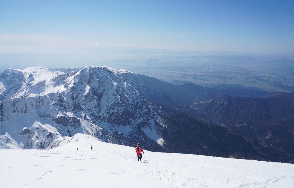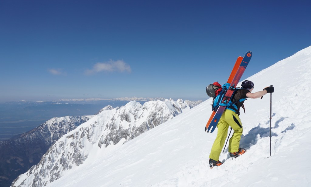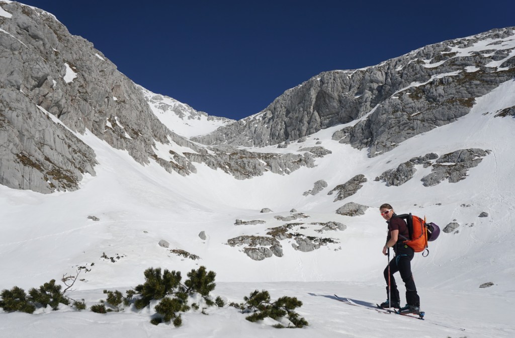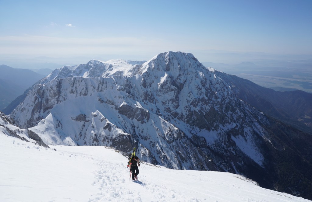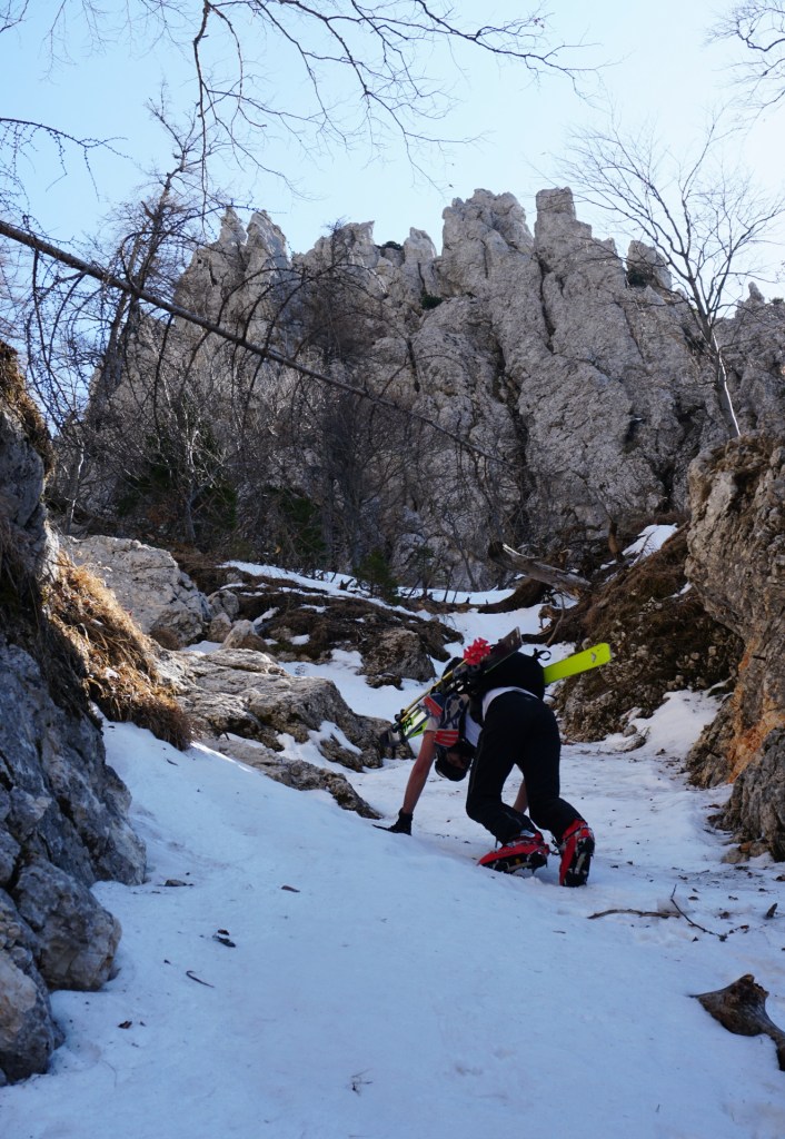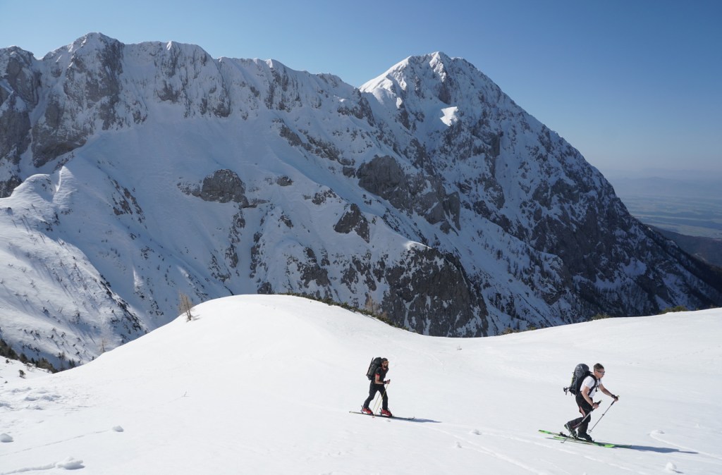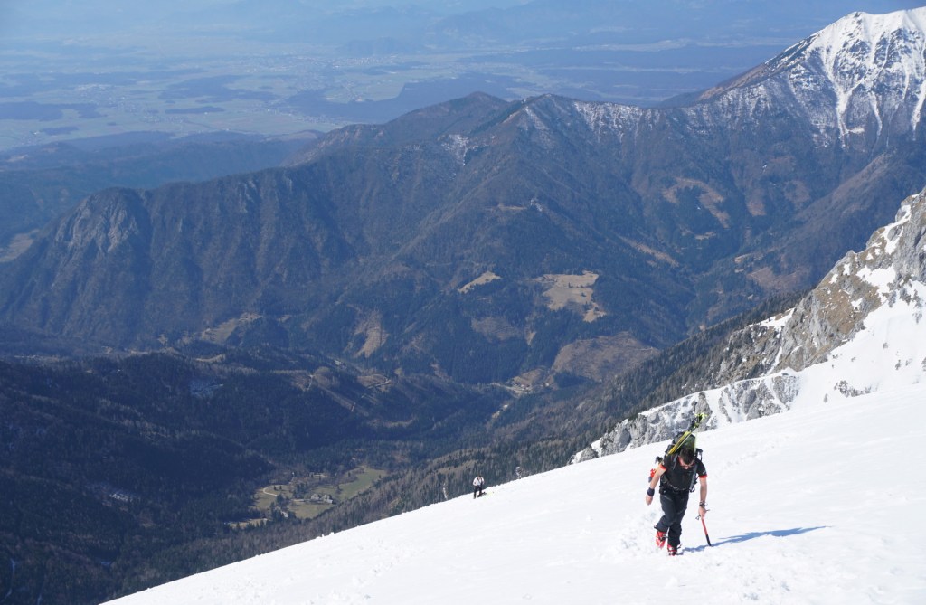 Takoj nad Taško smo ponovno zamenjali obutev, tokrat za smuči, in nadaljevali skozi lepo zasneženo dolino pod Kokrskim sedlom. Že pred sedlom smo zavili čez strm prehod v levo (ki smo ga brez težav zmogli na smučeh) do Spodnjih jam. Tam nas je sonce že pošteno ogrelo in tudi sneg je bil primerno zmehčan. Pod prečko smo kljub temu spet nadeli dereze do strehe in nadaljevali kar peš do vrha.