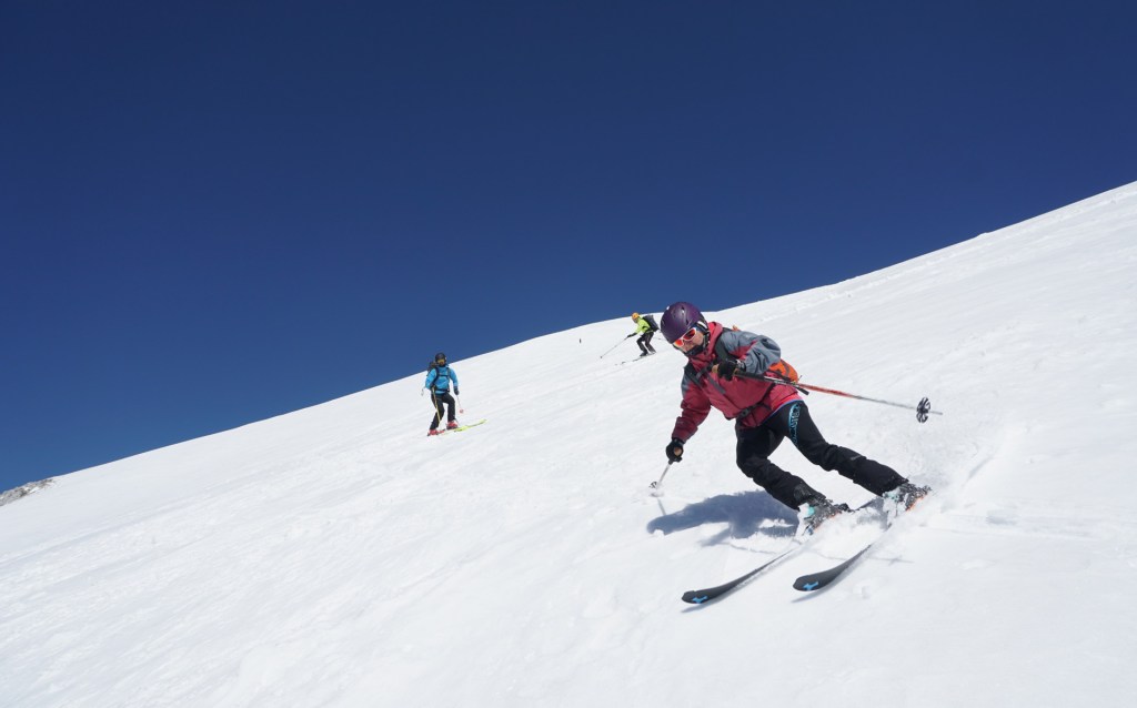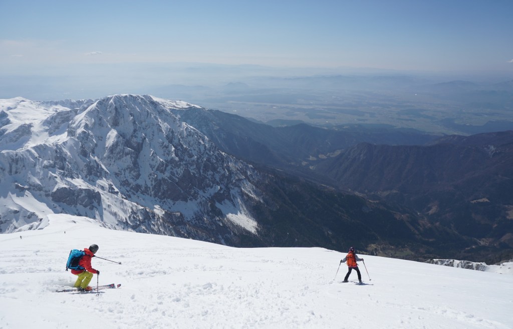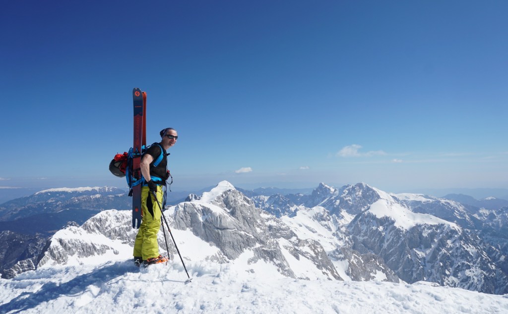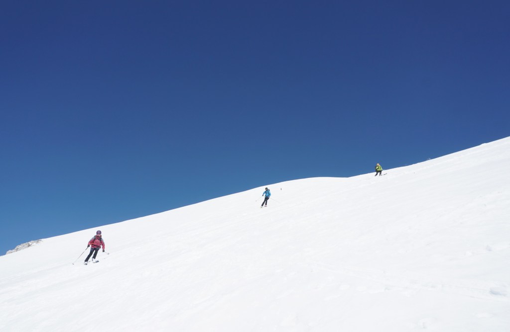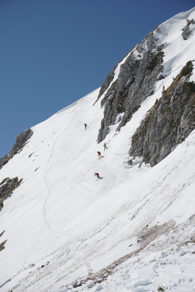 Začuda nismo srečali nikogar in tudi vrh je bil na ta sijoč dan le naš. Šele ko smo odsmučali, jih je za nami prišla še peščica. Po vročem vzponu nas je na vrhu sicer hladil veter, zato smo se dokaj hitro napravili za smuko. Okoli 11:30 smo odsmučali, čas je bil kar pravi. Enakomerna in dolga streha je pri vzponu precej dolgovezna – pri smučanju pa je ravno to največja nagrada dolgega vzpona. Sneg je bil že lepo zmehčan, tako da smo kljub strahospoštovanju lahko uživali. Streha se namreč konča nad prepadom, danes je bila tudi prečka do Spodnjih jam lepo smučljiva – če ne bi bilo spodaj prepada, bi rekel celo uživaška. Tudi nižje je šlo super, čeprav je ponekod novi sneg zaviral. Smučarski tereni so namreč zahodno pod Kokrskim sedlom po mojem lepši kot proti Bistrici. Seveda smo s smuko zaključili nad Taško.