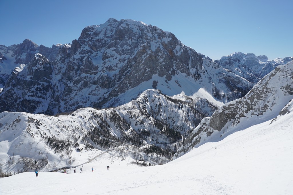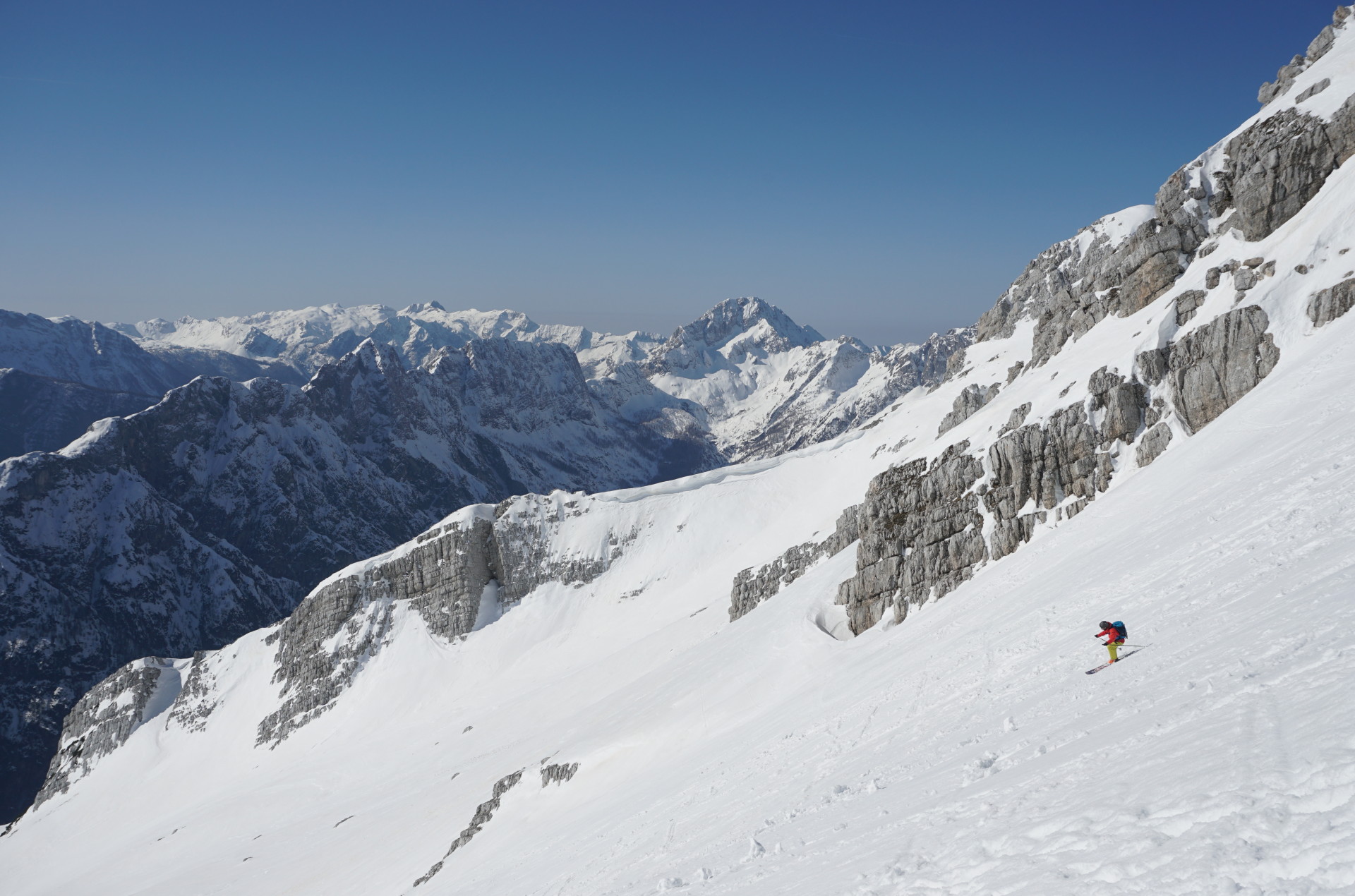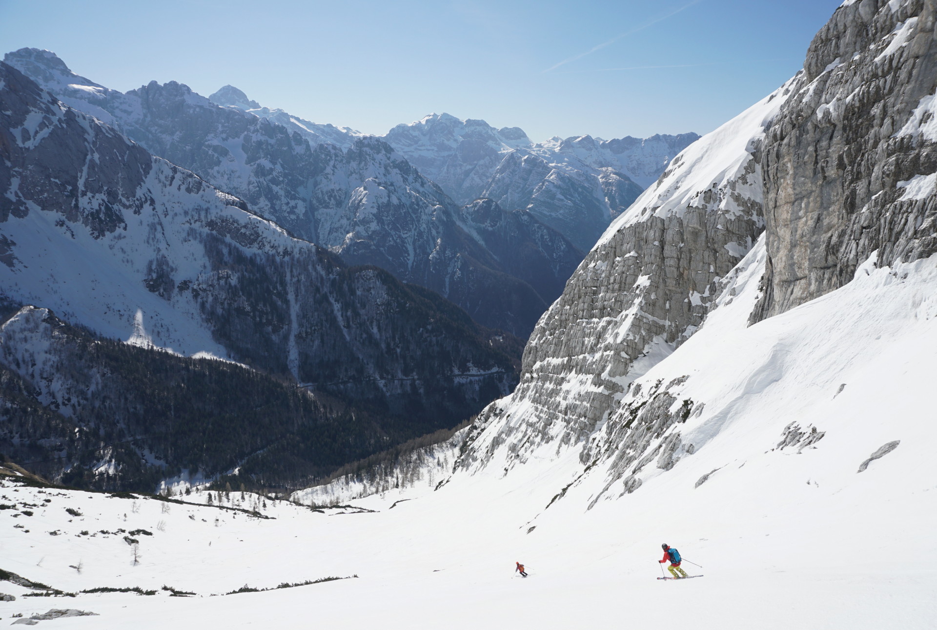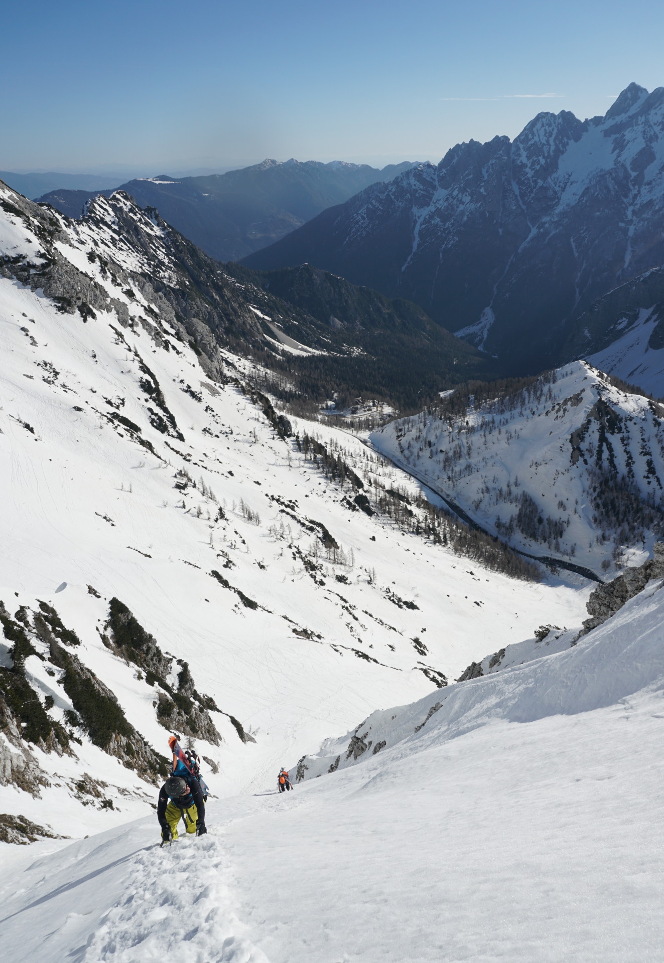 Danes pa smo se v toplem dnevu namenili v najbližjo, Butinarjevo grapo, kjer je bilo že zjutraj obupno vroče, a po udobnih stopnicah sploh ne naporno. Na Grebencu smo šli ponovno na smuči in prečili po spodnji smeri na Veliko Mojstrovko. Po grebenu smo šli kratek čas proti Srednji in ob 10h odsmučali naravnost navzdol po zgornjih širjavah in naprej pod Suhim vrhom v Drevesnico. Smuka je bila zelo uživaška, dolga in razgledna. Nadaljevali smo ves čas v isti smeri skoraj 1000 metrov nižje do potoka. Spodaj je bil sneg sicer že precej južen, pomanjkanja pa še ni čutiti – čeprav smo bili na primorski strani. Za konec nas je seveda čakal vzpon preko planine in nazaj na Vršič. Zaključek ture z vzponom do avta je nekako “nenaraven”, pa kaj bi to na tak lep dan!