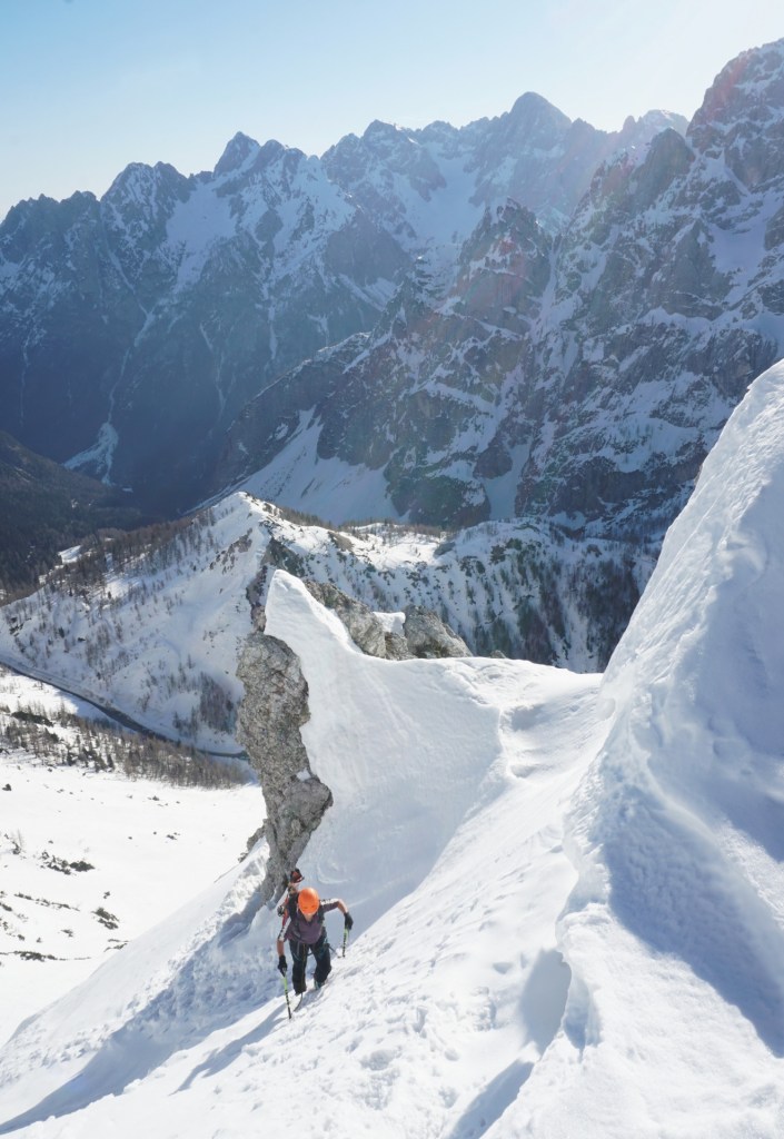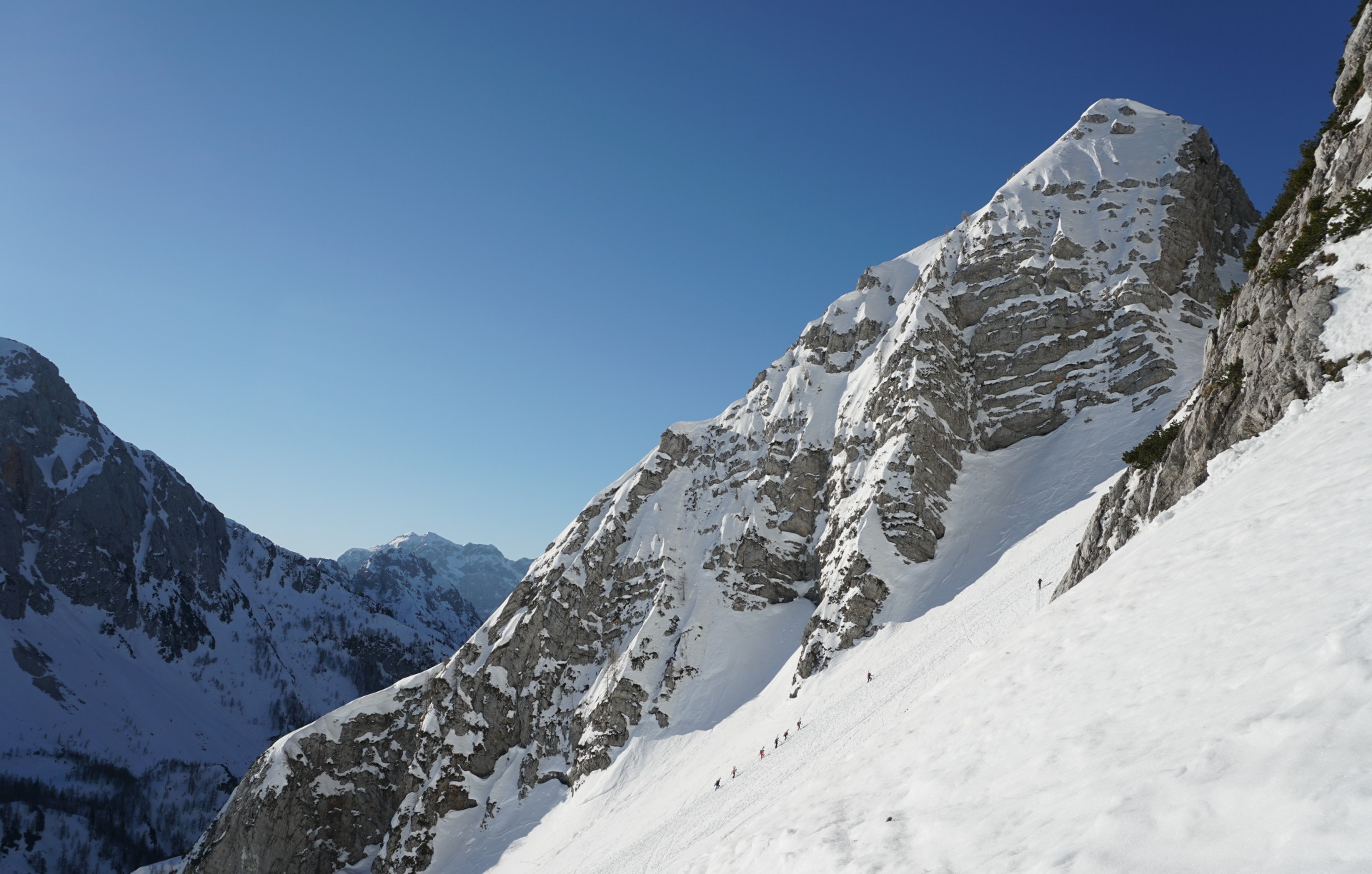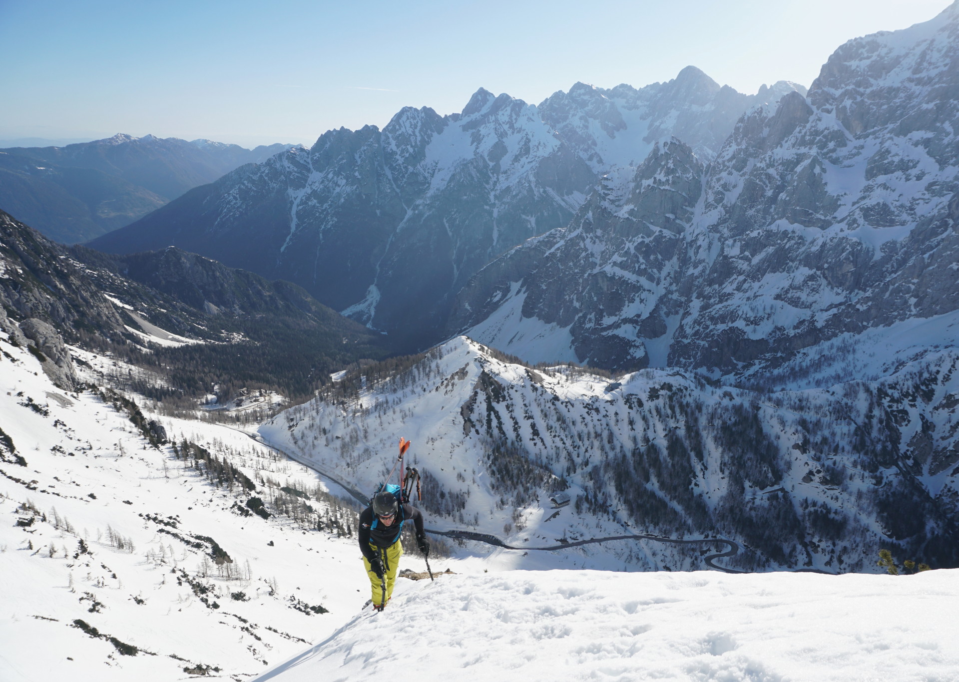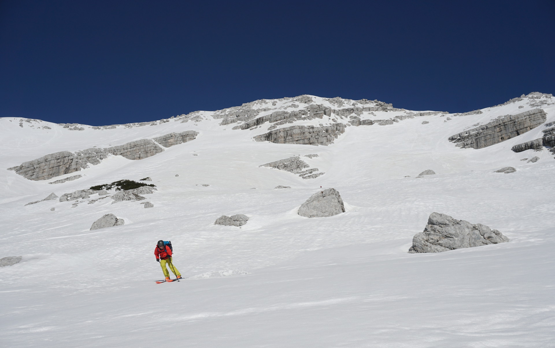 Danes pa smo se v toplem dnevu namenili v najbližjo, Butinarjevo grapo, kjer je bilo že zjutraj obupno vroče, a po udobnih stopnicah sploh ne naporno. Na Grebencu smo šli ponovno na smuči in prečili po spodnji smeri na Veliko Mojstrovko. Po grebenu smo šli kratek čas proti Srednji in ob 10h odsmučali naravnost navzdol po zgornjih širjavah in naprej pod Suhim vrhom v Drevesnico. Smuka je bila zelo uživaška, dolga in razgledna. Nadaljevali smo ves čas v isti smeri skoraj 1000 metrov nižje do potoka. Spodaj je bil sneg sicer že precej južen, pomanjkanja pa še ni čutiti – čeprav smo bili na primorski strani. Za konec nas je seveda čakal vzpon preko planine in nazaj na Vršič. Zaključek ture z vzponom do avta je nekako “nenaraven”, pa kaj bi to na tak lep dan!