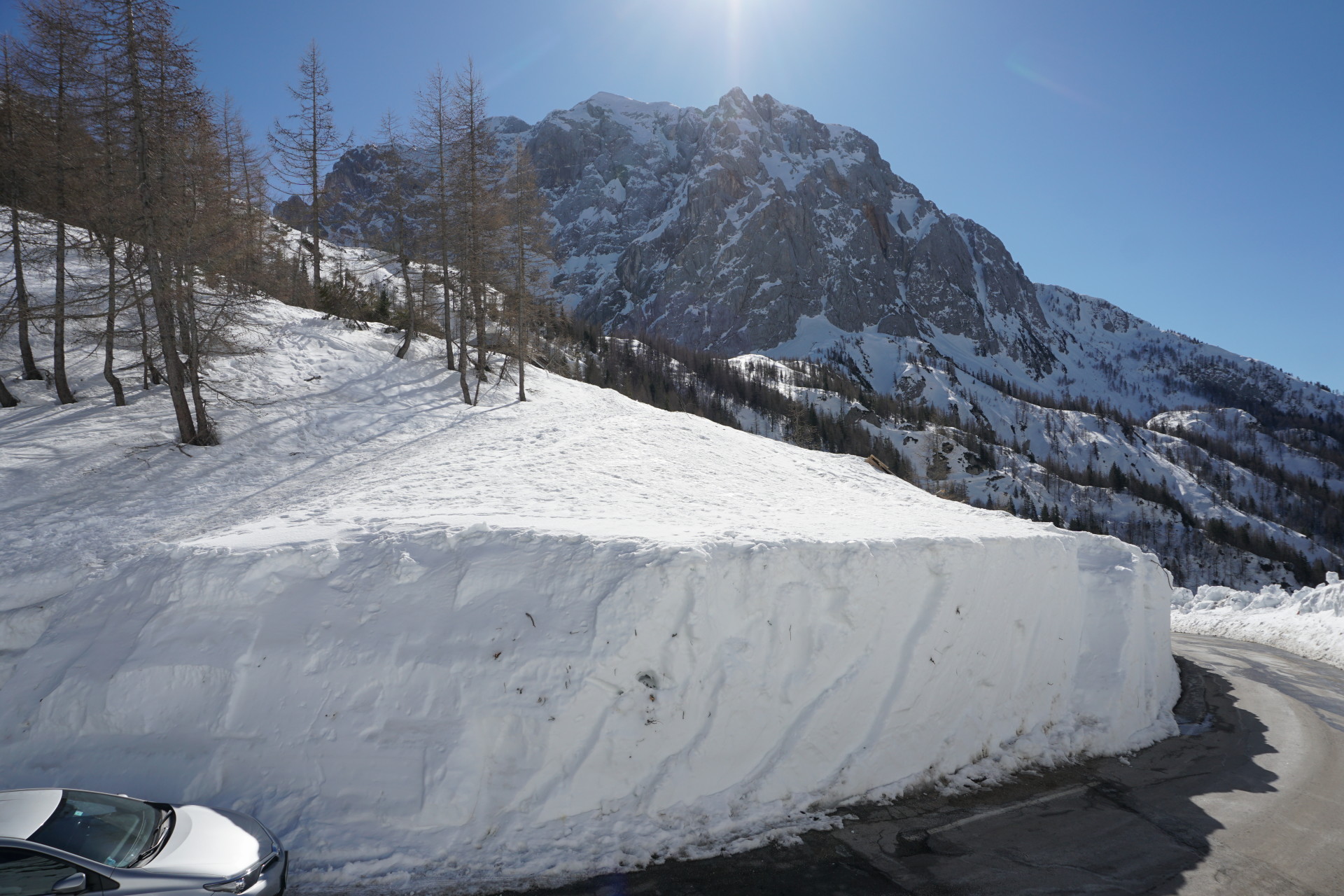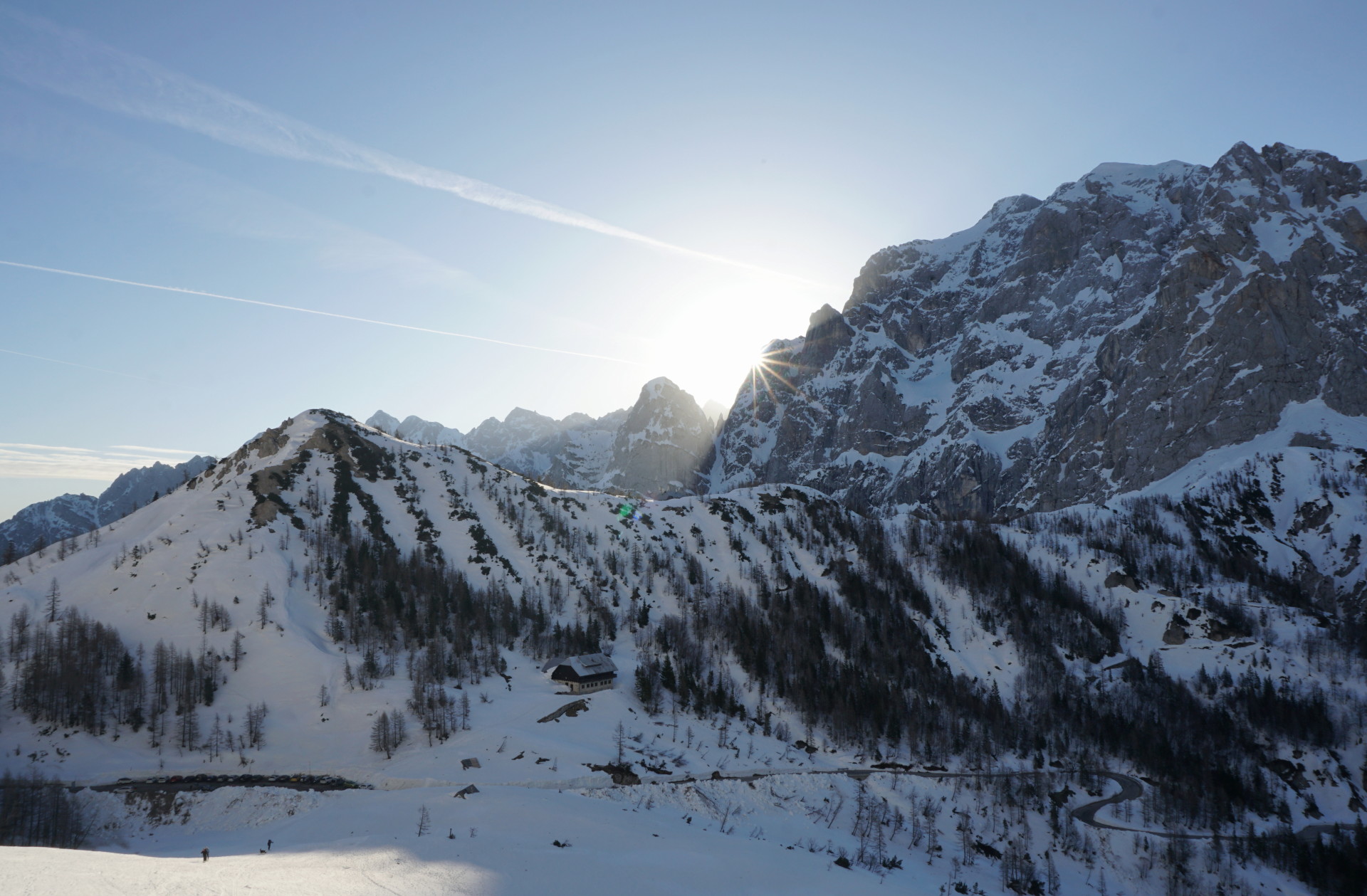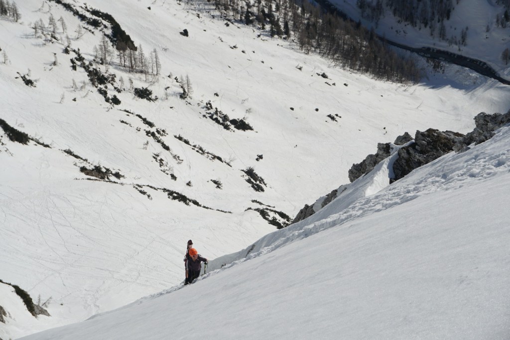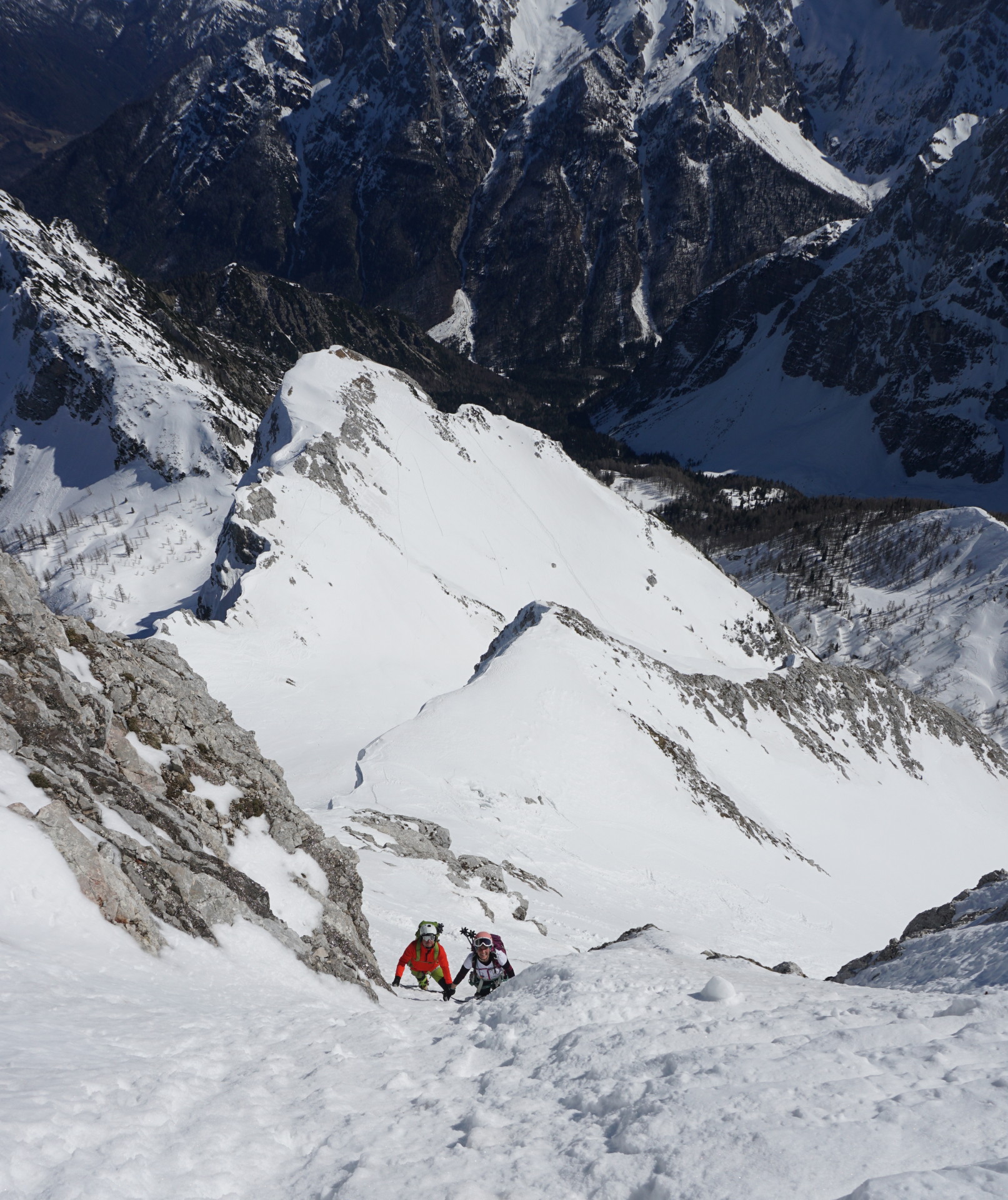 Danes pa smo se v toplem dnevu namenili v najbližjo, Butinarjevo grapo, kjer je bilo že zjutraj obupno vroče, a po udobnih stopnicah sploh ne naporno. Na Grebencu smo šli ponovno na smuči in prečili po spodnji smeri na Veliko Mojstrovko. Po grebenu smo šli kratek čas proti Srednji in ob 10h odsmučali naravnost navzdol po zgornjih širjavah in naprej pod Suhim vrhom v Drevesnico. Smuka je bila zelo uživaška, dolga in razgledna. Nadaljevali smo ves čas v isti smeri skoraj 1000 metrov nižje do potoka. Spodaj je bil sneg sicer že precej južen, pomanjkanja pa še ni čutiti – čeprav smo bili na primorski strani. Za konec nas je seveda čakal vzpon preko planine in nazaj na Vršič. Zaključek ture z vzponom do avta je nekako “nenaraven”, pa kaj bi to na tak lep dan!
