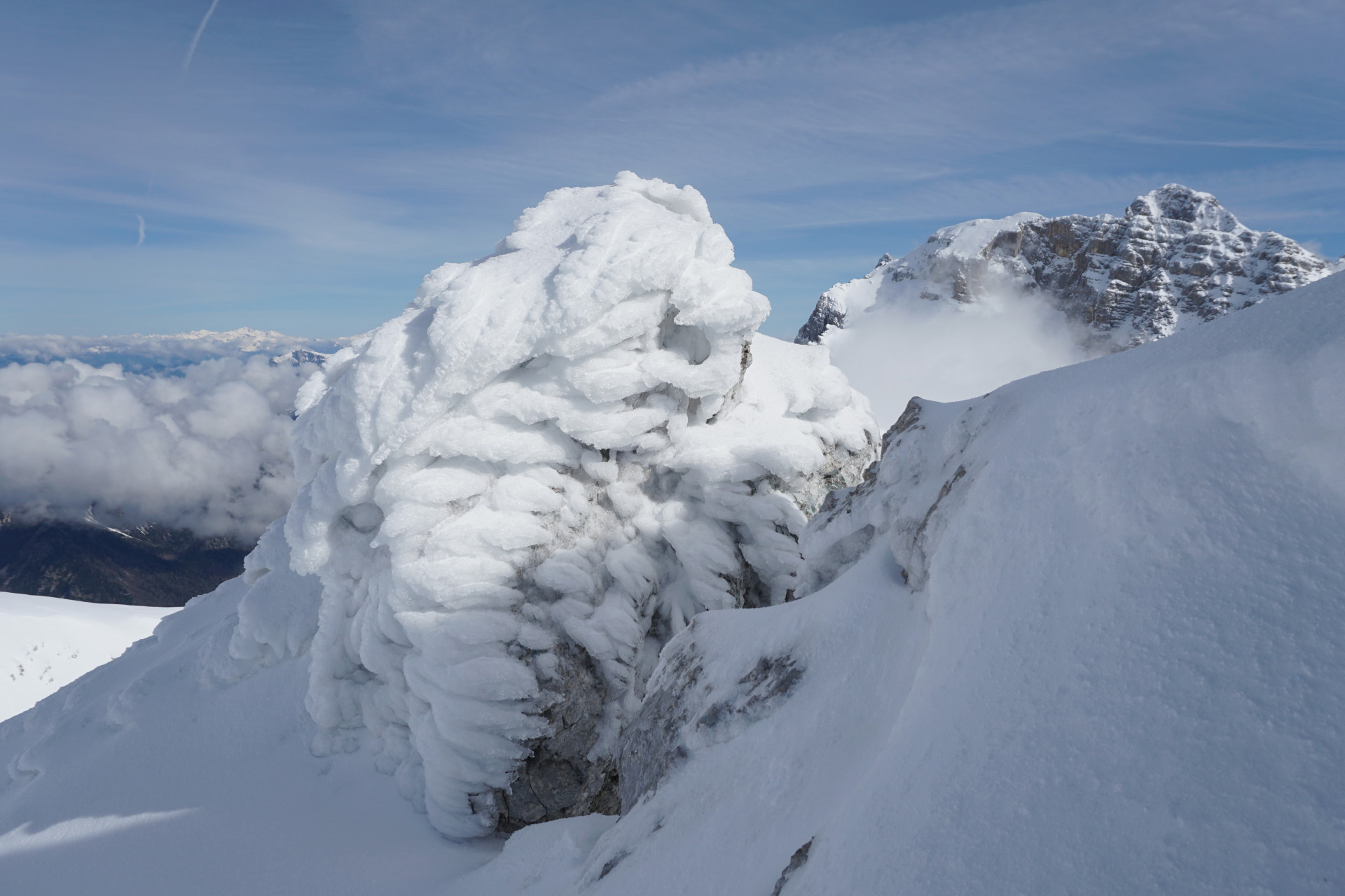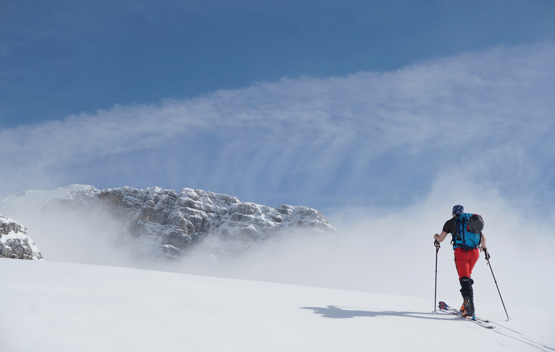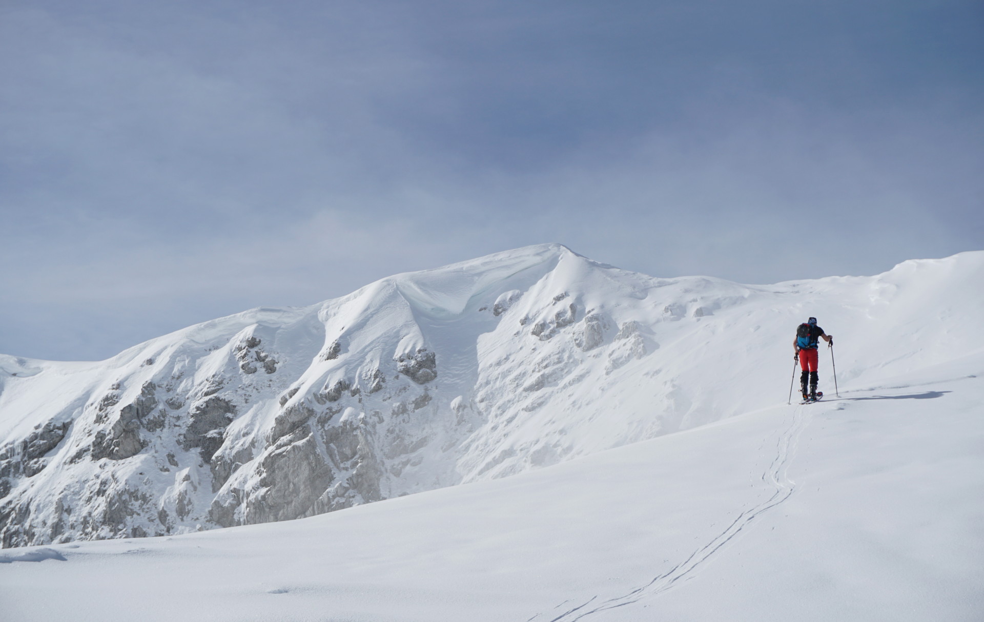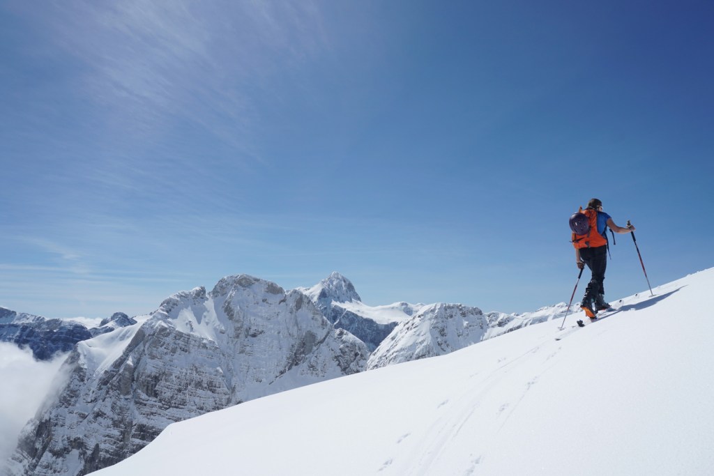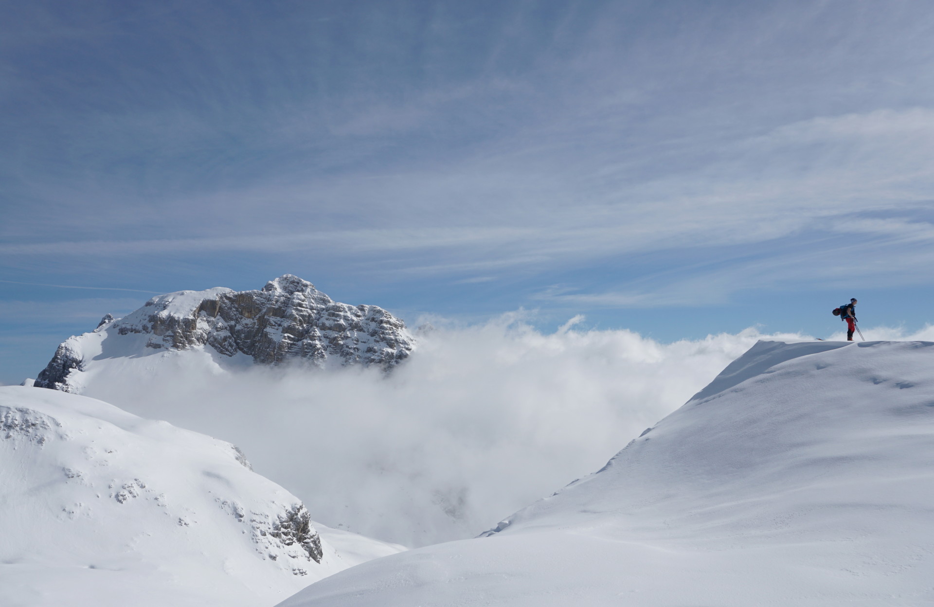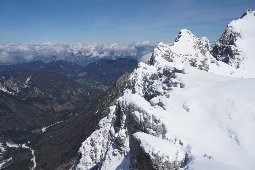 Na smučeh smo udobno prišli tik pod vrh in se seveda povzpeli še po kratkem grebenu do najvišje točke. Ker smo bili prvi, vzpon ni bil najlažji, saj je bila podlaga precej mešana in je bilo treba nekaj previdnosti. Nazaj do smuči, kjer smo si privoščili počitek z enim najlepših razgledov, nato pa navzdol. Kljub obilnim padavinam v zadnjih dneh je bila, zaradi visoke meje sneženja v petek, podlaga trda, čez pa kakšna 2 cm svežega snega. Vsled tega je bila smuka nadvse elegantna – toliko, da smo pod Stenarjem obrnili in se še enkrat vzpeli nazaj. Tokrat smo zavili desno na manj izrazit vrh Gubno, ki je le nekaj metrov nižji od Križa in nudi prijetna široka pobočja ter krasen širok razgled.