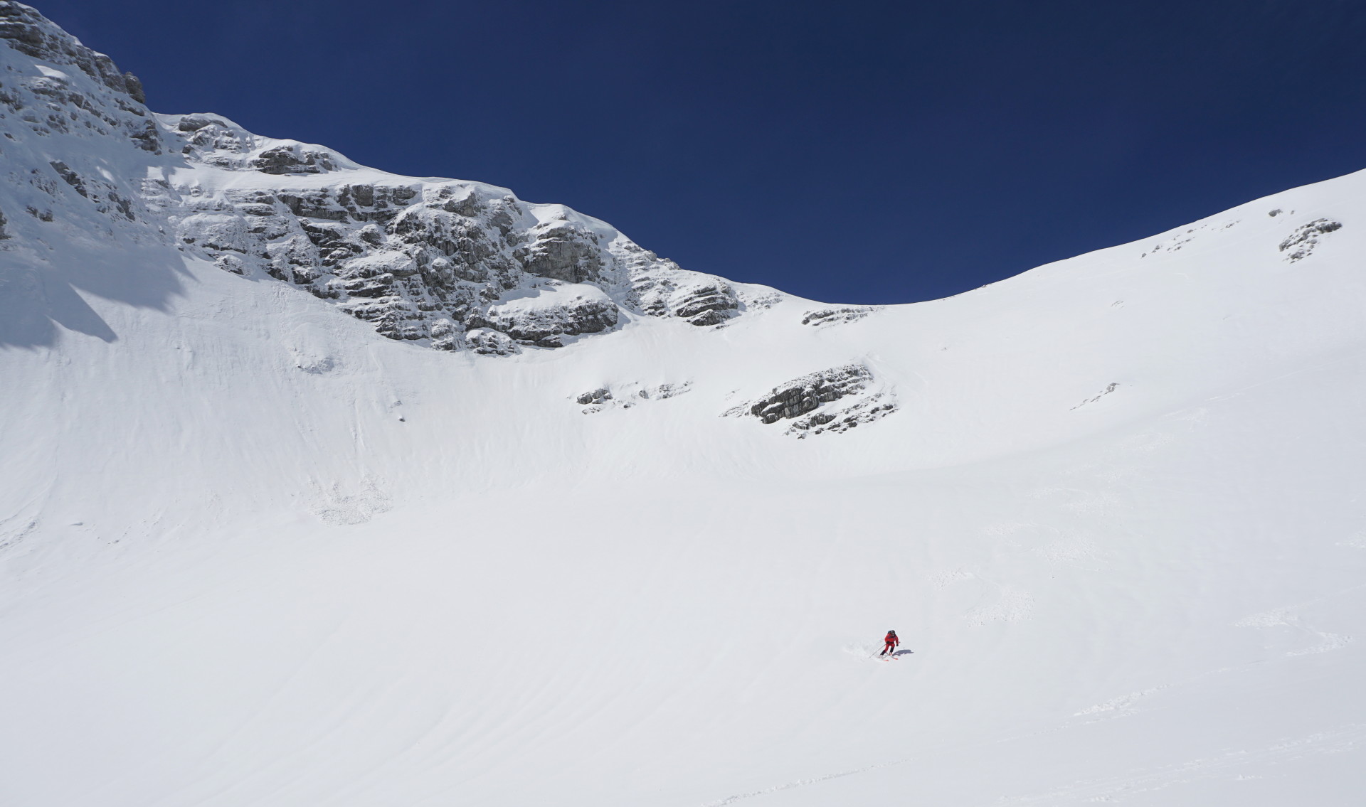 Po uživanju v drugem spustu z Gubnega in po dolini pod Stenarjem, se je nižje podlaga v trenutku spremenila v moker nepredelan sneg z občasno skorjo in smuka je postala precej bolj naporna. Kljub temu je snega več kot dovolj, da smo prismučali vse do gozda, sestopili čez strmi del in spodaj odsmučali po lepo zmehčani plazovini še daleč navzdol. Tudi po še enem obisku Križa, to ostaja ena mojih najljubših smučarskih tur.