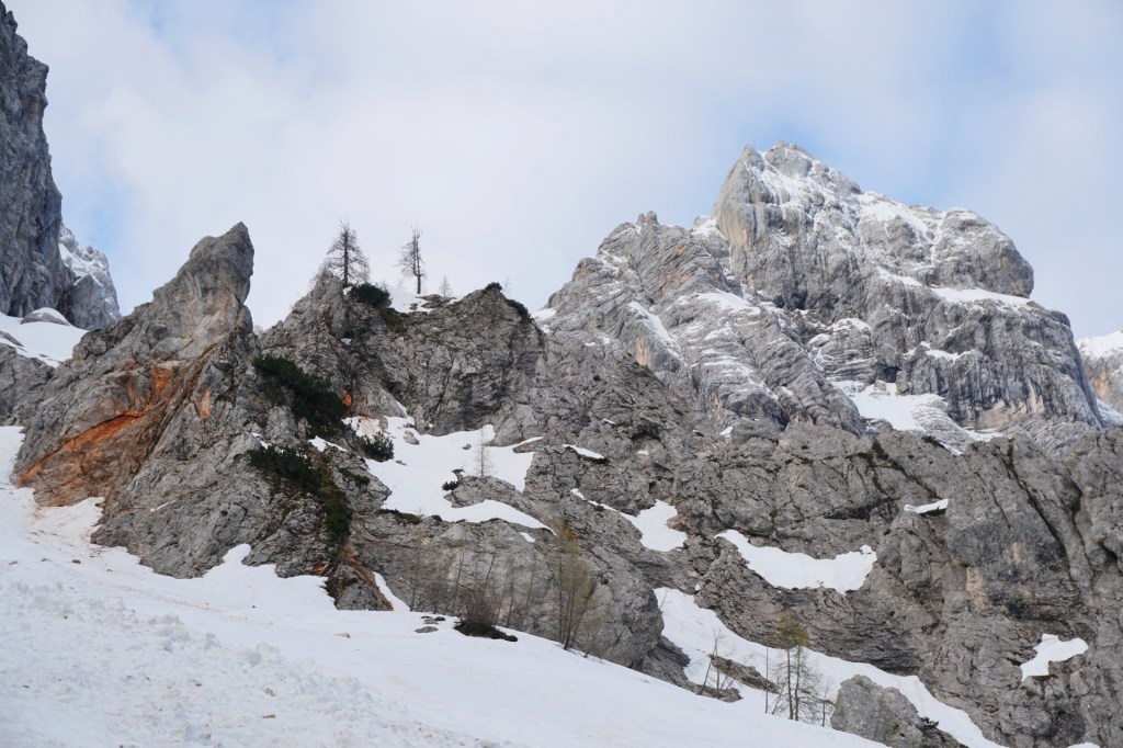 Že na izhodišču sva srečala še dva somišljenika, nekaj drugih je prišlo kasneje, kar je bila verjetno boljša ideja (ne samo zaradi daljšega spanca). Za začetek kar nekaj vzpona v dodobra namočenem gozdu s težkimi bremeni vse do krnice Za Akom. V strugi snega sicer ni v izobilju, a dovolj, da smo se pri ustreznem balvanu preobrazili v smučarje. Od tu naprej je snega vse do vrha več kot dovolj in zaenkrat ne kaže, da bi ga na kakšnem mestu kmalu zmanjkalo. Na smučeh proti dobro vidnim trem macesnom, mimo njih preko strmine peš in višje spet na smučeh, kjer je bila zoprna skorja, ki se je že med hojo predirala.