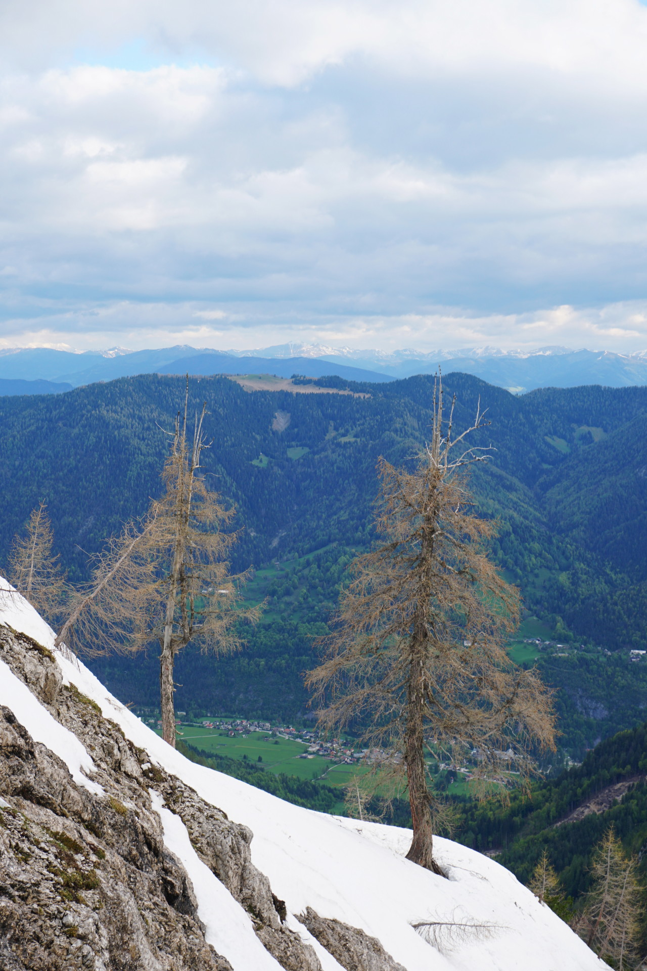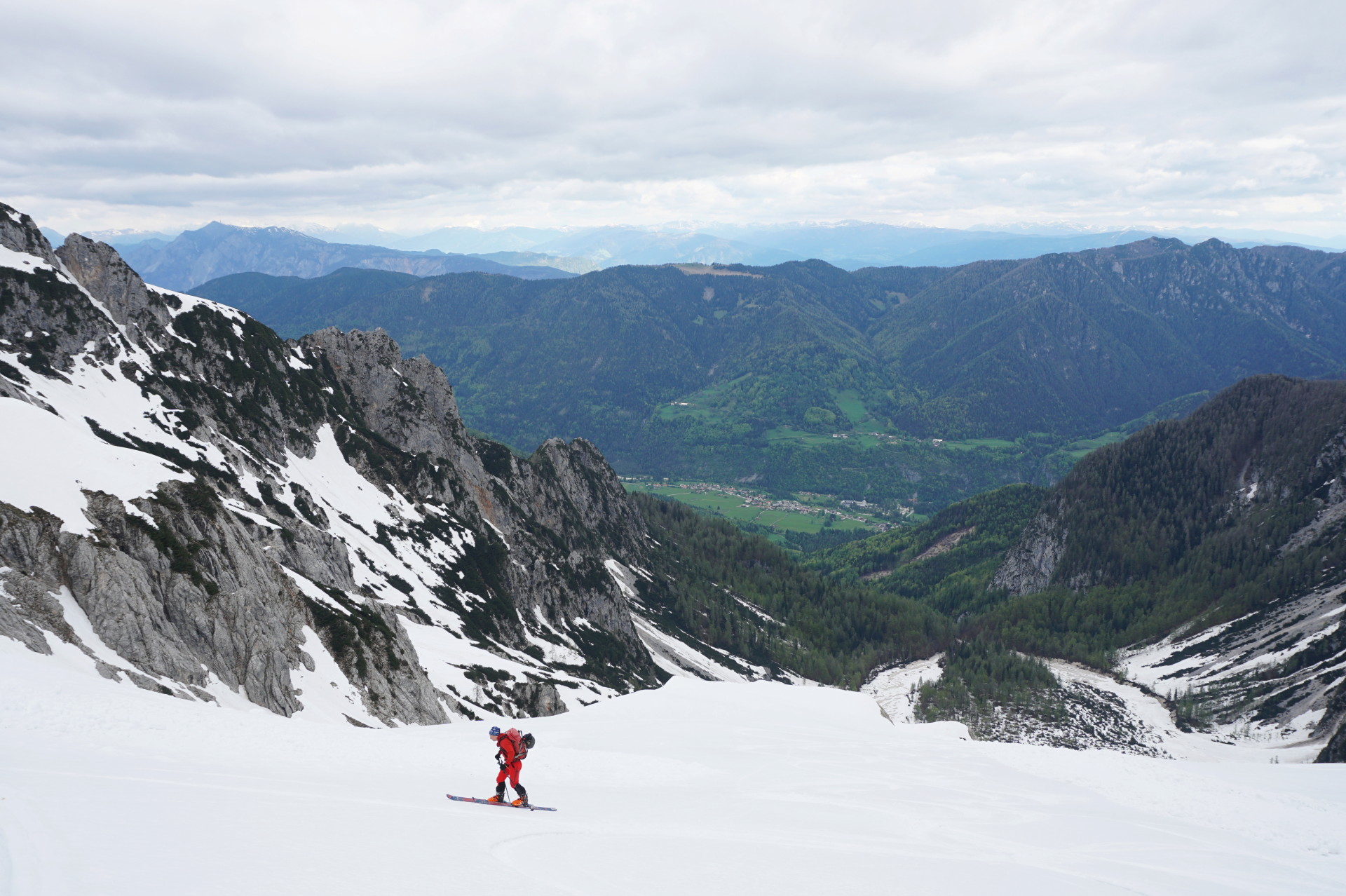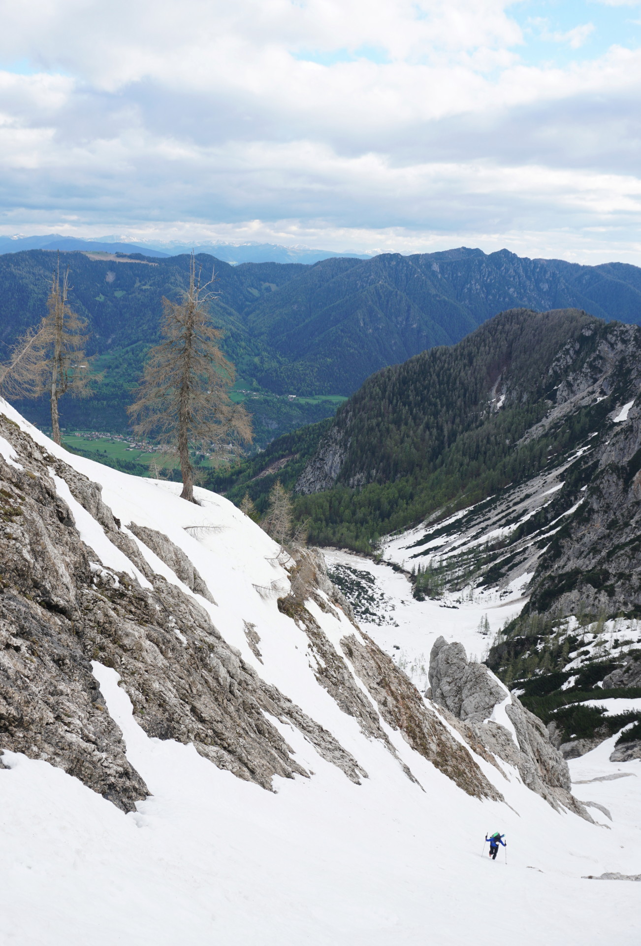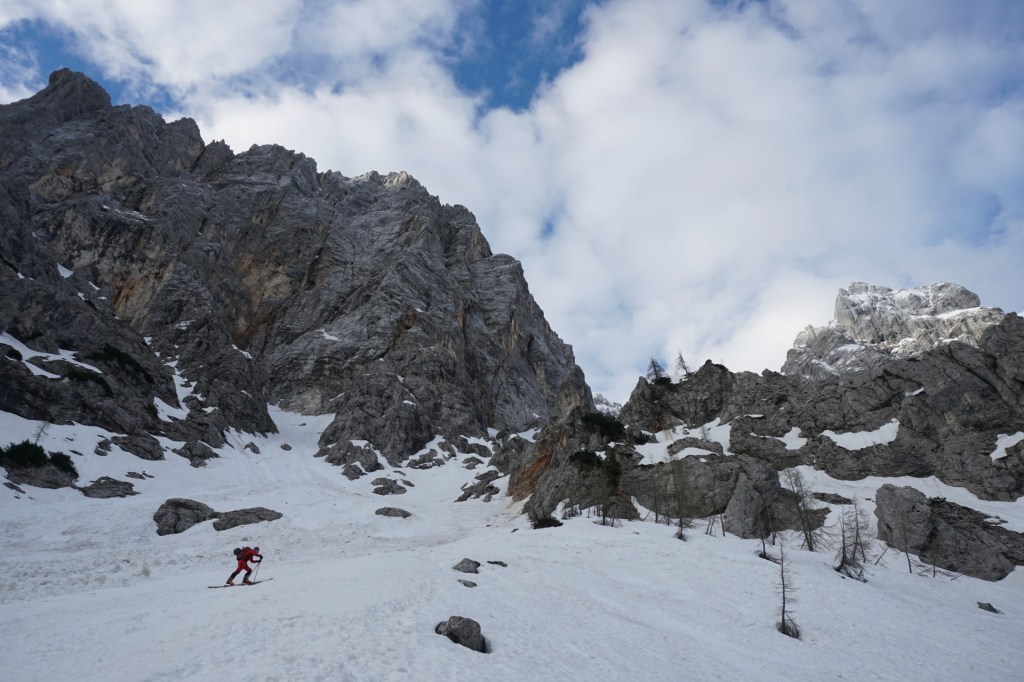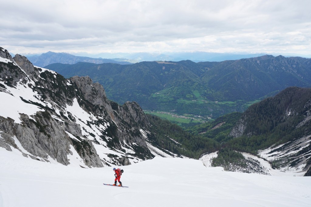 K sreči se je ravno takrat nekajkrat odprlo nebo in nas je pogrelo sonce, da smo si lahko privoščili malo odmora. Prav prijetno vseeno ni bilo in sčasoma sva sestopila nazaj do smuči po udobnih stopinjah, le v vzvratni smeri. Malo nama je bilo žal, da nisva vendarle nesla smuči višje, čeprav kakšnih užitkov res nisva zamudila. Niti si jih nisva obetala v nadaljevanju. V grapi je bilo malce pretrdo, a spodobno, spodaj nekaj plazovin, nižje nato skorja, mimo macesnov in spodaj pa južen sneg, ki pa je bil še najboljši del smučanja. Na dnu struge smo si spet naložili vso zimsko opravo na rame in sestopili po strmi poti v pomlad. Nazadnje sem bil na tej turi pred sedmimi leti, kar je očitno dovolj dolgo, da sem pozabil napore. Zdaj pa se veselim ponovitve čez naslednjih sedem let, upam da takrat v boljših razmerah.