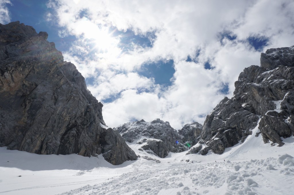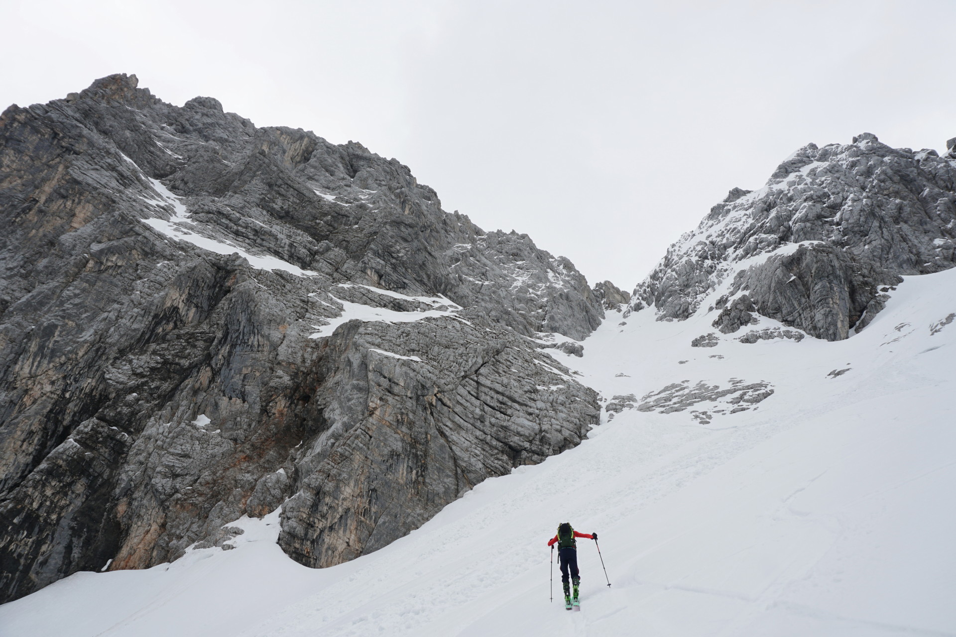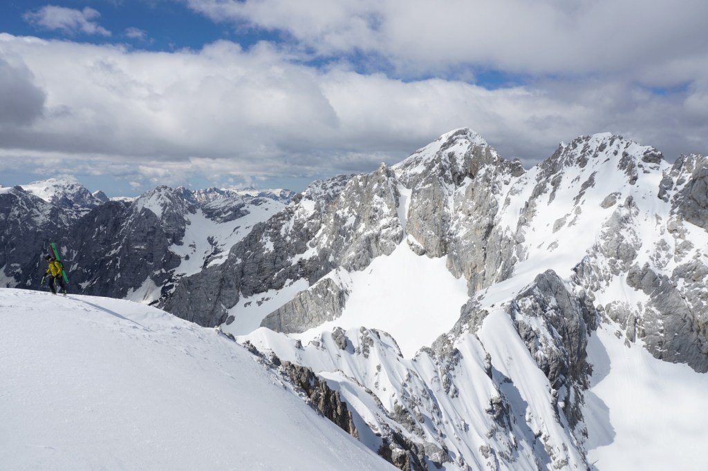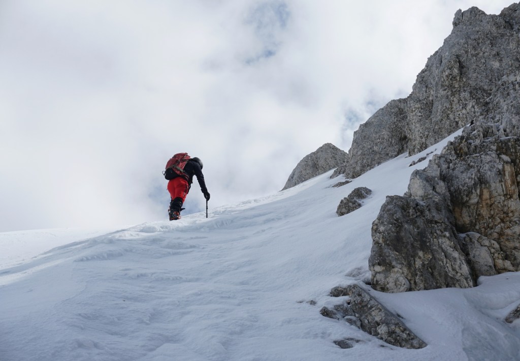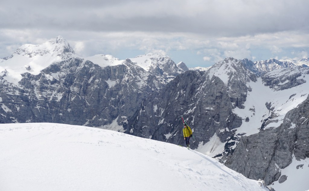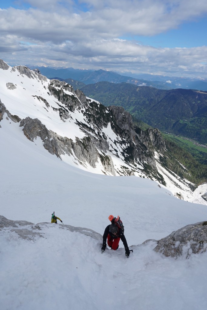 Po dolgem vzponu se je za robom Široke peči končno pokazala Jugova grapa, ki nas je pripeljala na Dovški križ. Pomrznjena skorja se na smučeh ni več predirala, zato smo nadaljevali na derezah, in sicer kar naravnost preko prehoda med skalami, kjer se je manj prediralo. V skoku je bil celo led, tako da smo imeli kratek vložek lednega plezanja konec maja, zakaj pa ne. Podlaga je postajala čedalje bolj trda in za vzpon zelo udobna, dereze in cepini so držali kot pribiti. A za smučanje je izgledalo pretrdo, saj tudi sonca ni bilo od nikoder. Zato sva z Džanijem pustila smuči pod skalo, kjer se je grapa zožila in bolj lahkotno nadaljevala v levi izstop, ki je precej strm, a dobro zasnežen. Do vrha je bil nato le še kratek vzpon v mehkem snegu.