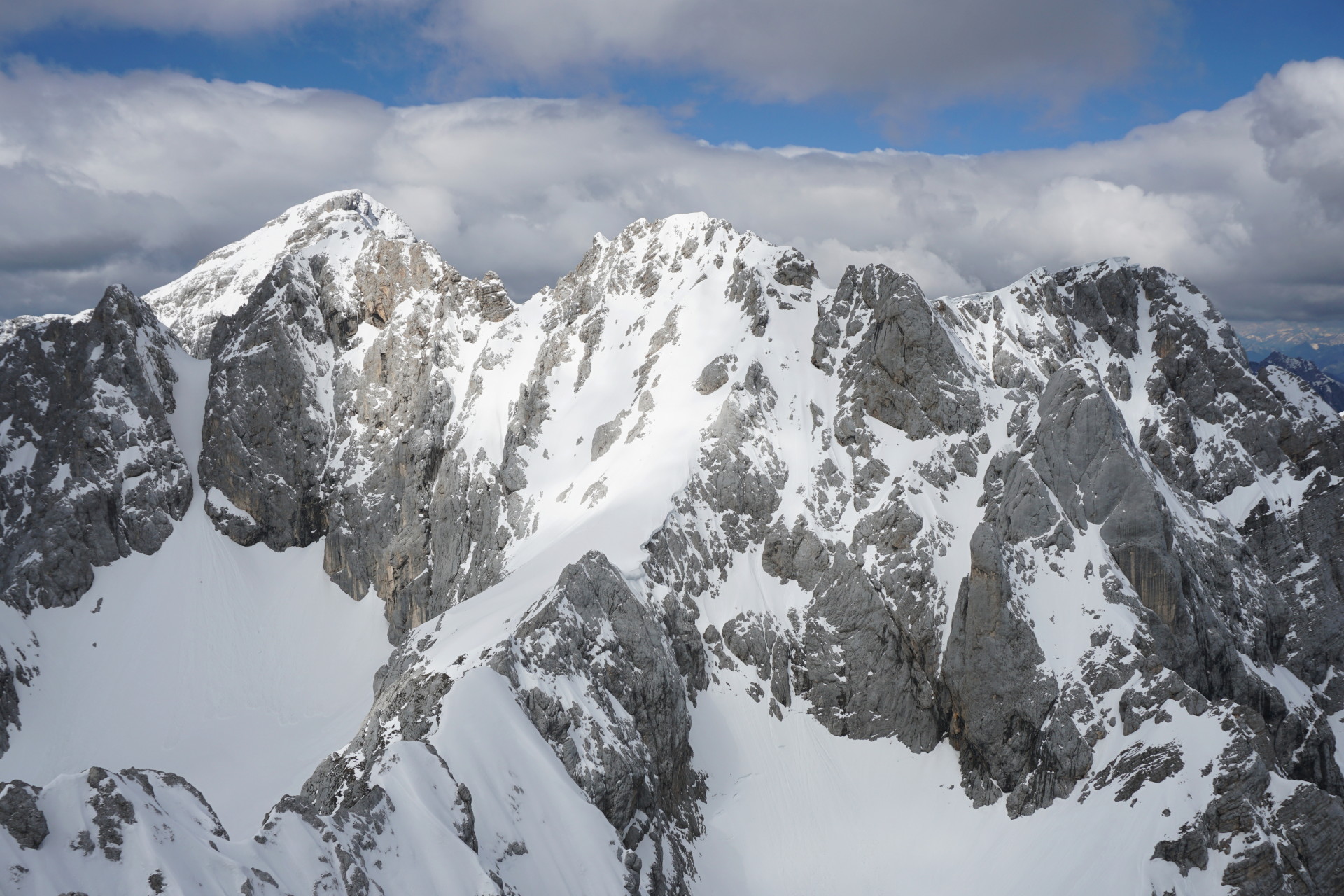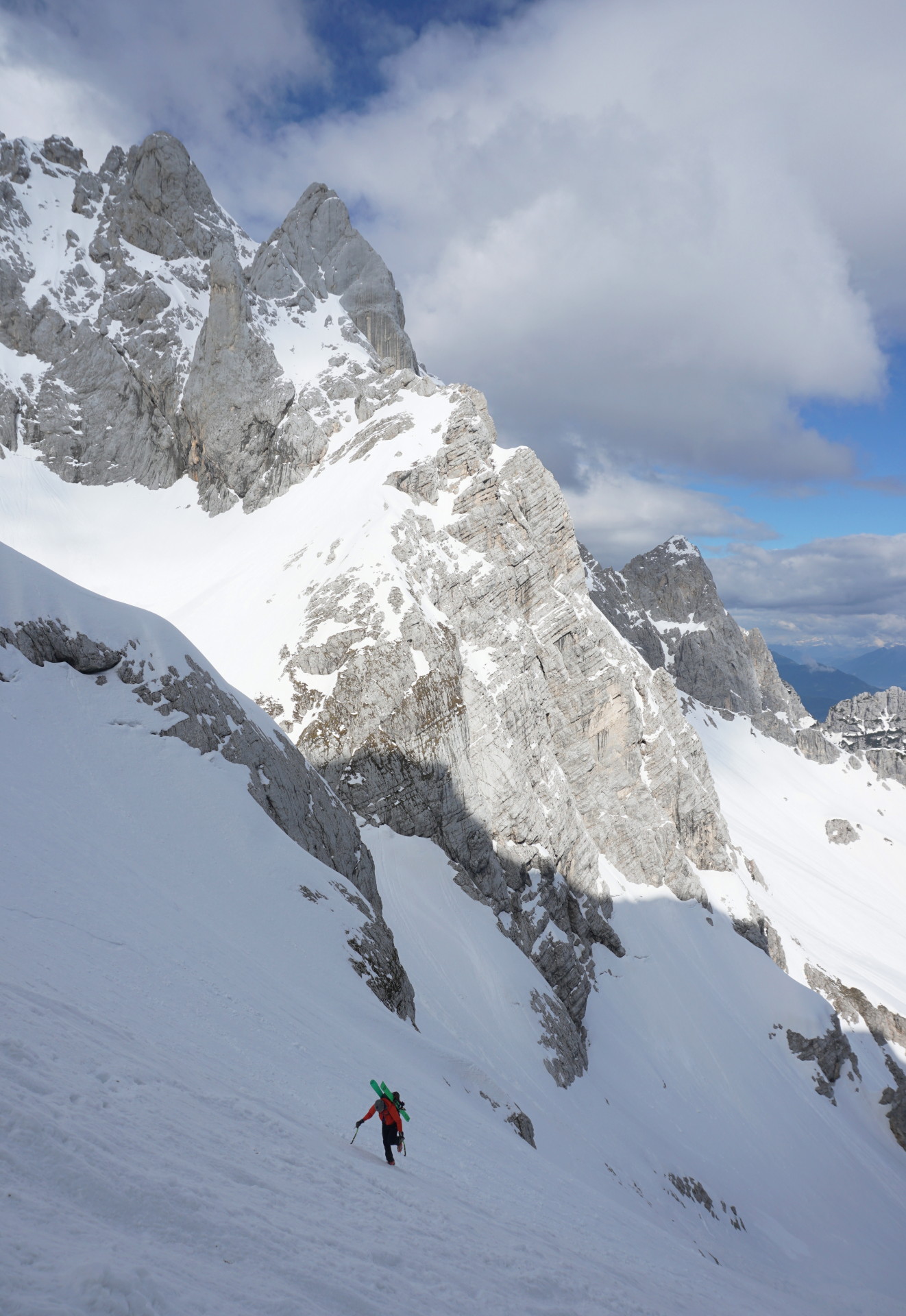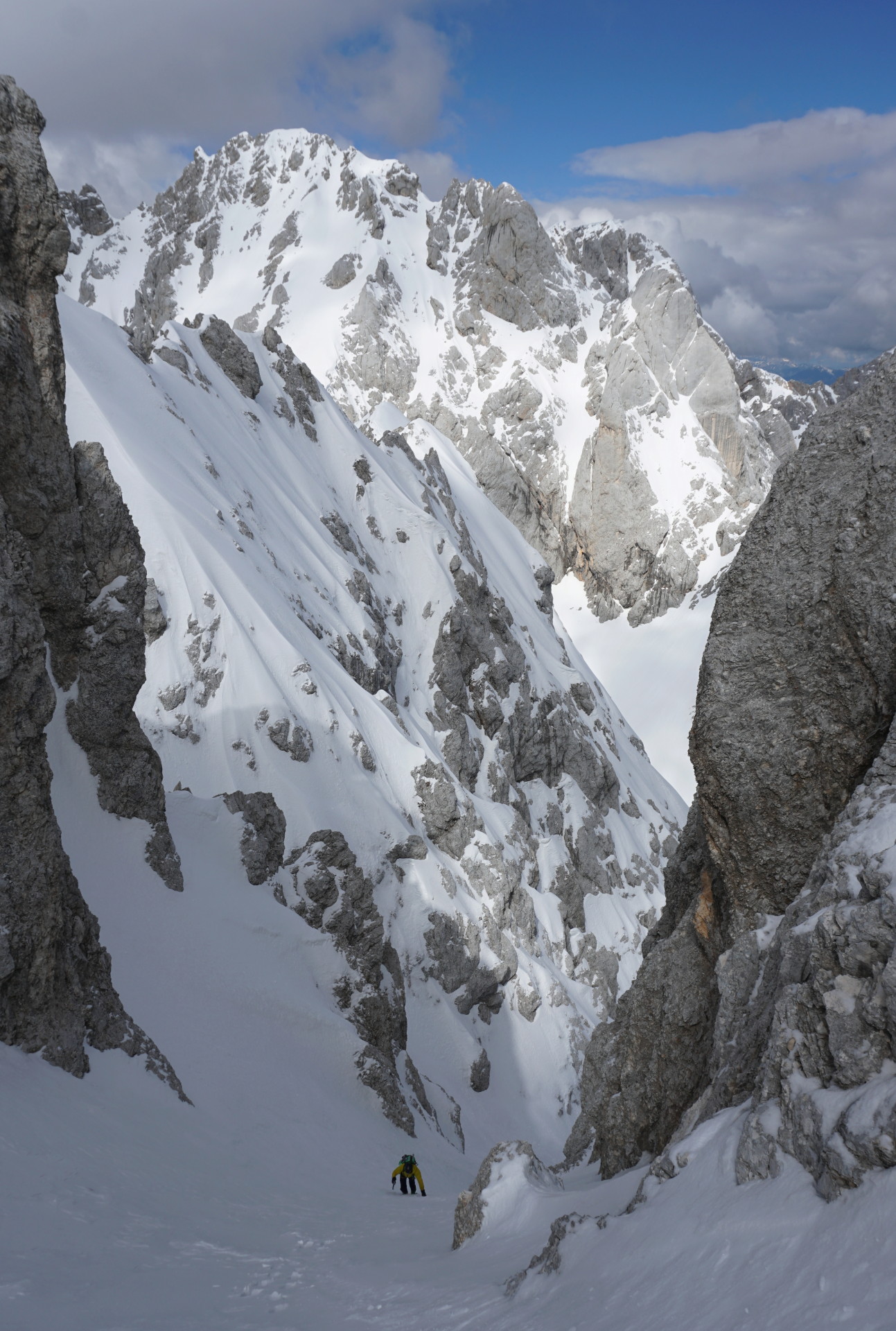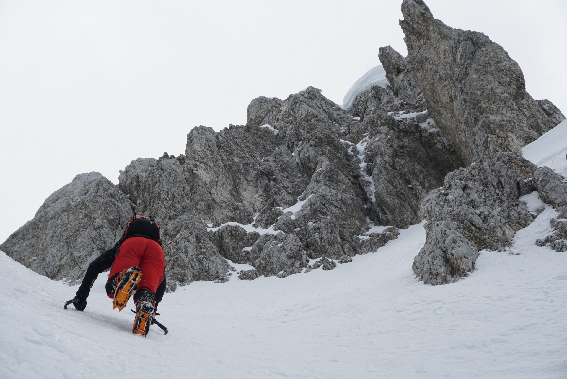 Po dolgem vzponu se je za robom Široke peči končno pokazala Jugova grapa, ki nas je pripeljala na Dovški križ. Pomrznjena skorja se na smučeh ni več predirala, zato smo nadaljevali na derezah, in sicer kar naravnost preko prehoda med skalami, kjer se je manj prediralo. V skoku je bil celo led, tako da smo imeli kratek vložek lednega plezanja konec maja, zakaj pa ne. Podlaga je postajala čedalje bolj trda in za vzpon zelo udobna, dereze in cepini so držali kot pribiti. A za smučanje je izgledalo pretrdo, saj tudi sonca ni bilo od nikoder. Zato sva z Džanijem pustila smuči pod skalo, kjer se je grapa zožila in bolj lahkotno nadaljevala v levi izstop, ki je precej strm, a dobro zasnežen. Do vrha je bil nato le še kratek vzpon v mehkem snegu.
