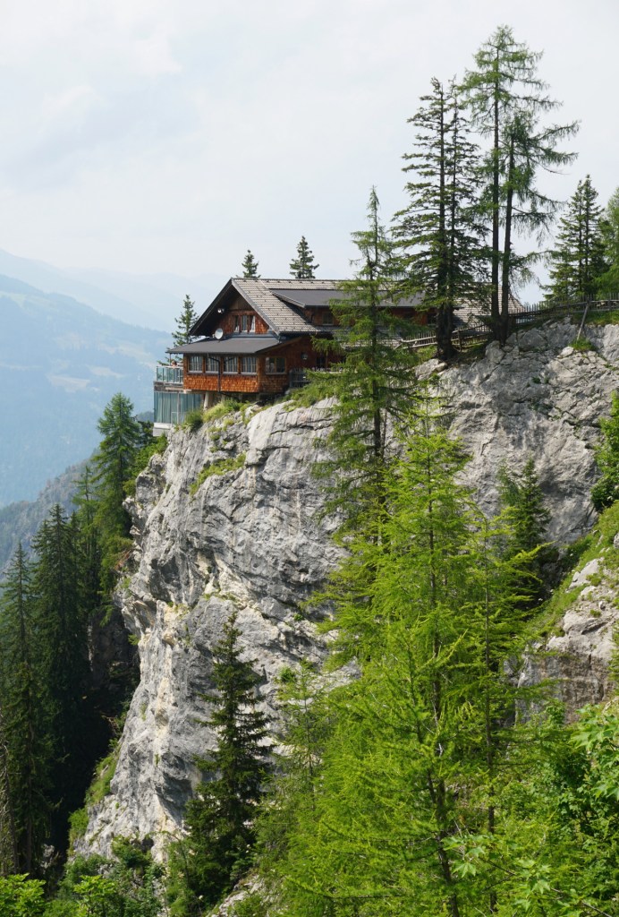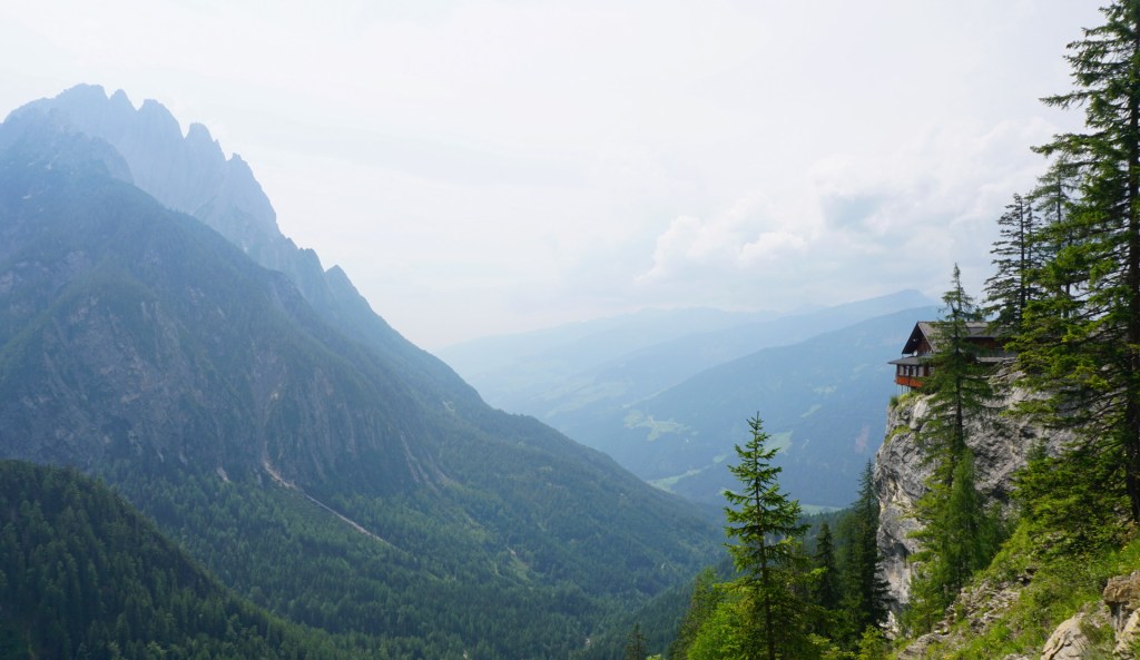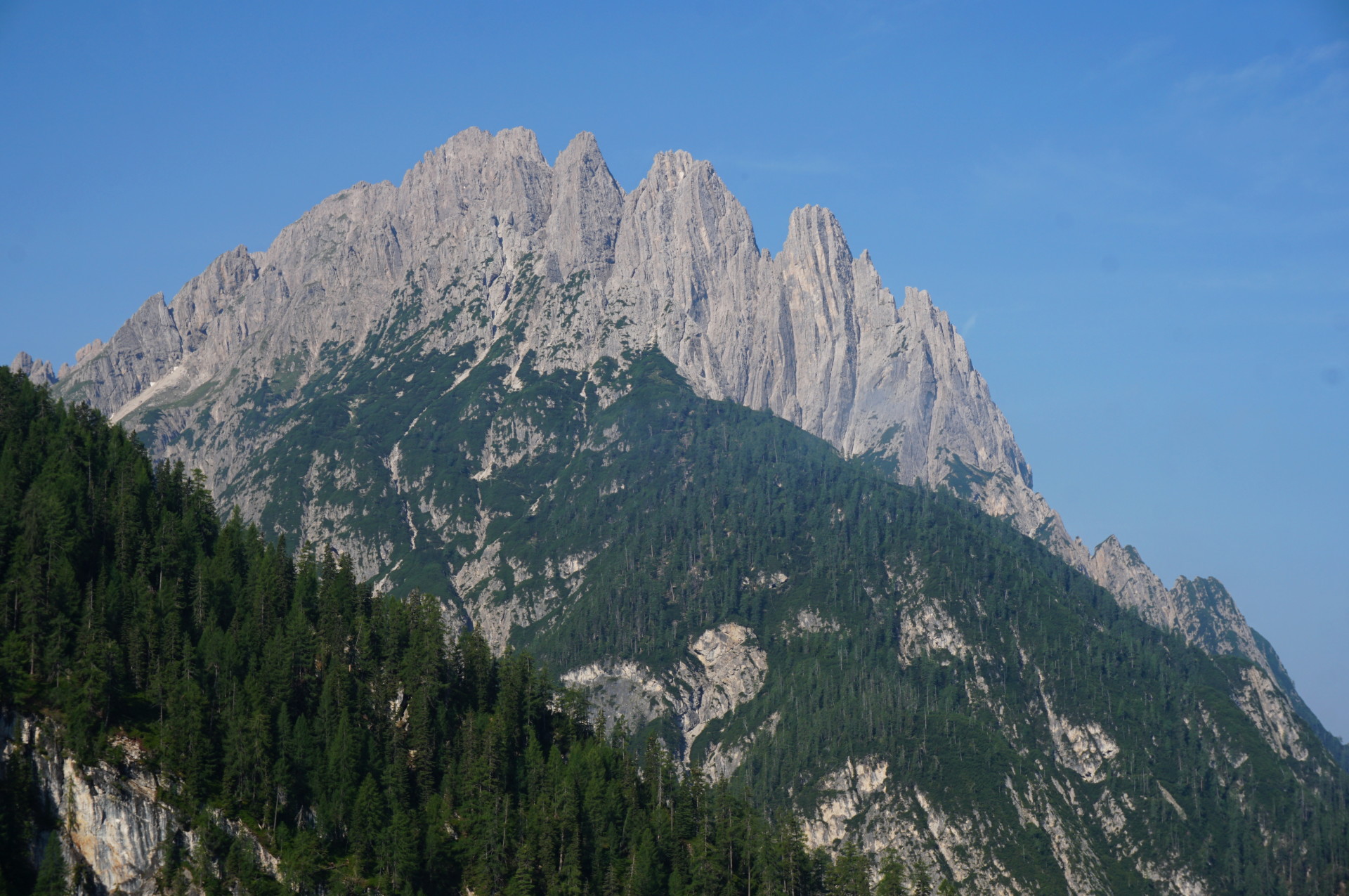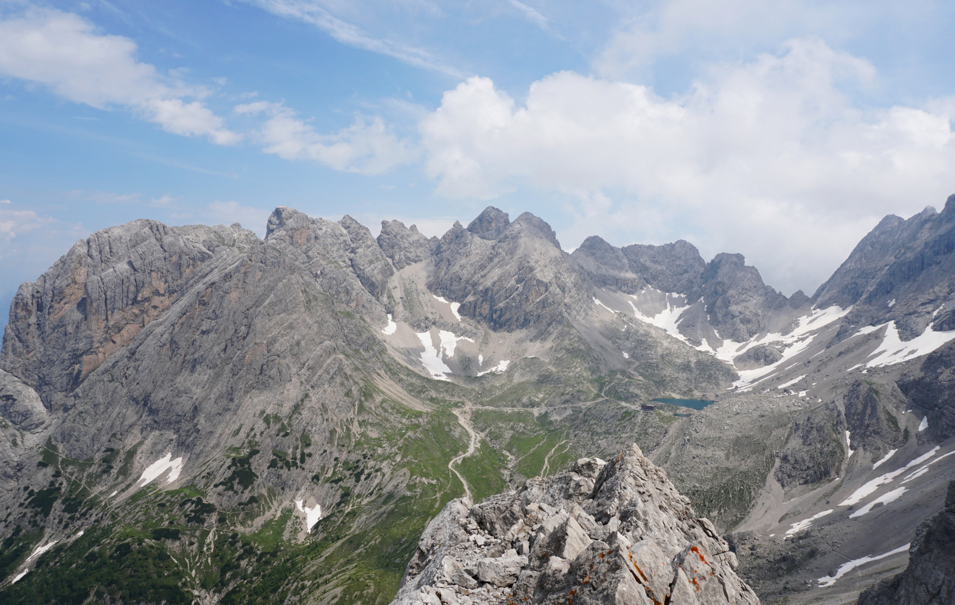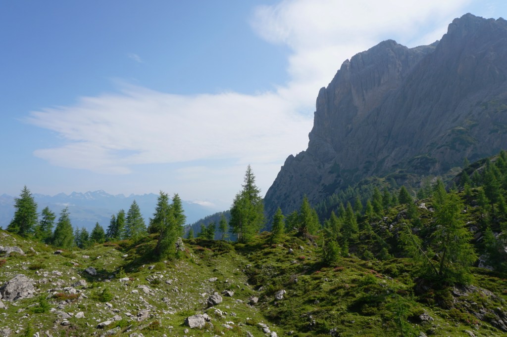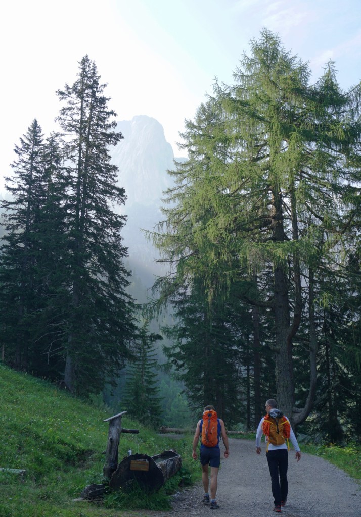 V soboto smo se zapeljali po gorski cesti do Dolomitenhütte (1616 m), kjer je večje parkirišče (v Avstriji imajo cestnino za skoraj vsako cesto, ki gre vsaj malo v hrib in tudi tu smo plačali 8€). Sprva po cesti do planine Insteinalm, nato pa po prijetni poti skozi lep macesnov gozd po dolini, obdani z mogočnimi špicami vse naokoli. Na koncu doline ob jezeru stoji koča (skoraj hotel) Karlsbader Hütte (2260 m), do katere vodi tudi makadamska cesta, po kateri je vozilo kar nekaj e-kolesarjev. Mi sicer koče nismo obiskali, a menda je zelo udobna in seveda na enkratni lokaciji; na njihovi spletni strani so zelo dobri opisi tur v okolici (pohodniške poti, ferate, alpinistične smeri in celo plezališče). Skratka, dobra ideja tudi za večdnevno izhodišče.