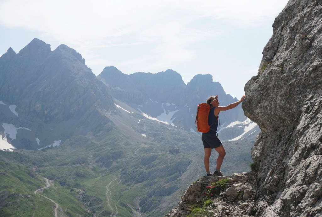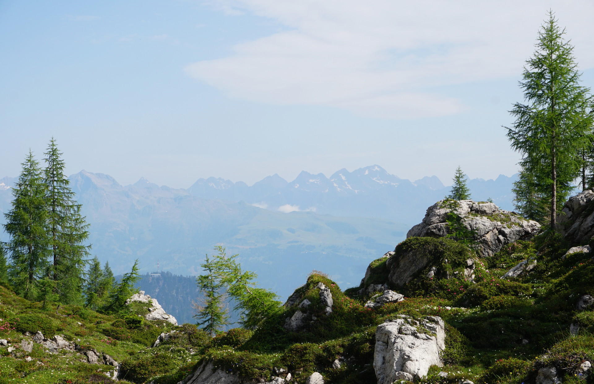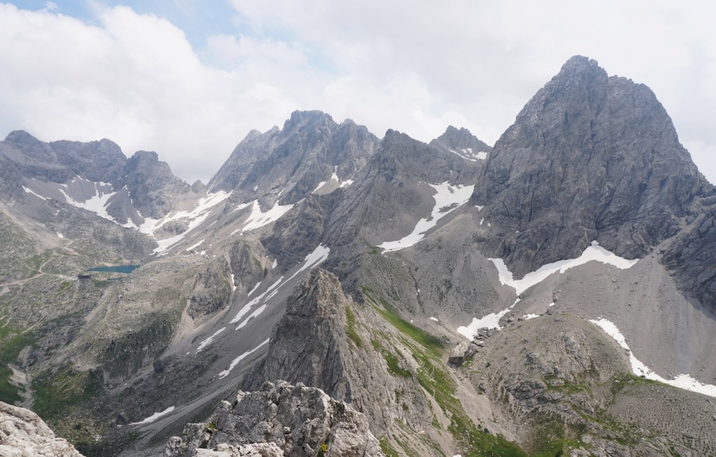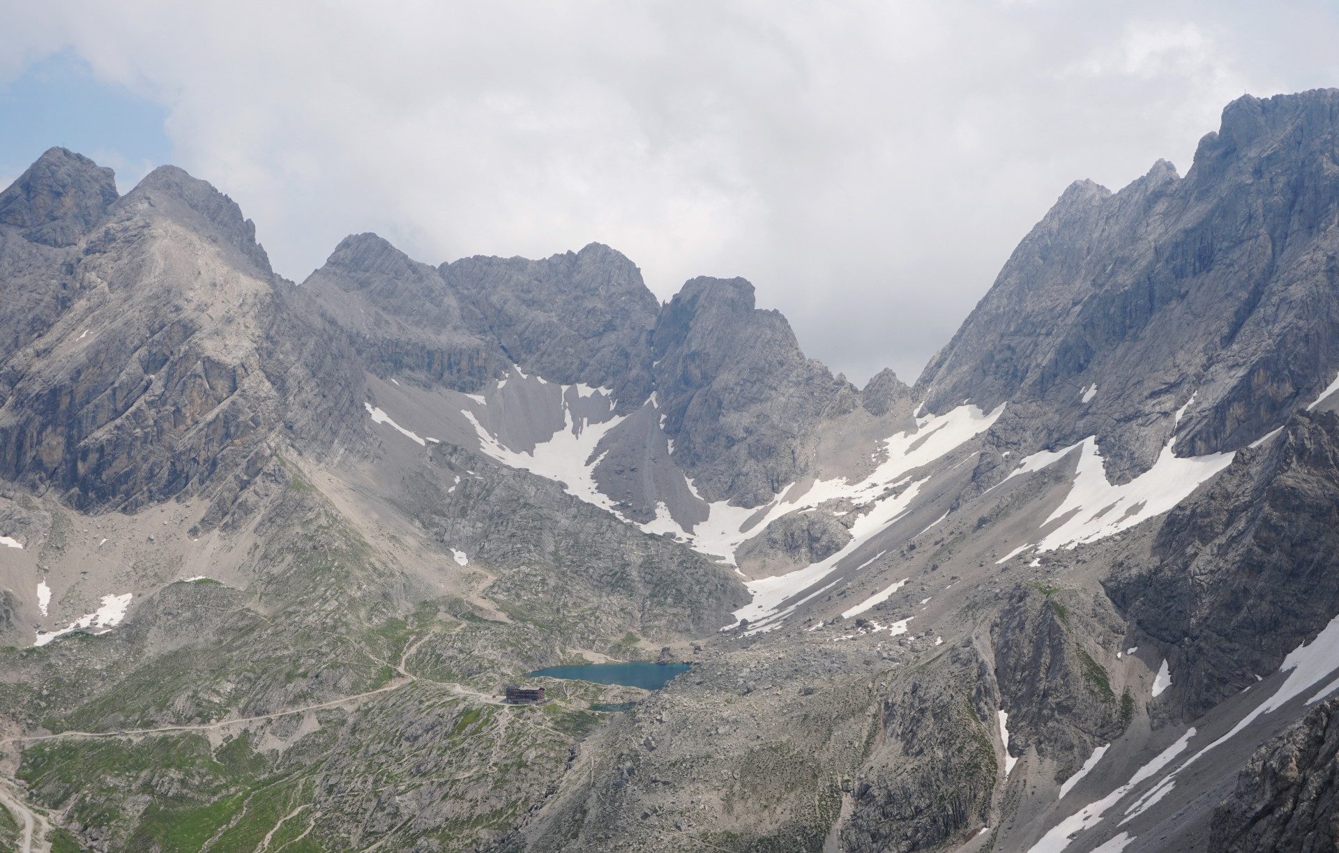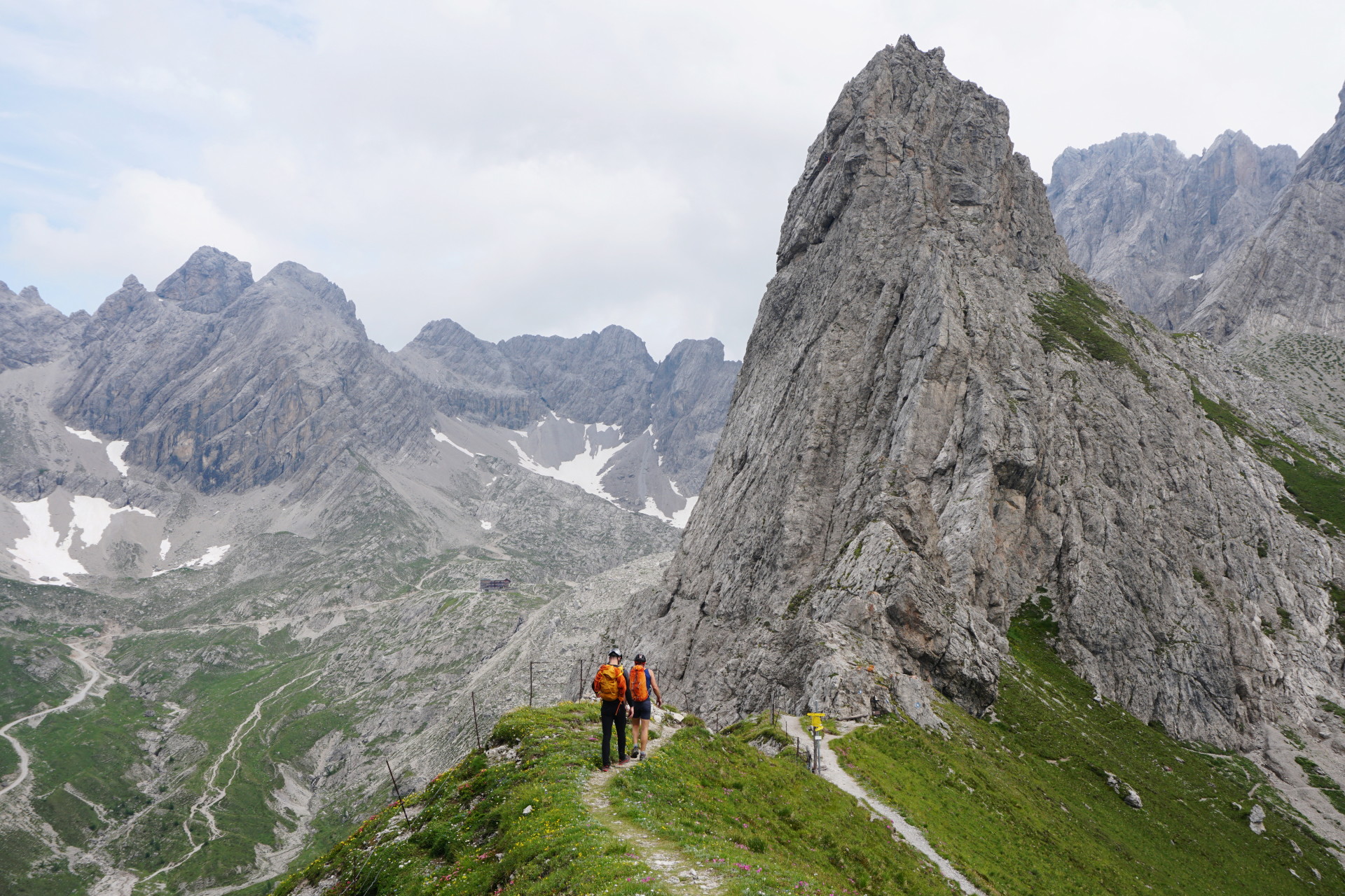 V soboto smo se zapeljali po gorski cesti do Dolomitenhütte (1616 m), kjer je večje parkirišče (v Avstriji imajo cestnino za skoraj vsako cesto, ki gre vsaj malo v hrib in tudi tu smo plačali 8€). Sprva po cesti do planine Insteinalm, nato pa po prijetni poti skozi lep macesnov gozd po dolini, obdani z mogočnimi špicami vse naokoli. Na koncu doline ob jezeru stoji koča (skoraj hotel) Karlsbader Hütte (2260 m), do katere vodi tudi makadamska cesta, po kateri je vozilo kar nekaj e-kolesarjev. Mi sicer koče nismo obiskali, a menda je zelo udobna in seveda na enkratni lokaciji; na njihovi spletni strani so zelo dobri opisi tur v okolici (pohodniške poti, ferate, alpinistične smeri in celo plezališče). Skratka, dobra ideja tudi za večdnevno izhodišče.