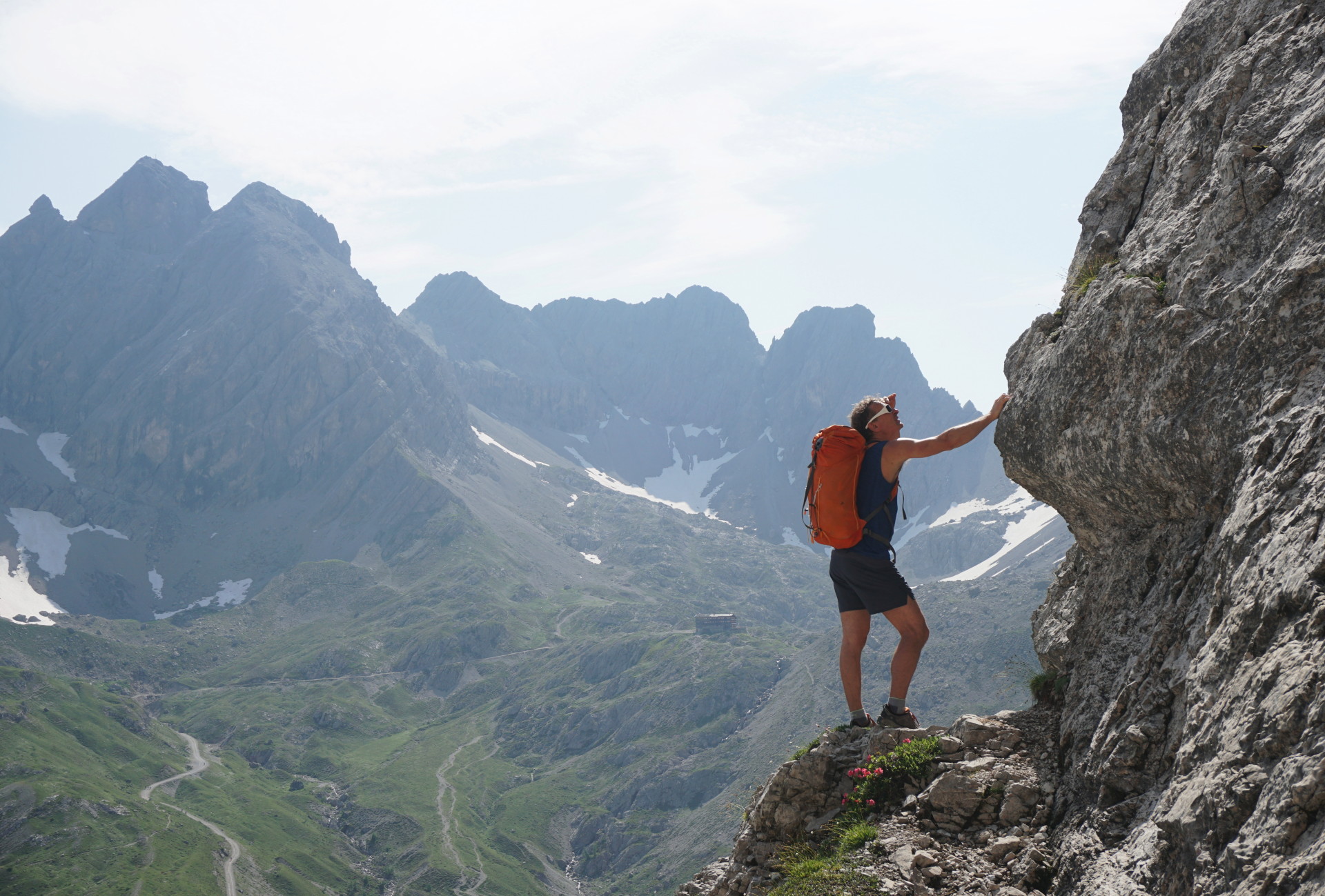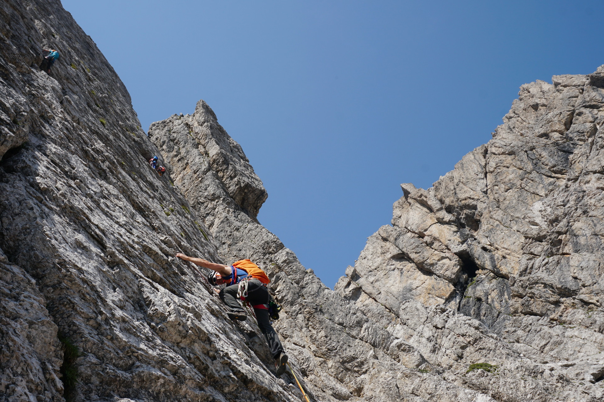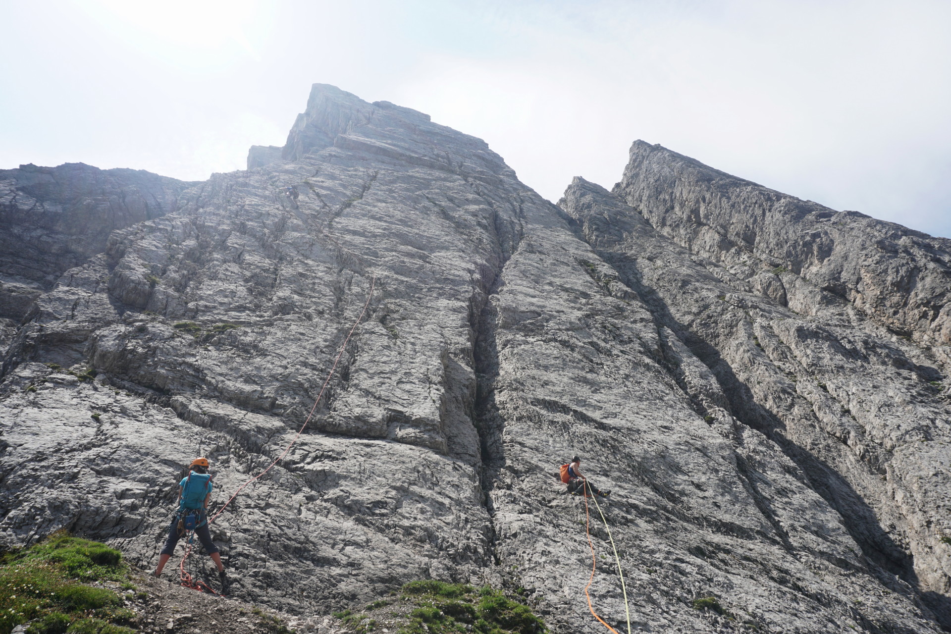 Kot rečeno smo mi že pod kočo zapustili pot in jo ubrali strmo navzgor pod steno Kleine Gamswiesenspitze (2454 m). V osrednjem stebru severne stene sta dve priljubljeni smeri, ki potekata ena ob drugi, steno na sredini preseka široka polica. Naravnost preko strmih plošč poteka smer Gamsplatte, ki je skoraj konstantna IV, levo ob njej pa Nordostkante, ki je večinoma okoli 3, z enim raztežajem 4 in (menda) detajlom 5.