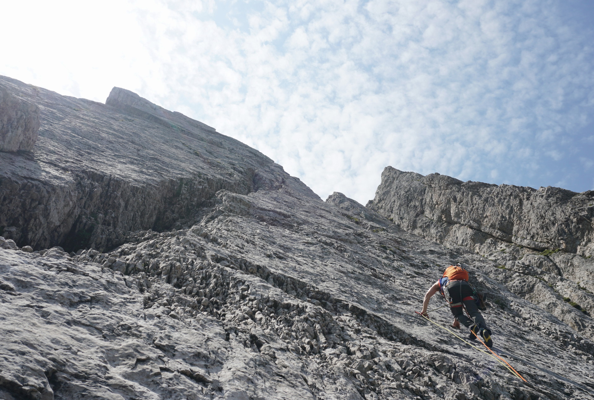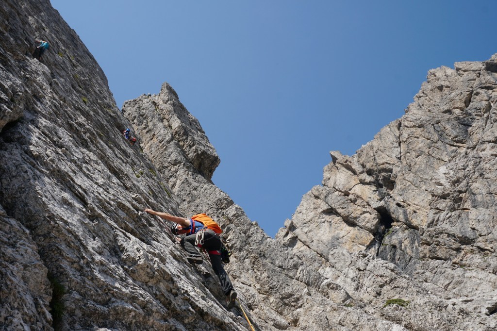 Ker sva s Petrom slabo vplezana, smo si izbrali lažjo smer po razu. Prva dva raztežaja sta mi bila prav všeč, tretji je bolj položen, tisti detajl smo očitno obhodili (?!). Na polici je Džani zavil v desno smer, tako da smo splezali kombinacijo in s tem prehiteli dve navezi v platah ter se hkrati izognili počasni navezi na razu pred nami. Drugih navez ta dan k sreči ni bilo. Smer po platah je bolj strma in na trenutke precej gladka, tako da je bilo treba nekaj več premisleka in truda. Kljub temu smo brez težav zmogli še tiste tri raztežaje do vrha, ki je precej ozek in prepaden. Naslednjič bomo morali splezati spodnjo polovico po platah in zgoraj po razu …