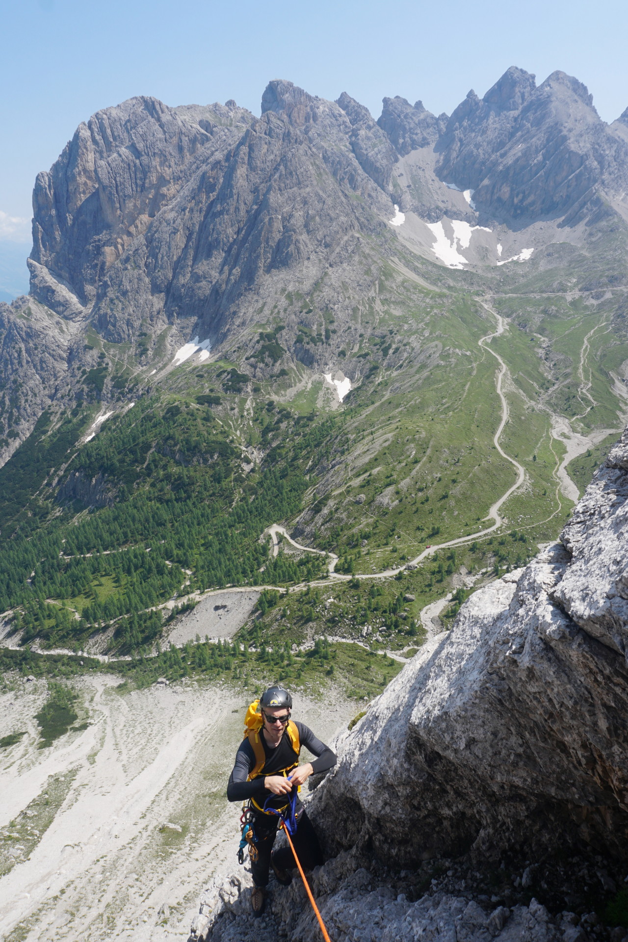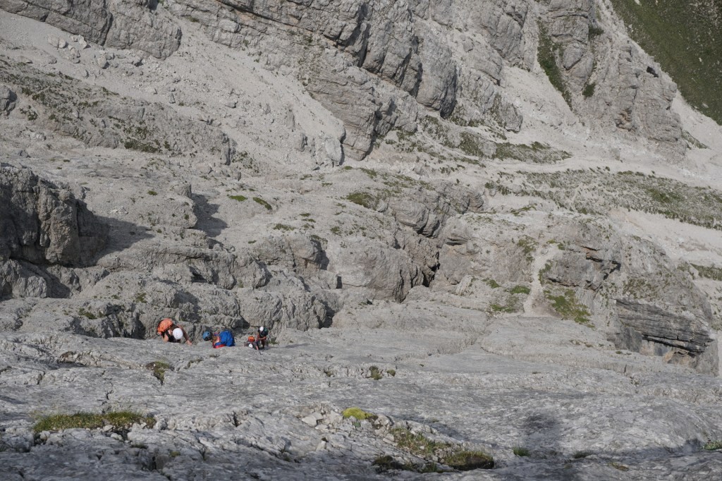 Z vrha smo sestopili po zelo strmi poti na sedlo Kerschbaumertörl, nato pa bolj udobno po markirani poti proti koči, ki smo se ji spet izognili, saj so nas malce prestrašili črni oblaki, da smo jo ucvrli navzdol. Do izhodišča nas je nato grelo sonce, zato se nismo mogli upreti pivu in malici na terasi pri Dolomitenhütte, ki stoji na vrhu prepadne pečine z več kot odličnim razgledom na najvišje vrhove Lienških Dolomitov.