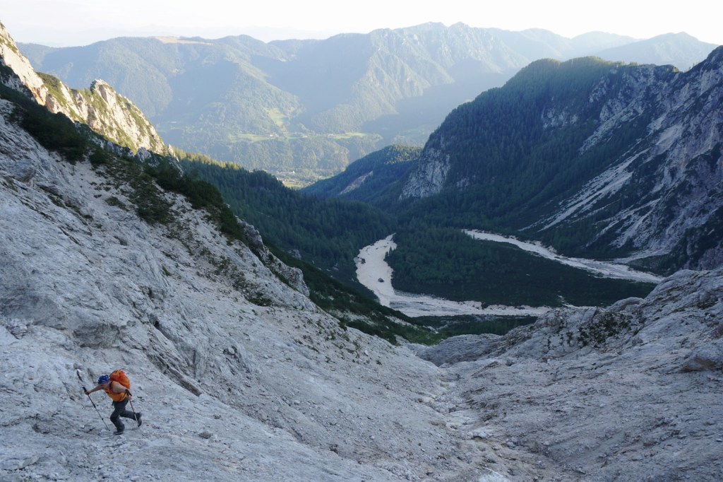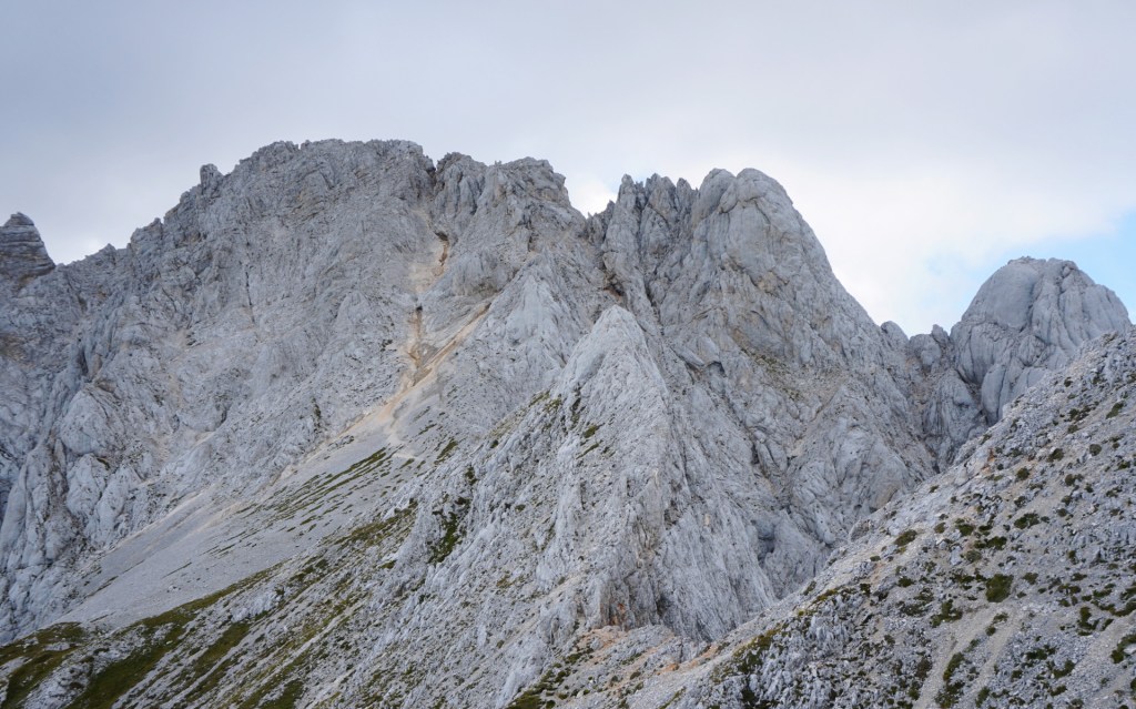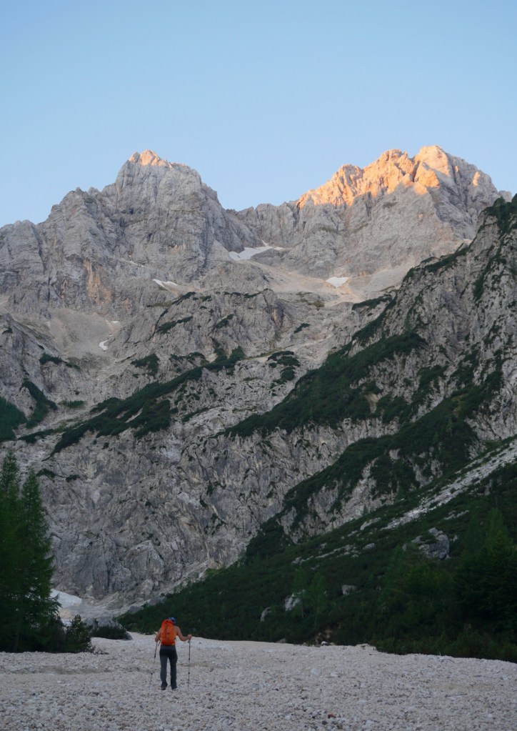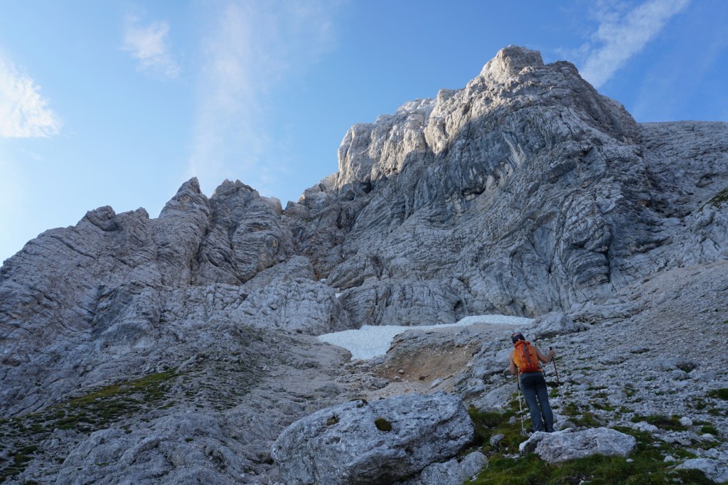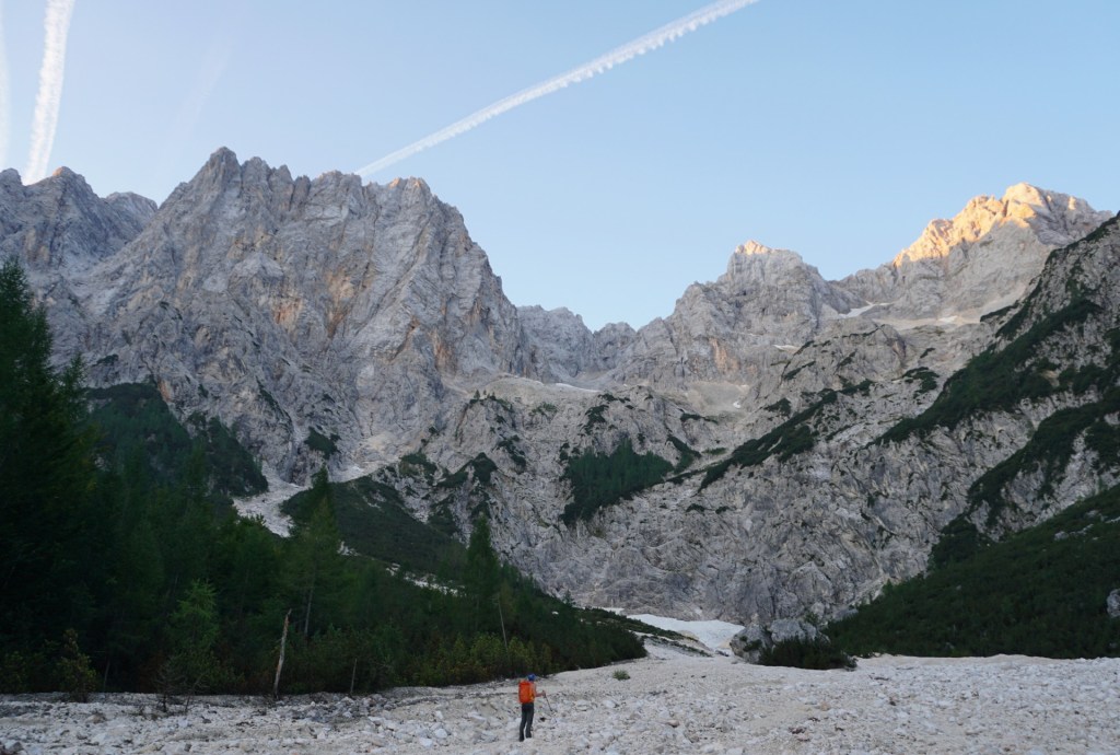 Ker sva si obetala celodnevno turo, sva s hojo začela v temi in dosegla krnico Za Akom, ko je sonce obsijalo mogočne vrhove nad tem edinstvenim amfiteatrom. Nazadnje sva bila tu konec maja, ko je bil vzpon v snegu precej bolj udoben, tokrat pa naju je čakala naporna hoja po obsežnih meliščih. Namenila sva se proti trem macesnom in še pod njimi zavila desno na stezico, ki preči pod skokom in se za macesnovim gozdičem izgubi v skrotju. Tam sva bila ravno v vpadnici Malega Oltarja in v iskanju najboljših prehodov sva se vzpenjala po skrotju, preko nezahtevnega skalnega skoka in višje po zoprnem melišču, kjer sva dosegla stezico od treh macesnov. Mislim, da se bolj splača dostop mimo treh macesnov, sva pa vsaj spoznala še drugi prehod.