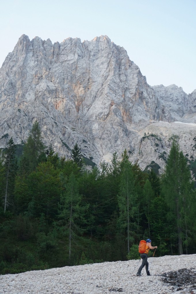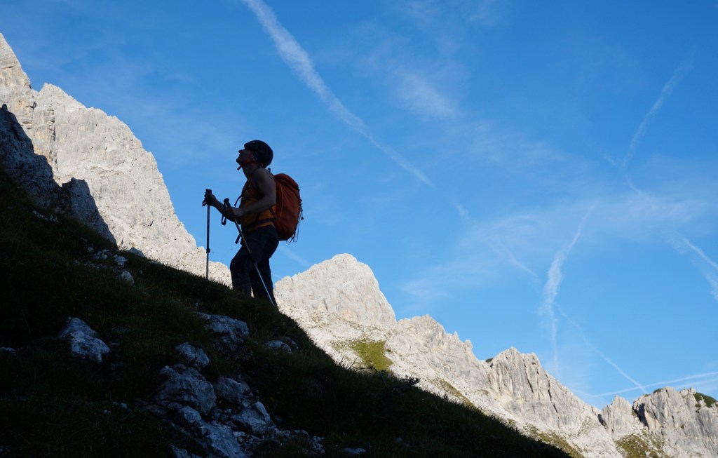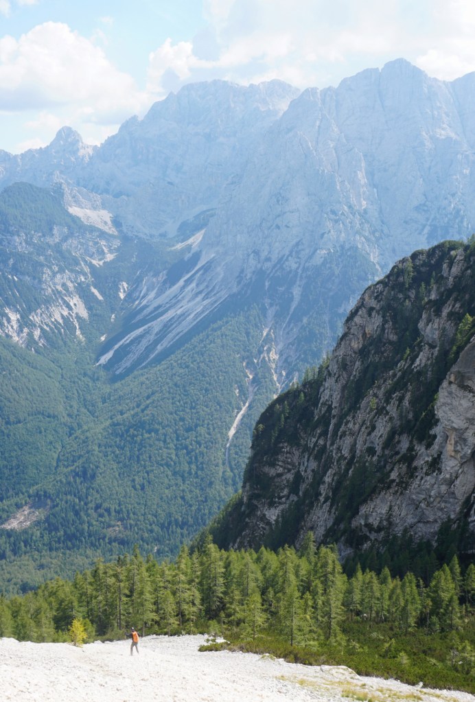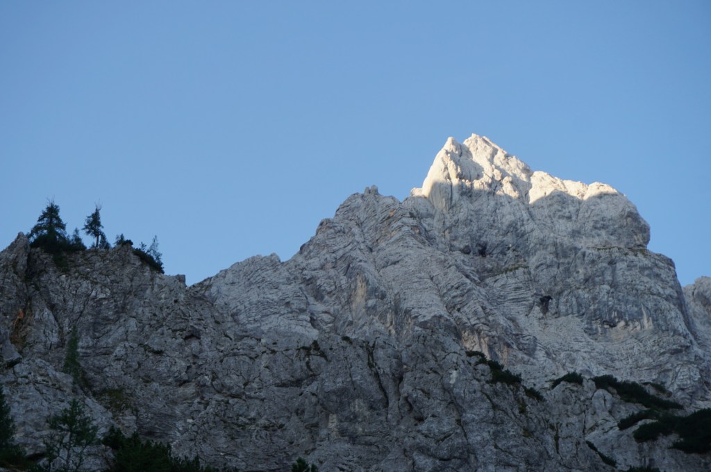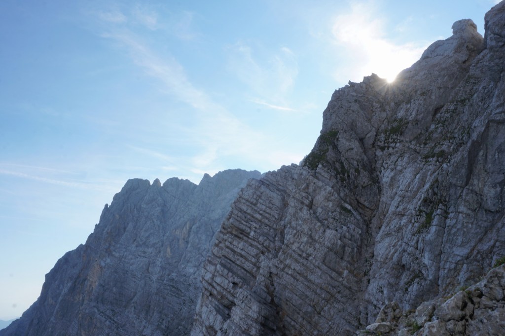 Ker sva si obetala celodnevno turo, sva s hojo začela v temi in dosegla krnico Za Akom, ko je sonce obsijalo mogočne vrhove nad tem edinstvenim amfiteatrom. Nazadnje sva bila tu konec maja, ko je bil vzpon v snegu precej bolj udoben, tokrat pa naju je čakala naporna hoja po obsežnih meliščih. Namenila sva se proti trem macesnom in še pod njimi zavila desno na stezico, ki preči pod skokom in se za macesnovim gozdičem izgubi v skrotju. Tam sva bila ravno v vpadnici Malega Oltarja in v iskanju najboljših prehodov sva se vzpenjala po skrotju, preko nezahtevnega skalnega skoka in višje po zoprnem melišču, kjer sva dosegla stezico od treh macesnov. Mislim, da se bolj splača dostop mimo treh macesnov, sva pa vsaj spoznala še drugi prehod.