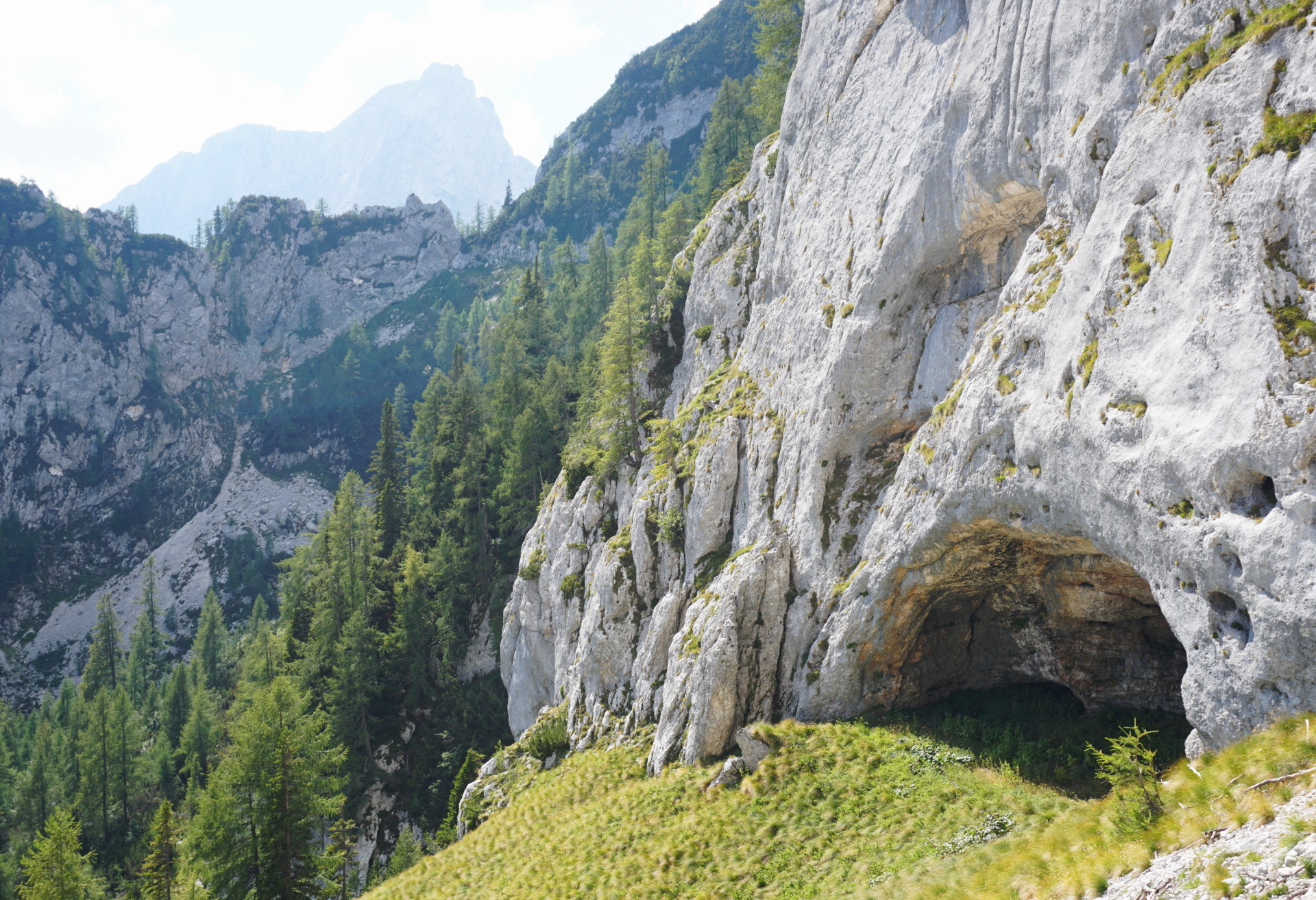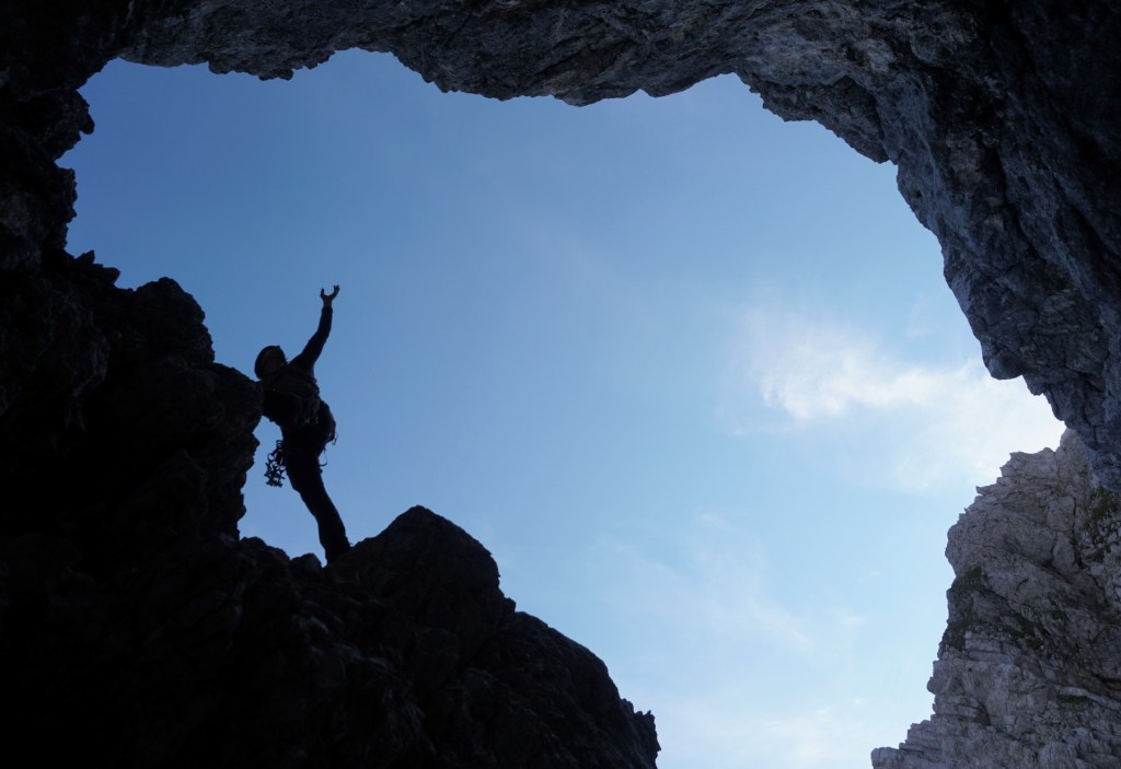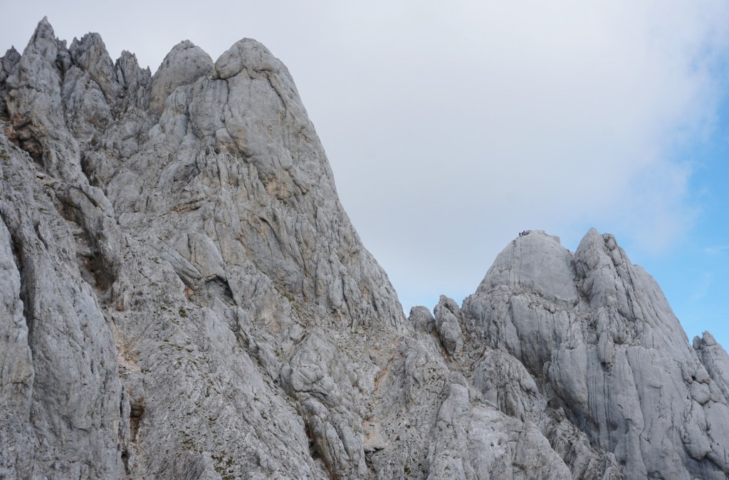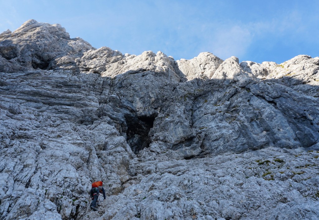 Tudi po stezici vzpon ni bil dosti bolj udoben do travnate terase, na kateri sva zavila proti steni in v lažjem poplezavanju dosegla dobro vidno votlino, kjer se začne smer. Nad votlino sva se varovala na izpostavljeni prečki, nato pa spet lažje do osrednjega dela stene, ki je čudovito razčlenjena in je plezanje izredno lepo. Varovala sva se še zadnji raztežaj po krasnem razu in kar prehitro sva bila na vrhu.