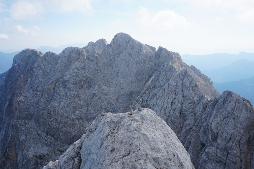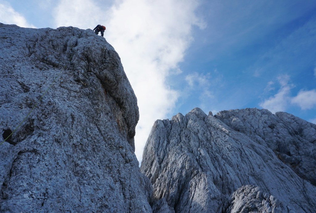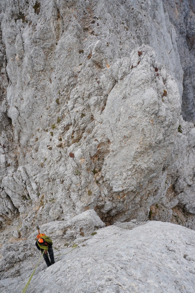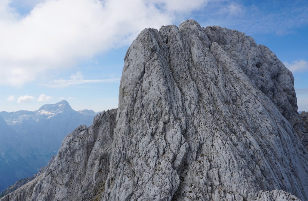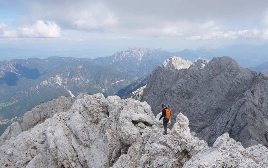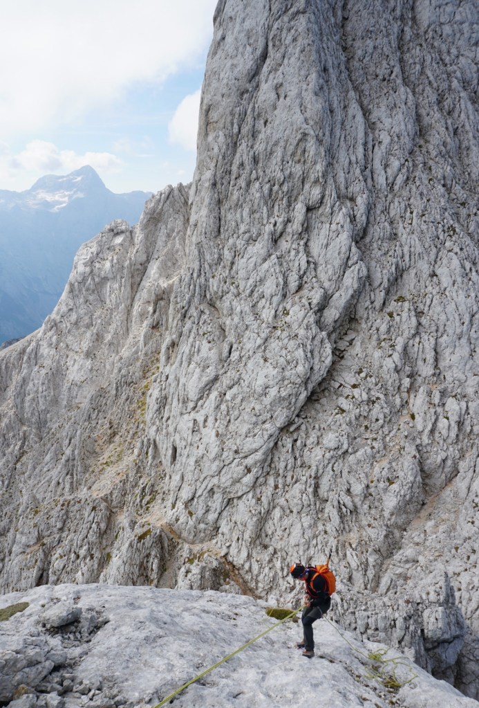 Spustila sva se do škrbine, od koder bi se lahko vrnila Za Ak. Ampak ker sva bila na vrhu bistveno bolj zgodaj od pričakovanj in sva imela možnost prevoza v Vratih, sva turo podaljšala. Mihelič namreč vabi k nadaljevanju s škrbine po 150 metrov visokem stebru, ki ponuja prijetno plezanje v dobri skali (III). To sicer drži, pozabi pa omeniti, da steber pripelje zgolj na prvi stolp v precej dolgem grebenu, ki se nadaljuje na Veliki Oltar. Prečenje ni posebno zahtevno (čeprav sva se vmes še trikrat spustila po vrvi), vendar je skala tu zelo krušljiva, tako da je napredovanje bolj počasno in nič kaj prijetno.