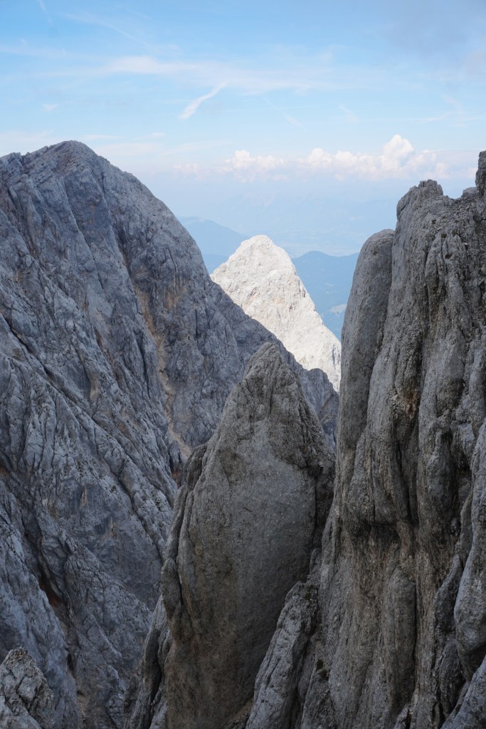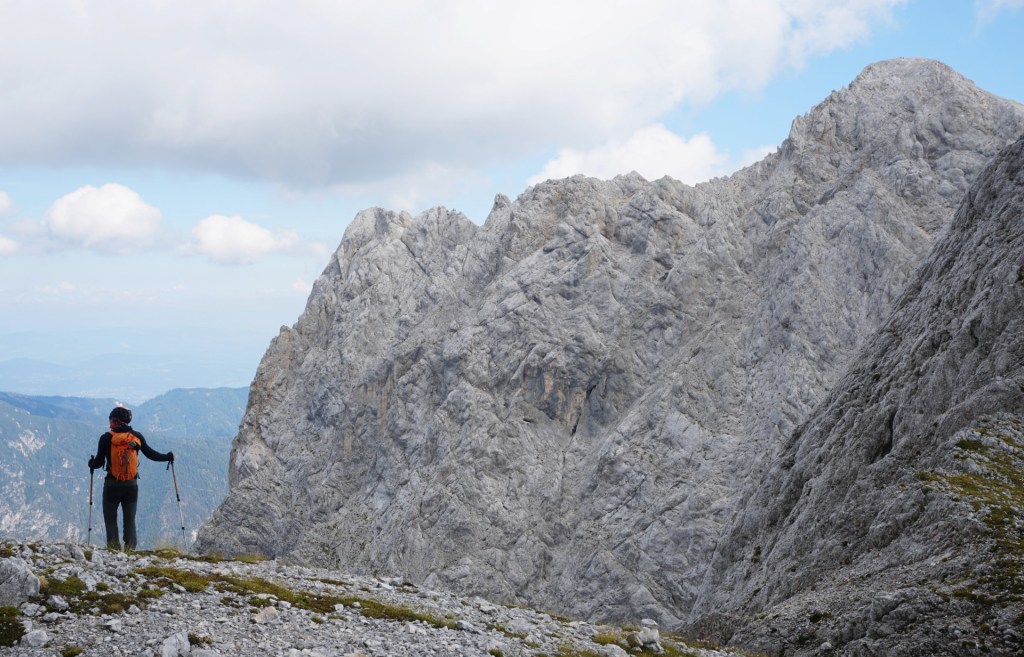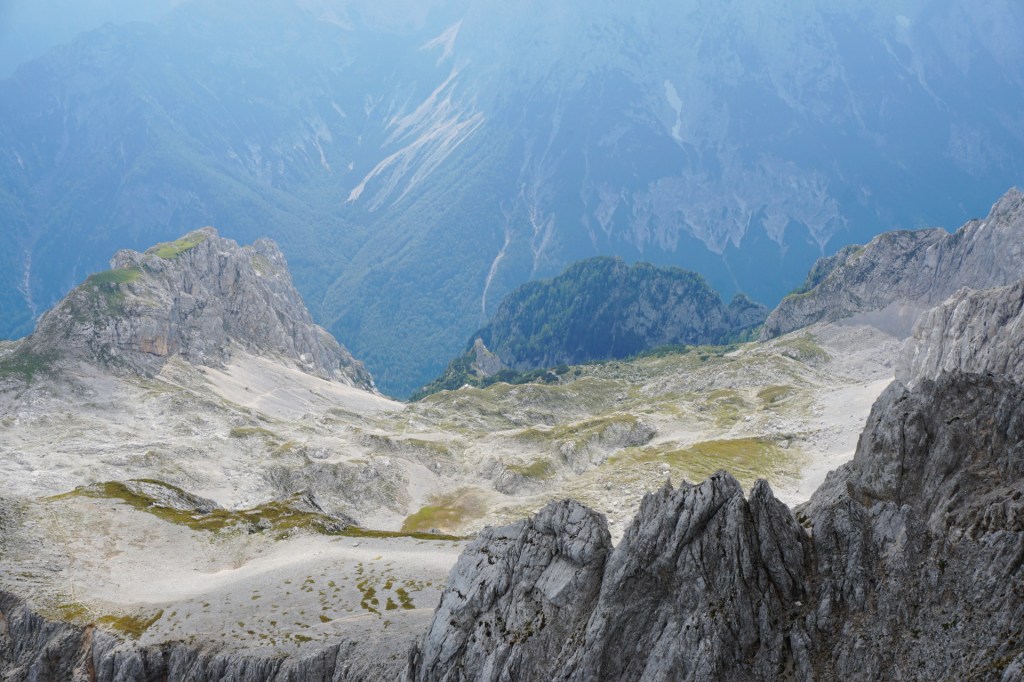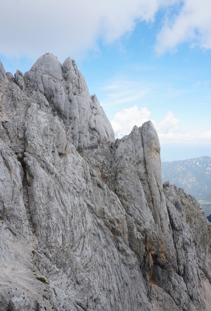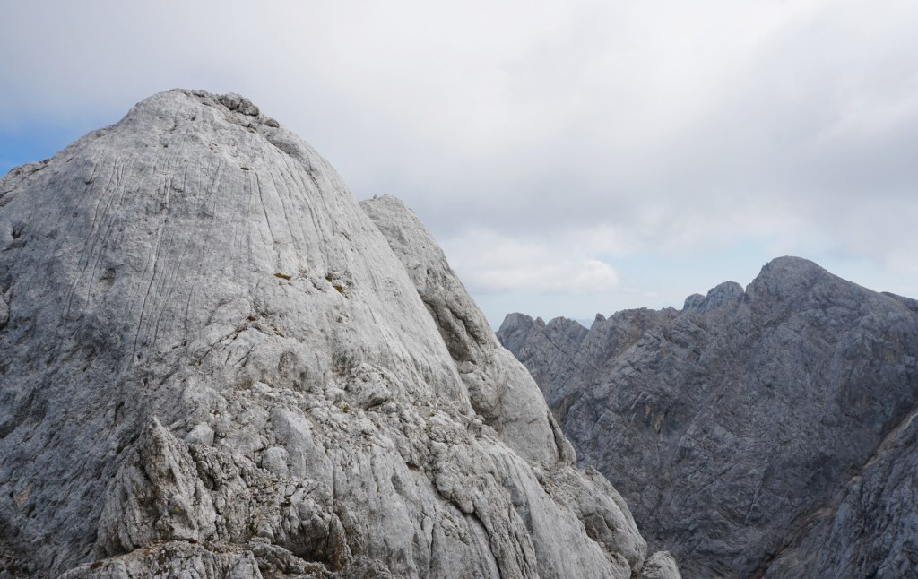 Spustila sva se do škrbine, od koder bi se lahko vrnila Za Ak. Ampak ker sva bila na vrhu bistveno bolj zgodaj od pričakovanj in sva imela možnost prevoza v Vratih, sva turo podaljšala. Mihelič namreč vabi k nadaljevanju s škrbine po 150 metrov visokem stebru, ki ponuja prijetno plezanje v dobri skali (III). To sicer drži, pozabi pa omeniti, da steber pripelje zgolj na prvi stolp v precej dolgem grebenu, ki se nadaljuje na Veliki Oltar. Prečenje ni posebno zahtevno (čeprav sva se vmes še trikrat spustila po vrvi), vendar je skala tu zelo krušljiva, tako da je napredovanje bolj počasno in nič kaj prijetno.