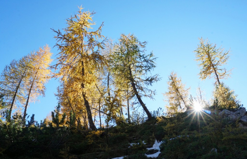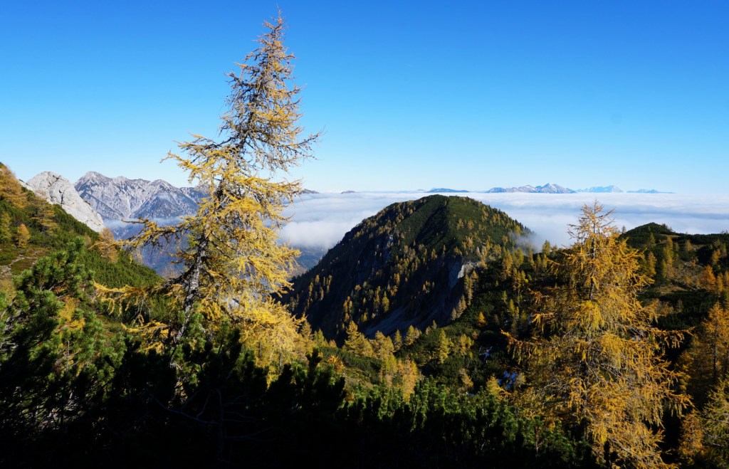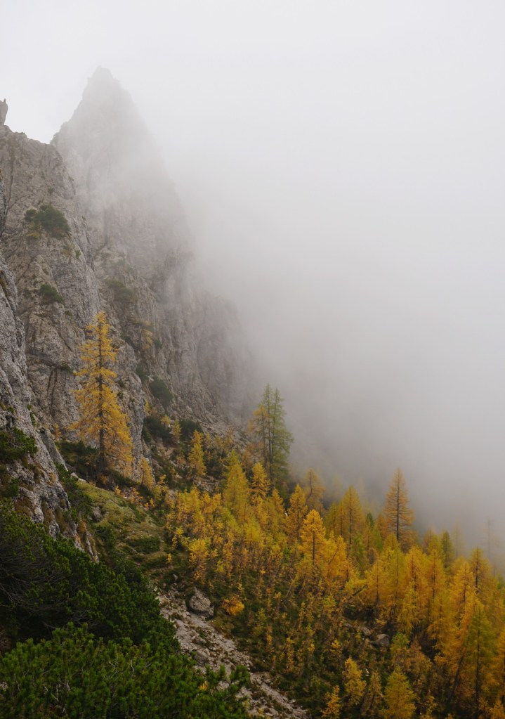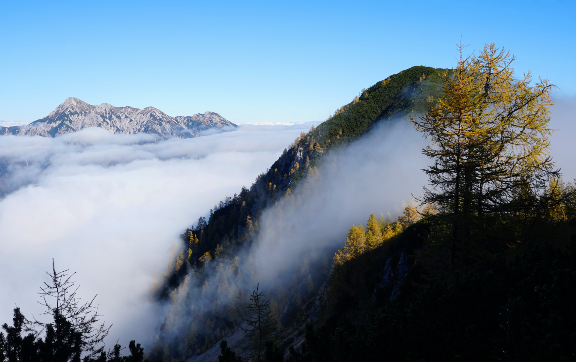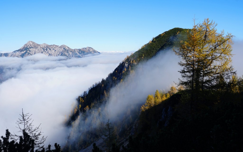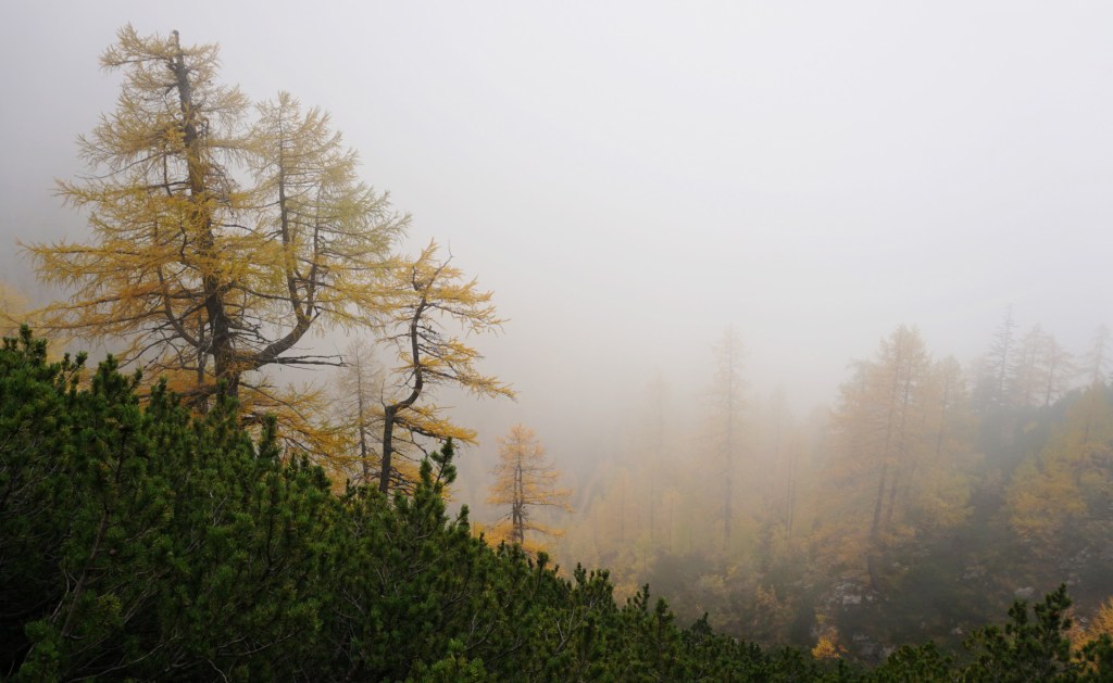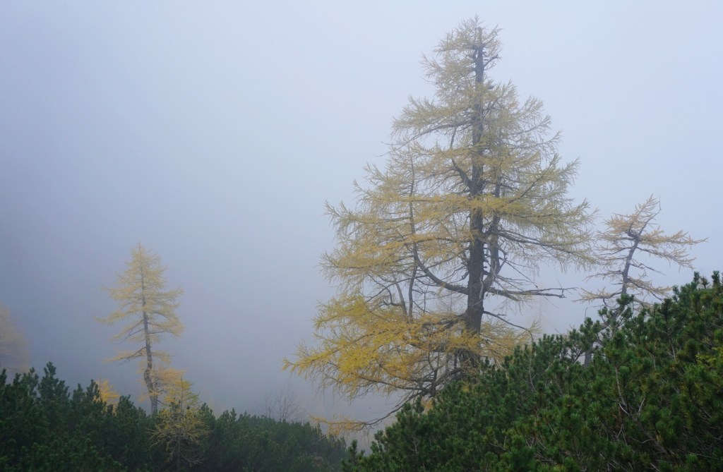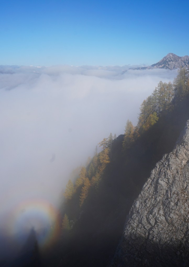 Že pri Peričniku me je pričakalo sonce in ponovno sem bil navdušen nad tem biserom med našimi slapovi. Višje sem spet hodil v megli, a na zgornjem robu Njivic je prišla nagrada v obliki prave eksplozije barv: znašel sem se nad belim morjem megle, zgoraj sinje modro nebo s čistimi in daljnosežnimi razgledi. Vse naokoli pa so med zelenim ruševjem štrleli zlati macesni, ki so bili tam na robu oblakov odeti v ivje, da niso le žareli, temveč so se še lesketali in žvenketali v vetru. Ko sem pogledal čez rob, pa je mojo senco objela še glorija. Po vsem tem se sploh ne spomnim hoje do vrha, morda sem kar lebdel, kot v sanjski pokrajini, ki se ne zdi s tega sveta.