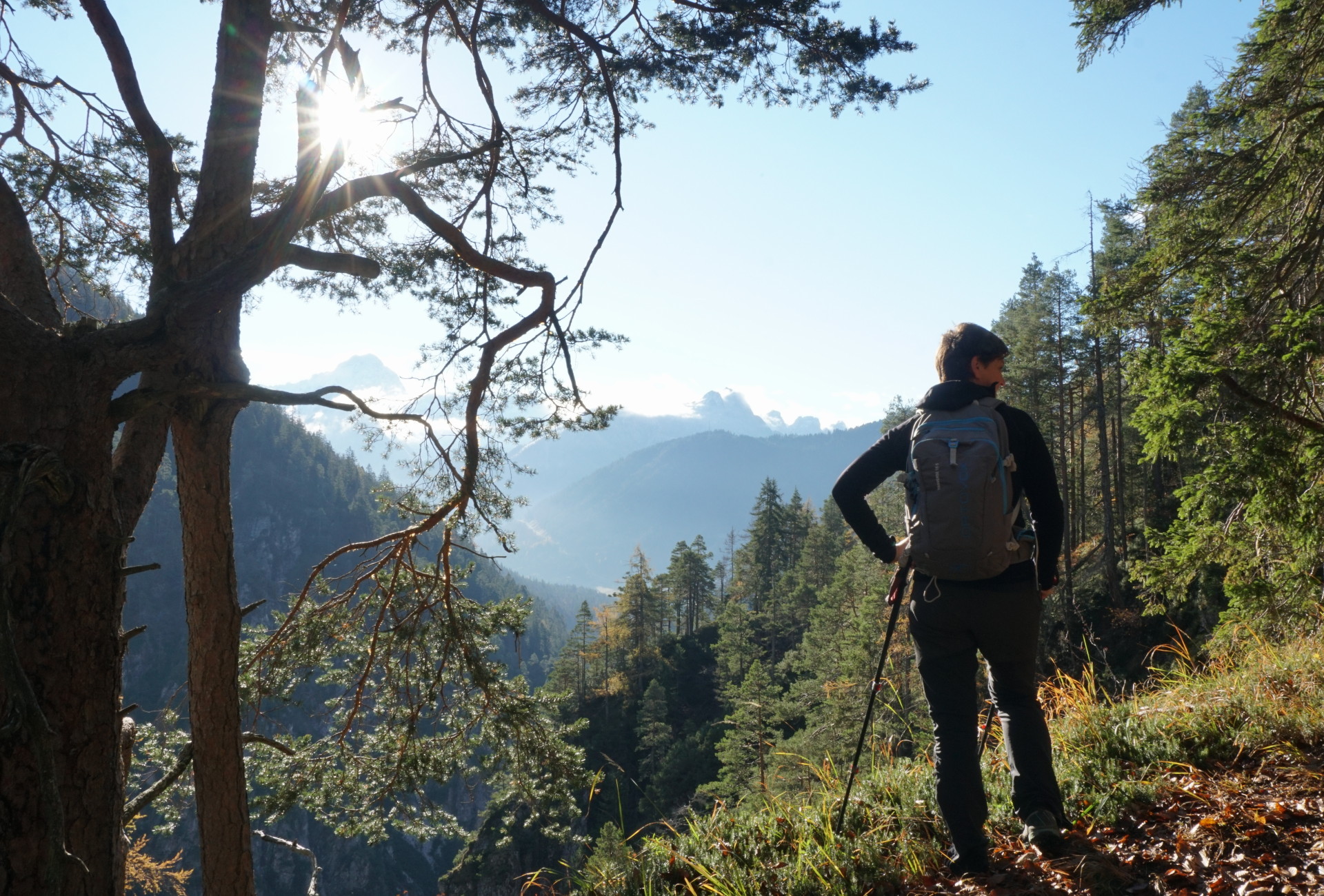 Mi smo parkirali v zgornjem delu soteske, blizu manjšega plezališča na okoli 950 m. Na vzhod se vzpenja pot po široki mulatjeri proti Velikemu Kopinju in Gorjanskemu vrhu, takoj na drugi strani ceste pa druga mulatjera vodi na zahod. Najprej se v lepih okljukih vzpne preko zelo strmega gozdnatega pobočja med krušljivimi stenami in grapami na obeh straneh. Strmina se kmalu unese in pot sčasoma pripelje na razgledno jaso, kjer stoji gozdarska koča pod Mulejevim vrhom (Rif. Forestale Cima Muli, 1495 m). Pri koči je postanek nujen, saj je razgled tja čez na Zahodne Julijce res čudovit. Sveže zasneženi vrhovi so se zdeli skoraj pravljični.