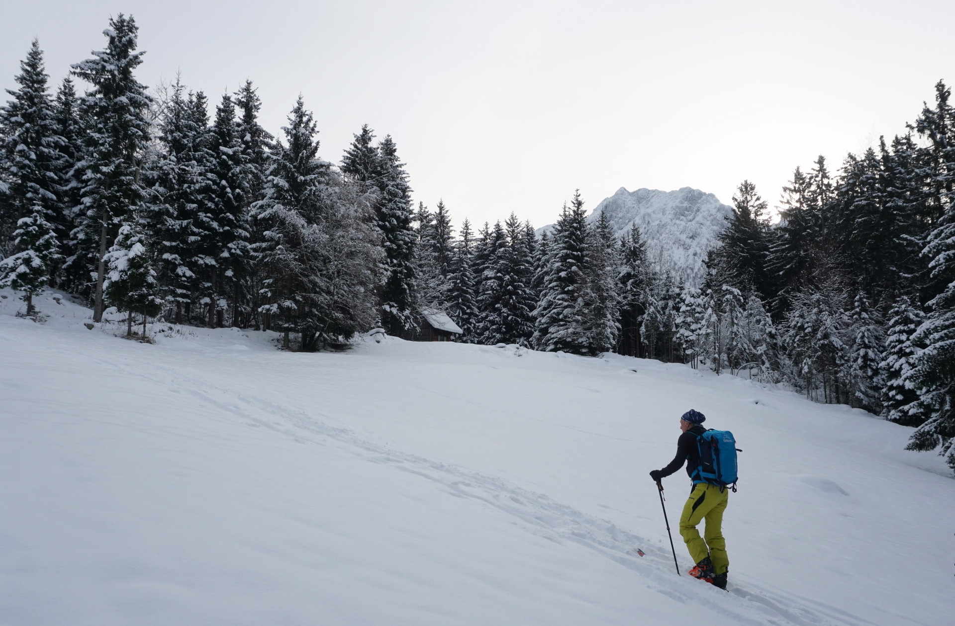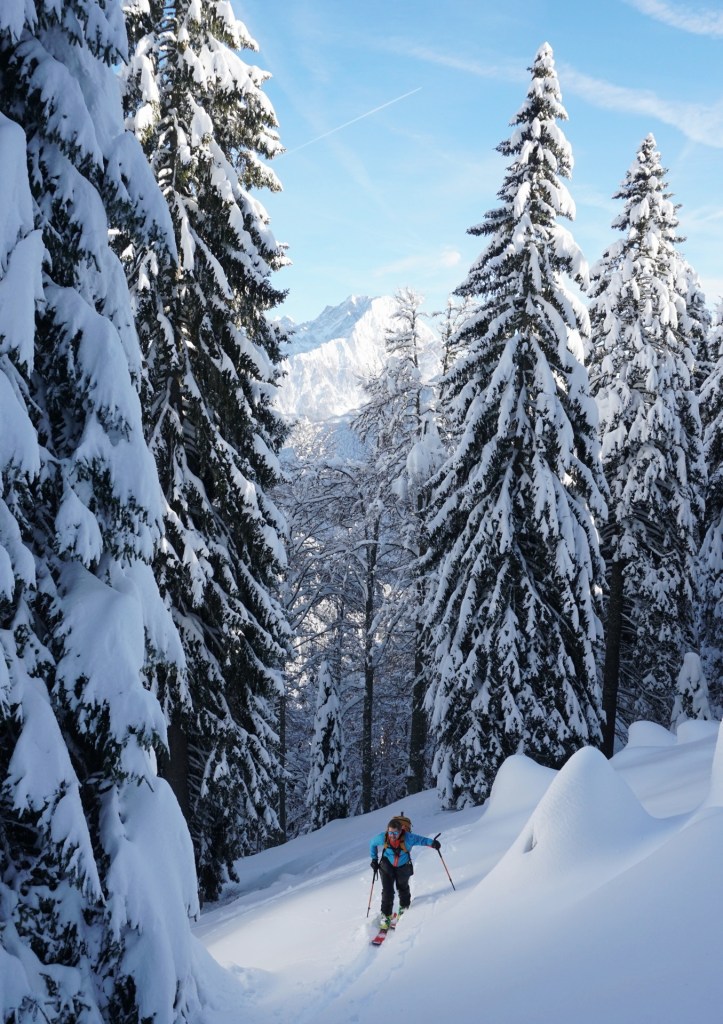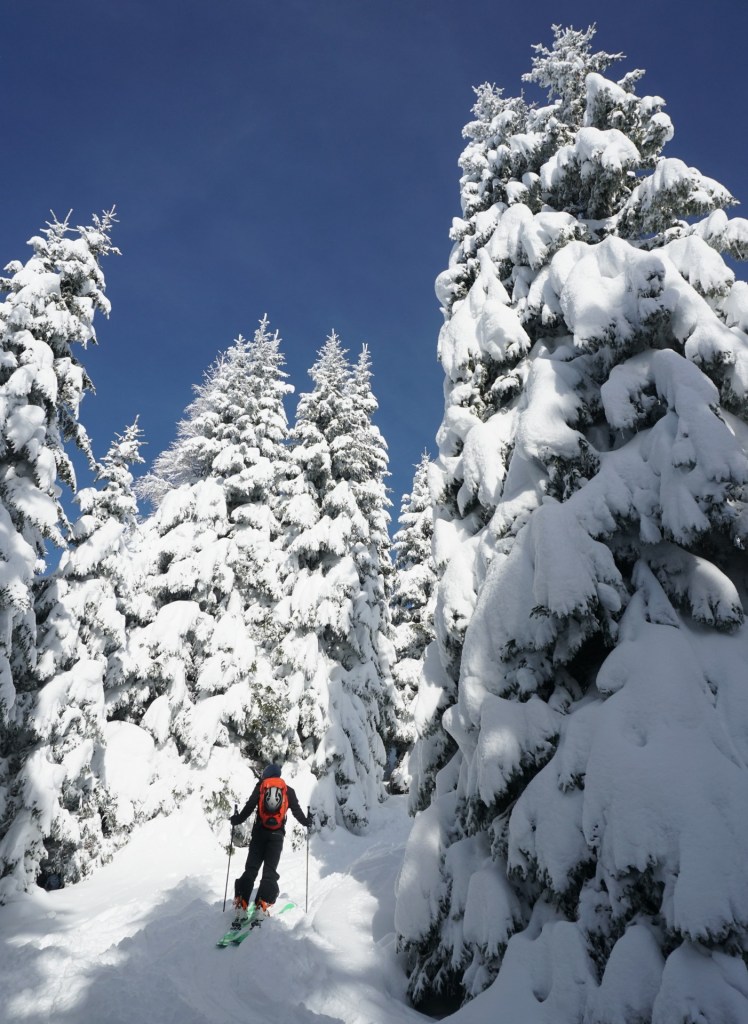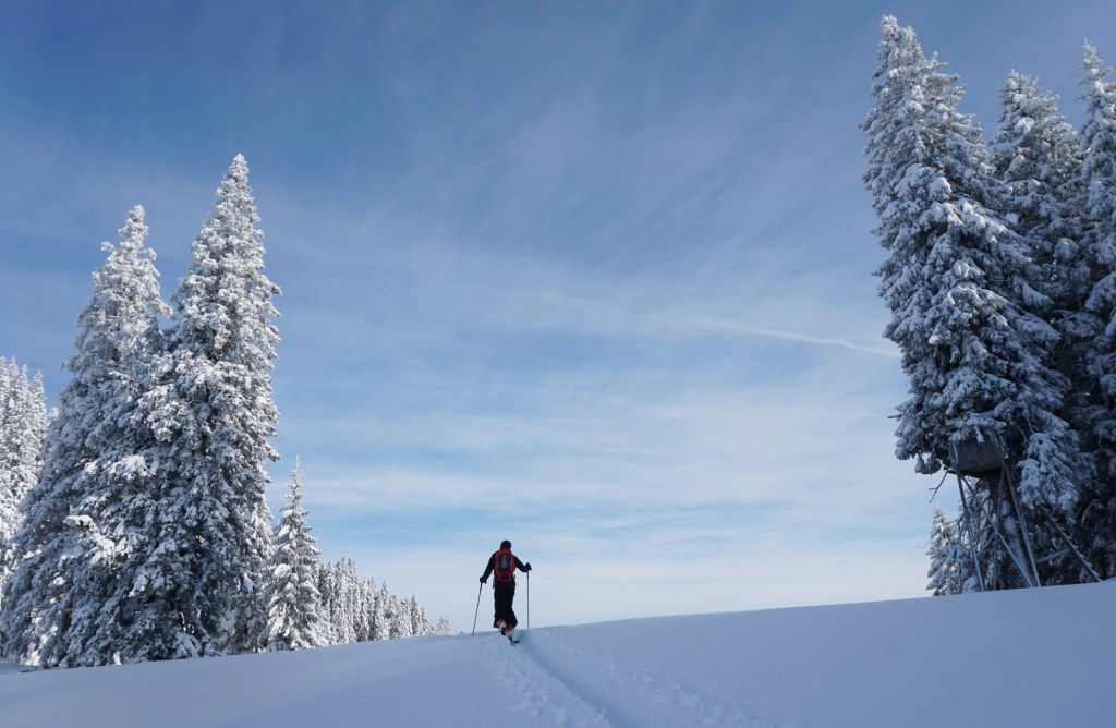 Tako smo se tudi hitro strinjali, da bo le en spust premalo. Prvič smo smučali skozi pršičast gozd na sever in se z nasmeški na obrazih povzpeli do planine Javornik in ponovno na vrh. Drugi spust na drugo stran po še nedotaknjeni strmi poseki, ki se nižje zapre v graben, tam smo izstopili in si privoščili nekaj gaženja skozi strm gozd prečno do gazi z Javorniškega prevala ter po njej še tretjič na vrh. Za konec smo odsmučali po nekoliko zvoženih posekah, kjer se je še vedno našlo dovolj pršiča vse do ceste in po njej mimo Doma pod Storžičem vse do doline. Ni slabo za začetek.