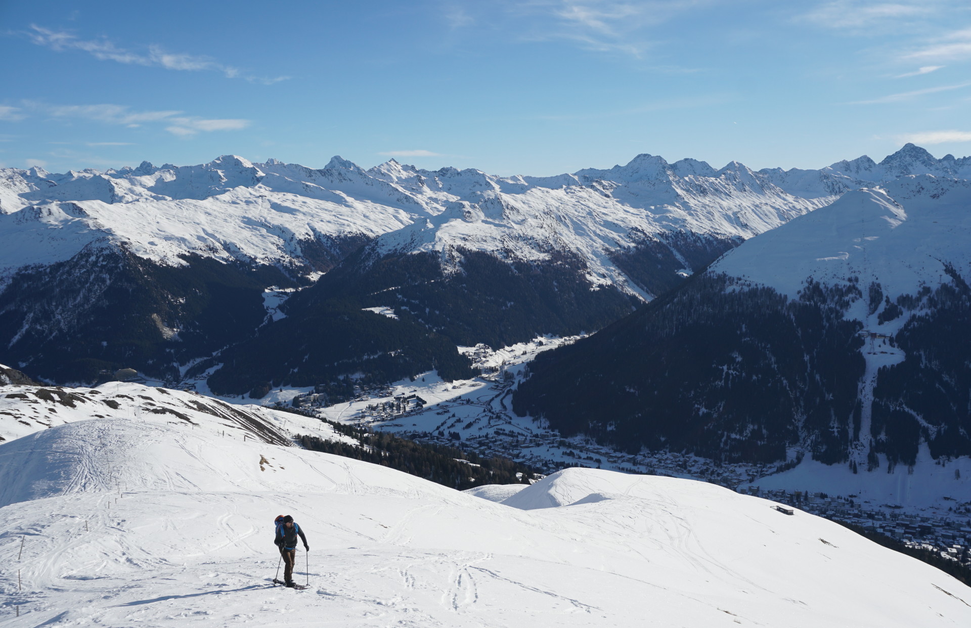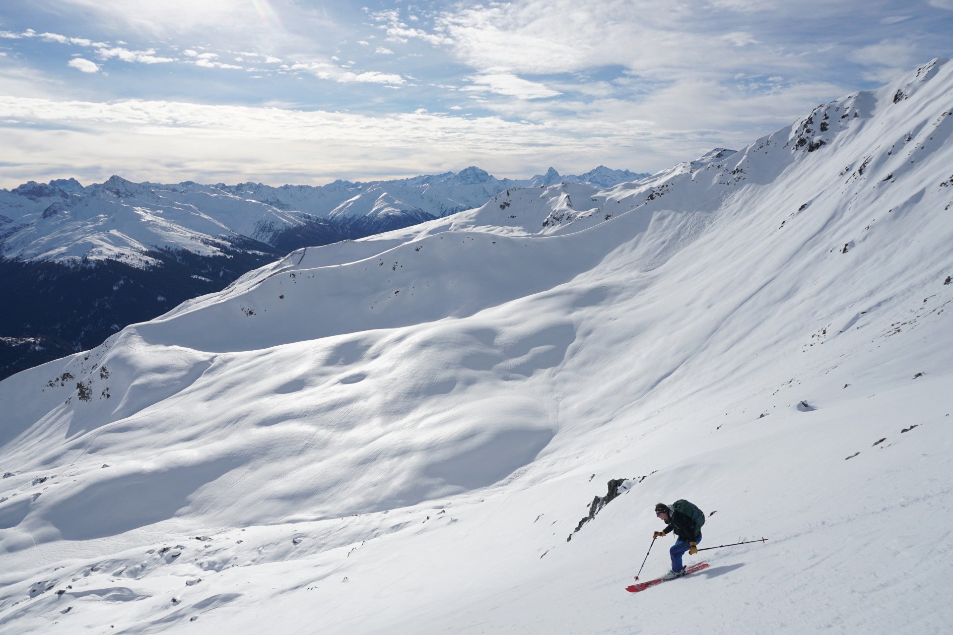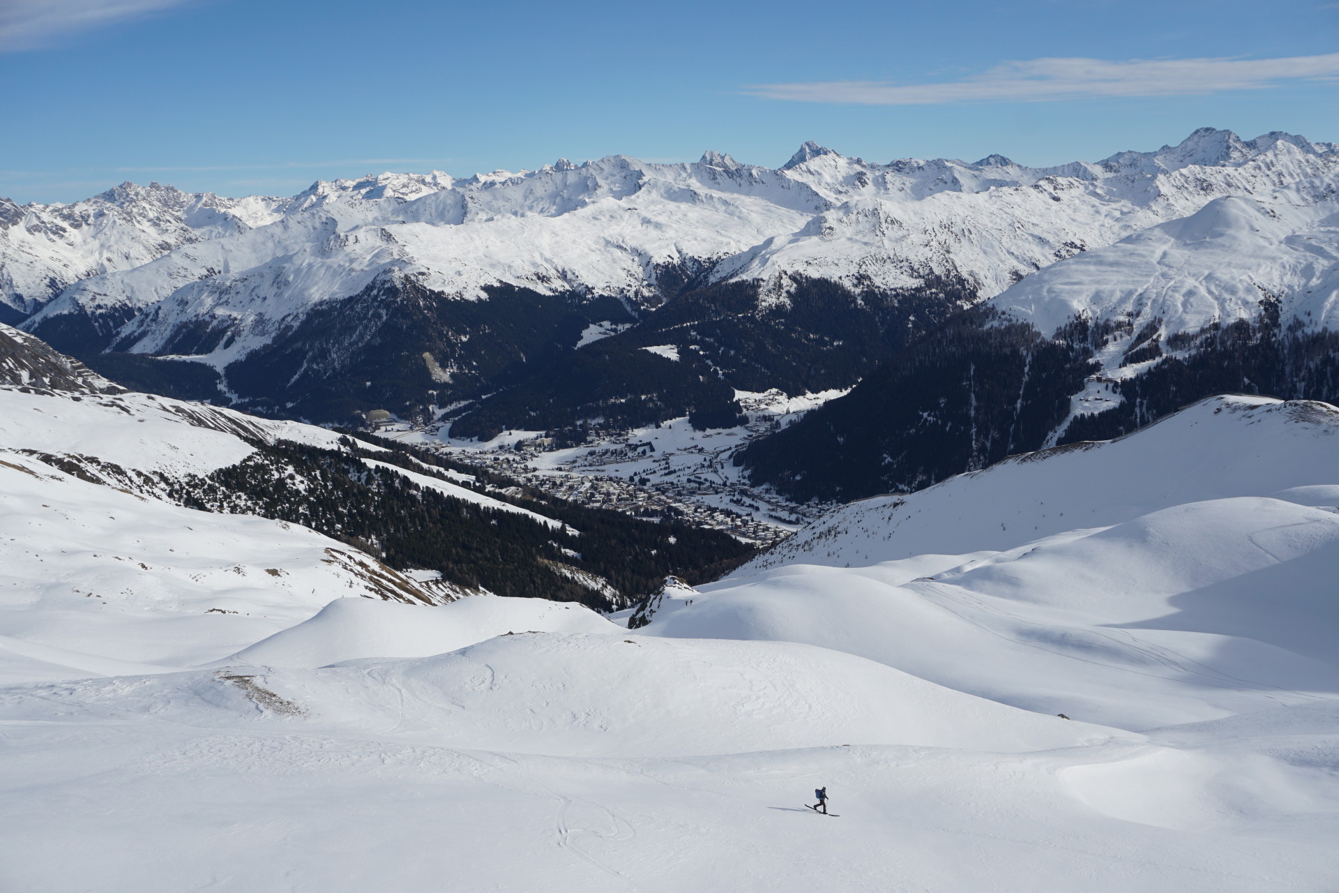 Spustili smo se naravnost navzdol, vmes se je bilo treba malo povzpeti čez rob in nato preko širnih pobočjih v še suhem snegu uživaško do bolj strmega pobočja, kjer so bile razmere slabše in tudi snega je že primanjkovalo nižje skozi gozd vse do ceste v vasi Frauenkirch. Vseeno smo bili zadovoljni, predvsem smo si dobro ogledali okolico, med drugim tudi sosednjo dolino, kjer smo bili pred tremi leti v Langwiesu.