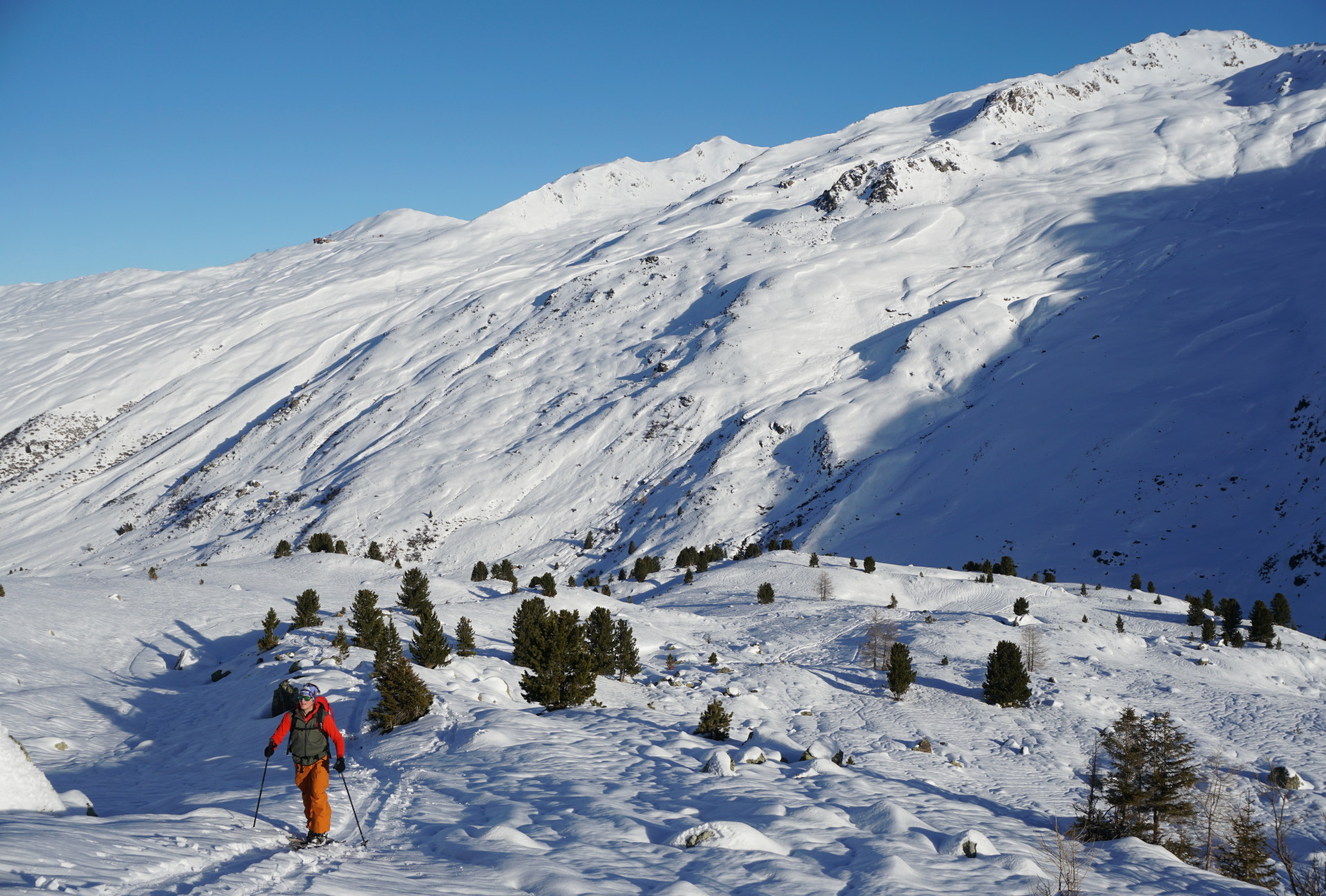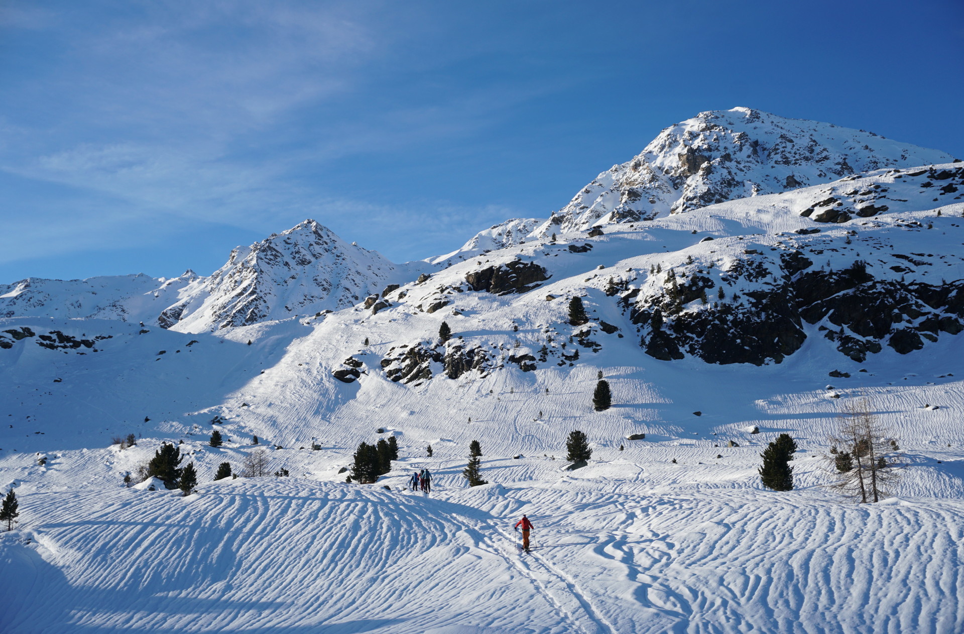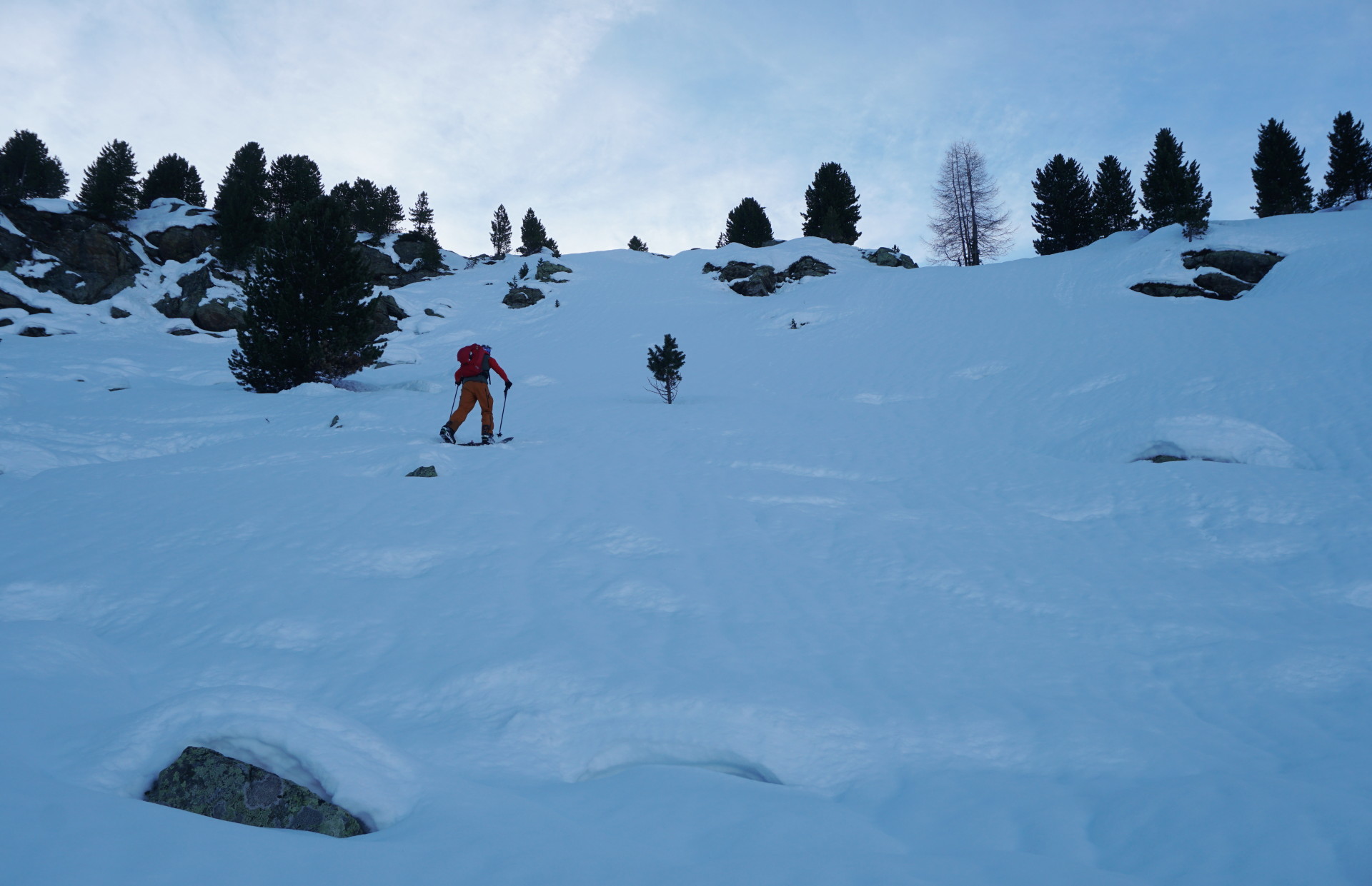 Spustili smo se naravnost navzdol, vmes se je bilo treba malo povzpeti čez rob in nato preko širnih pobočjih v še suhem snegu uživaško do bolj strmega pobočja, kjer so bile razmere slabše in tudi snega je že primanjkovalo nižje skozi gozd vse do ceste v vasi Frauenkirch. Vseeno smo bili zadovoljni, predvsem smo si dobro ogledali okolico, med drugim tudi sosednjo dolino, kjer smo bili pred tremi leti v Langwiesu.