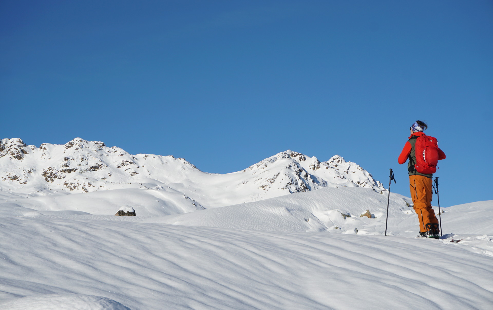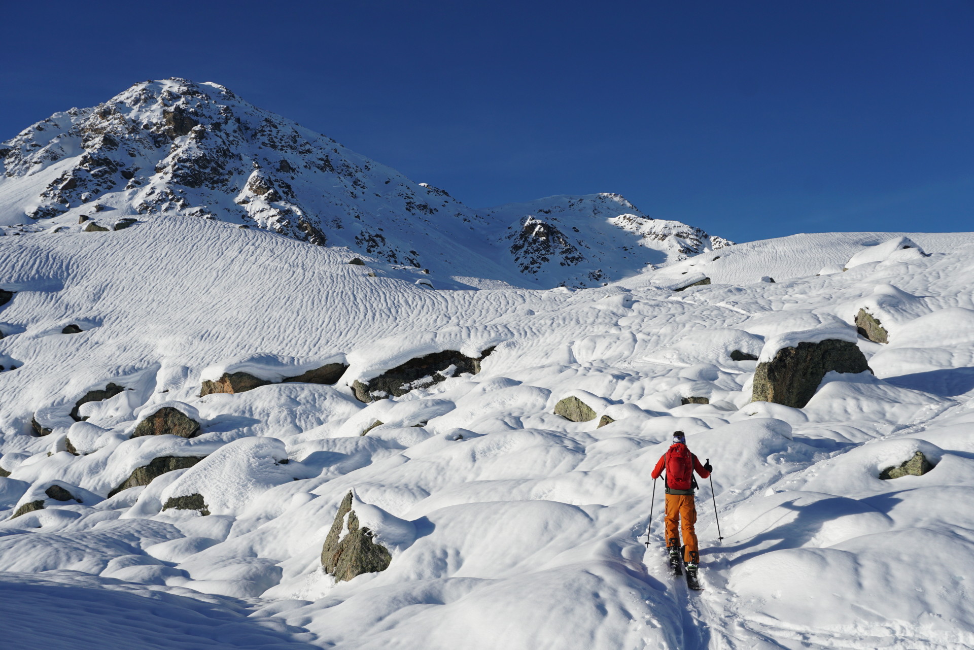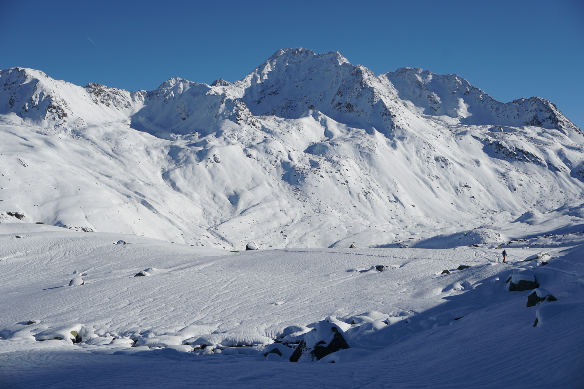Po dnevu sneženja in celi noči dežja so sledili trije čudovito sončni in izredno topli dnevi. Od smučanja si nismo dosti obetali, a saj sem že večkrat napisal, da je turna smuka mnogo več kot le smuka. Izhodišče je pred zapornico na cesti proti Flüelapass na okoli 1950 m. Cesta je bila sicer delno splužena in povsem ledena, a je čez zimo praviloma zaprta za promet. Tako smo šli kratek čas po cesti, nato pa okoli strmejšega dela na obširen plato. Prvotni cilj je bil sicer izraziti Sentisch Horn (2827 m), a je bil zgornji del spihan in nas je premamila dolinica do sedla tik pod Baslersch Chopfom. Imena so res težka za izgovorjavo, kaj šele za spomin, v tem delu Švice govorijo tudi retoromansko, kot da ni že švicarska nemščina dovolj nerazumljiva.