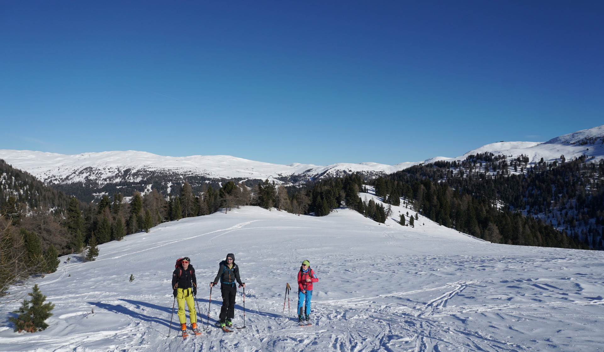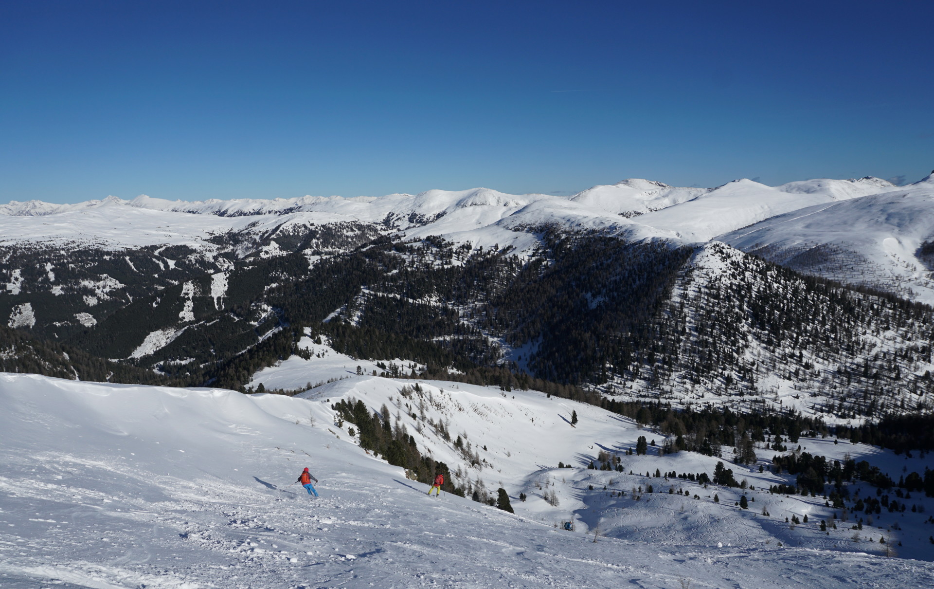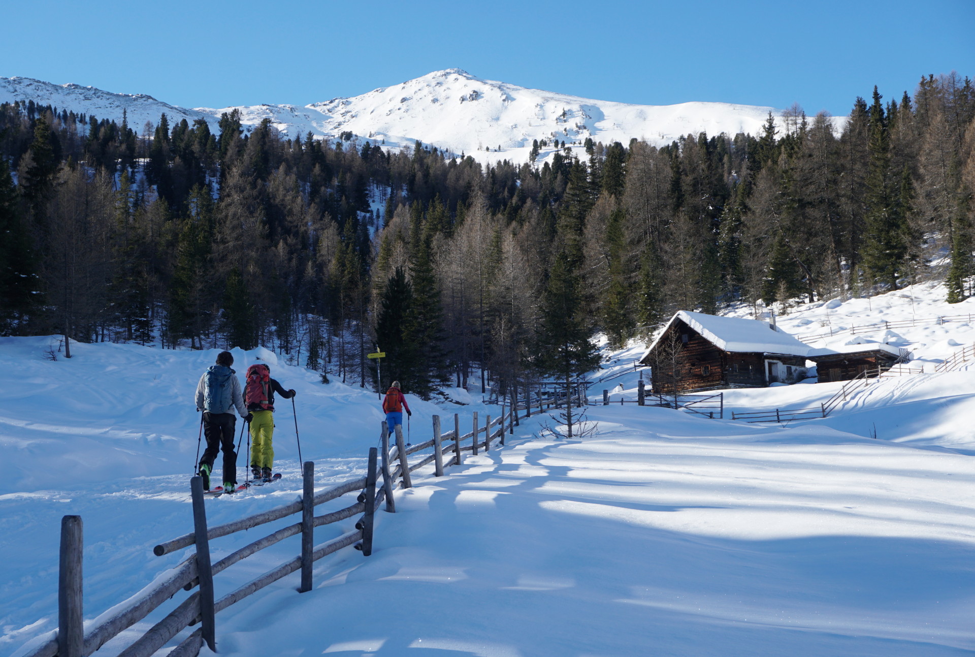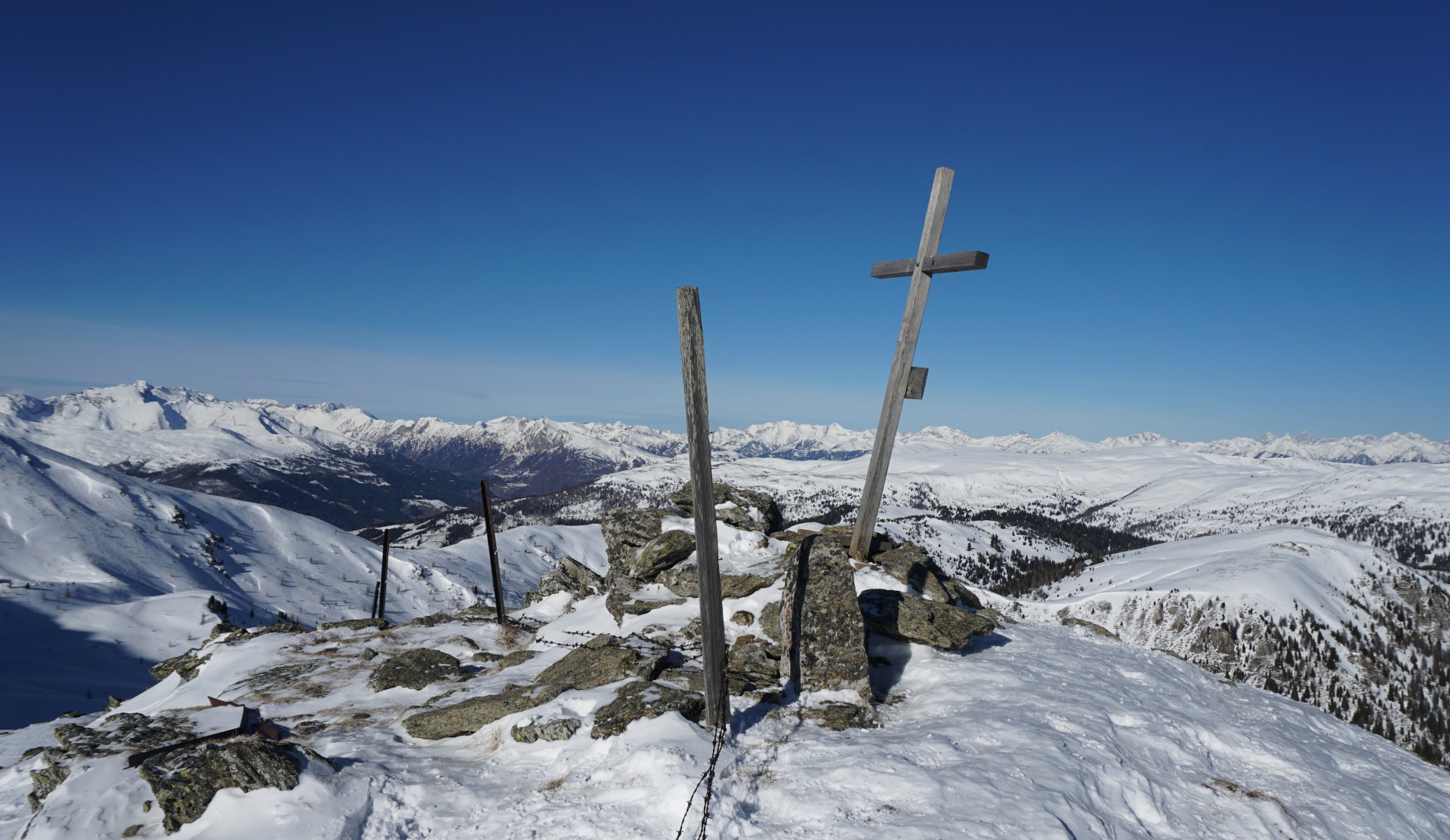 Izbrali smo si Peitlernock, ki naj bi bil manj obljuden – kakšna gneča mora biti potem šele na bolj znanih vrhovih?! Kakorkoli, po dolgem času nas je na izhodišču zeblo in tudi dovoljšna količina snega nas je razveselila, ko smo zakorakali po lepo ratrakirani cesti. Nato skozi gozd do planine Bärengrubenalm in po širokem hrbtu do vetrovnega vrha, vzpon je udoben in nenaporen. Tudi razgled z vrha seže daleč, skratka ni tako slabo kot se morda zdi iz uvoda.
